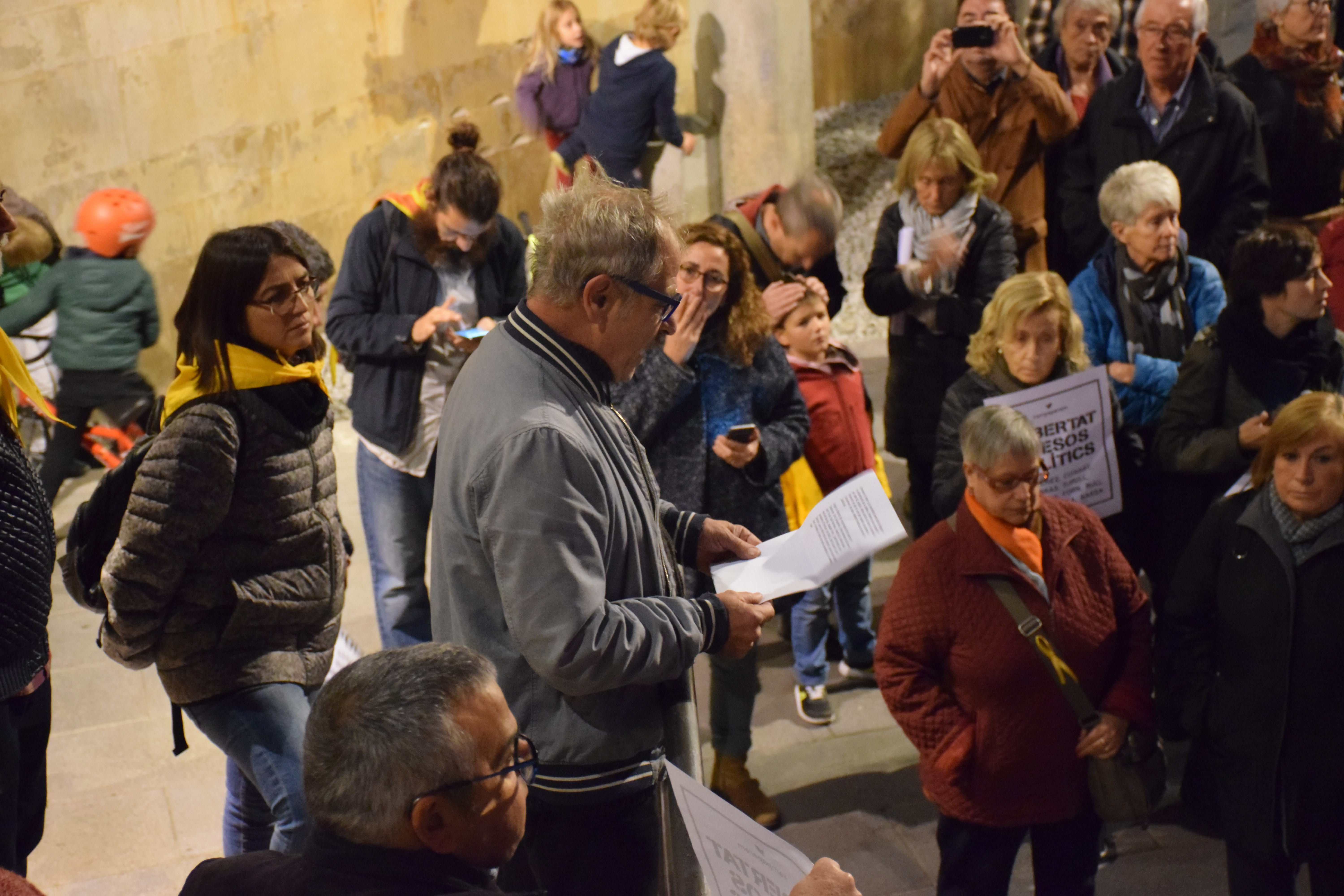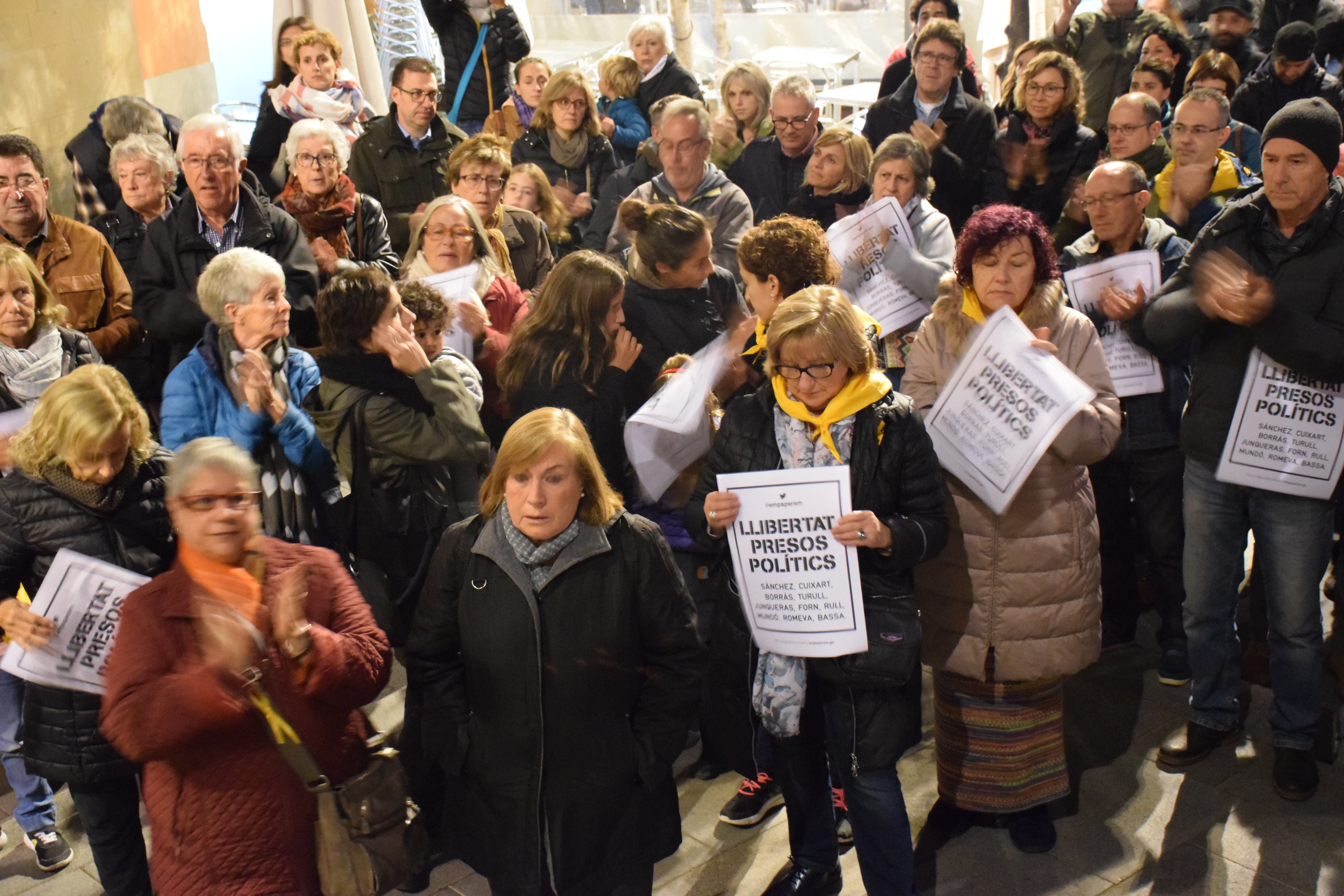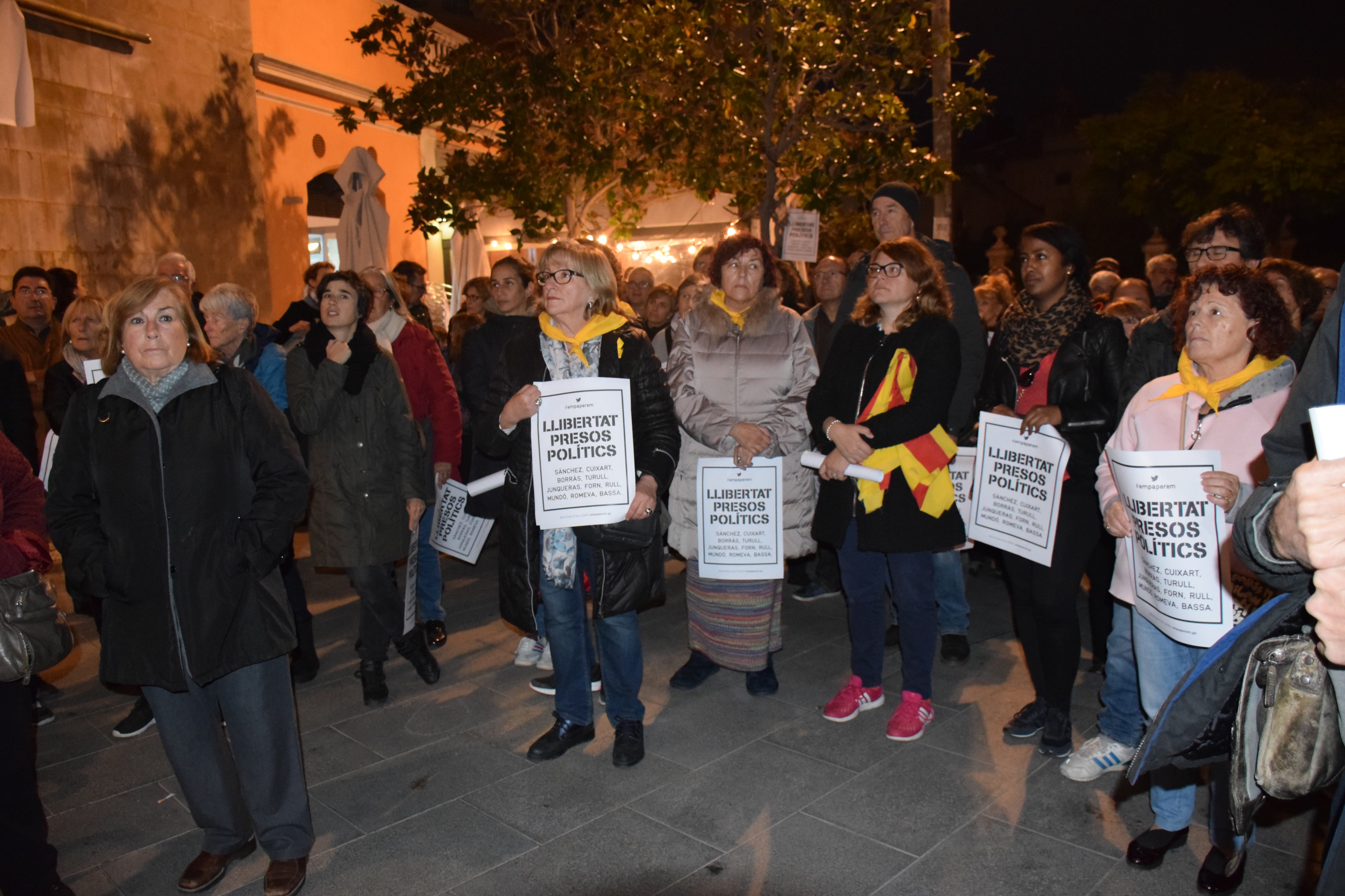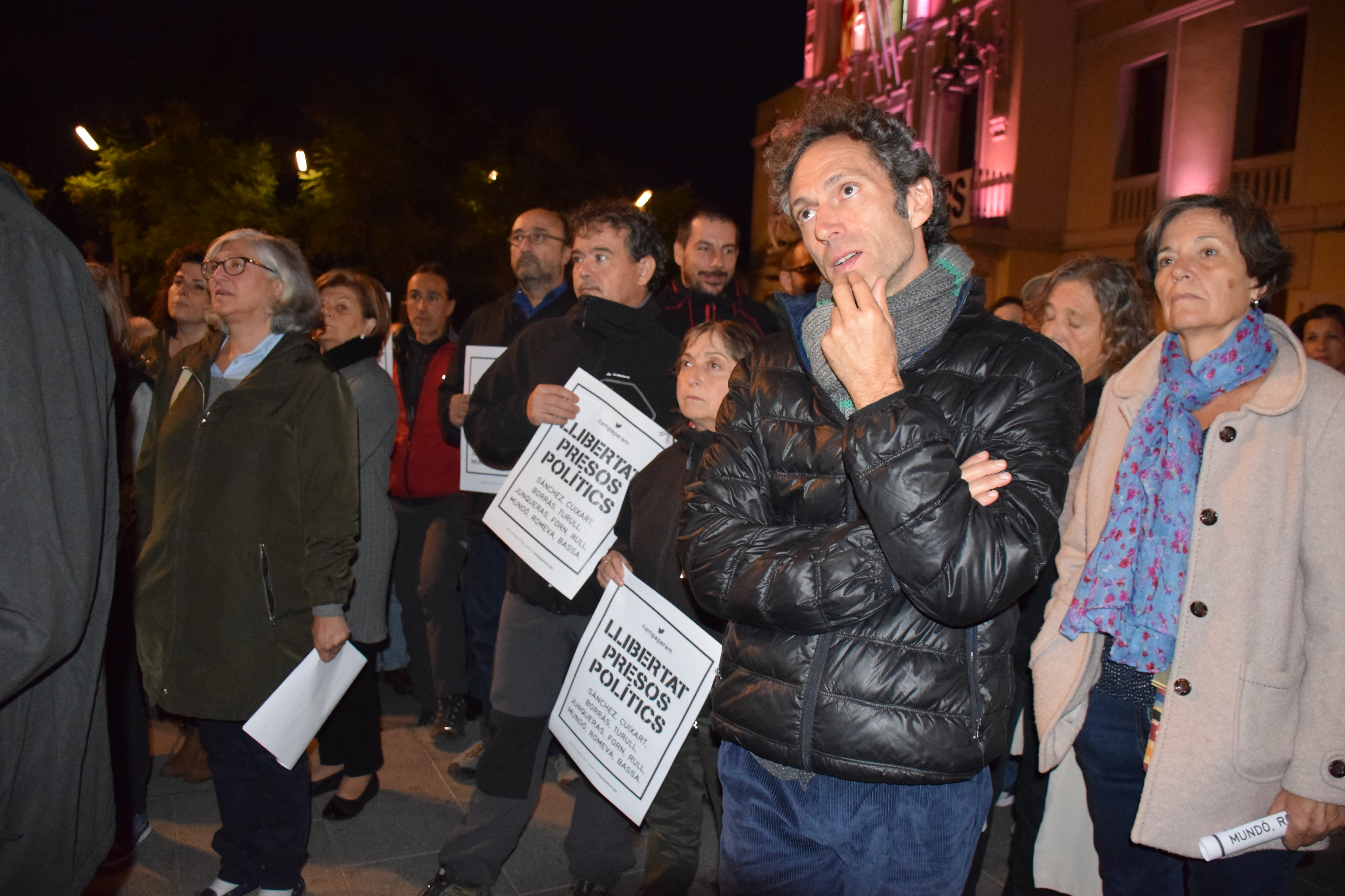 Tot seguit, l’actor Miquel Gelabert, voltat de representants polítics municipals sobiranistes ha llegit un manifest demanant l’alliberament dels Jordis i de les 8 persones del Govern que són a presó. Aqiuest és un fragment del que ha llegit, interromput pels aplaudiments i els crits a la llibertat de les persones persones presents a la Plaça de la Vila: