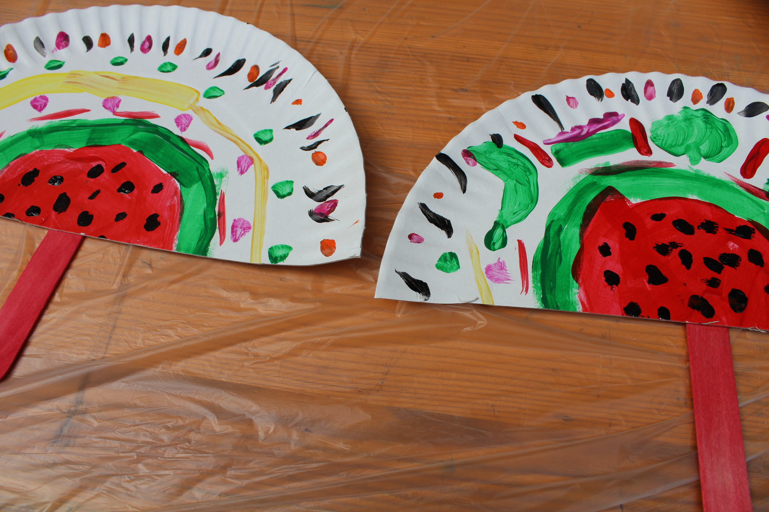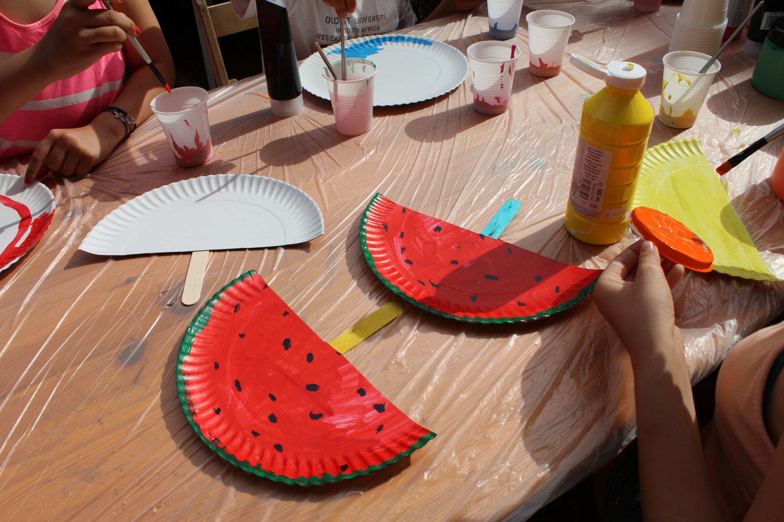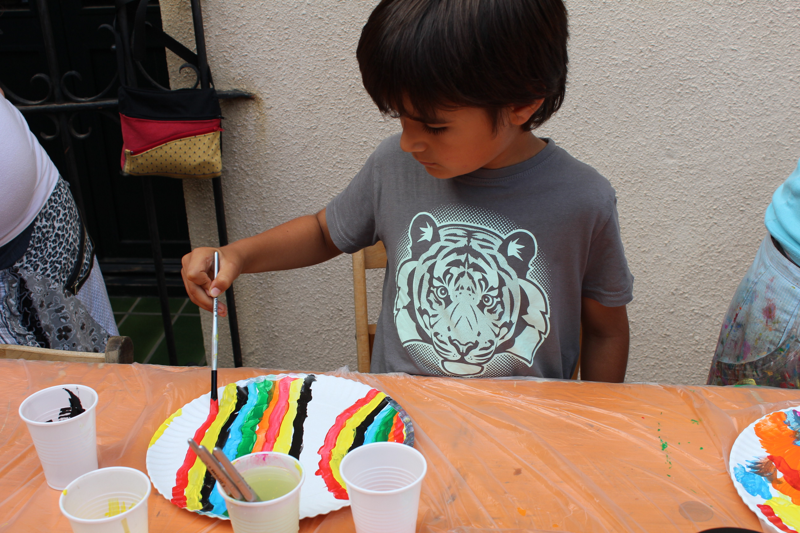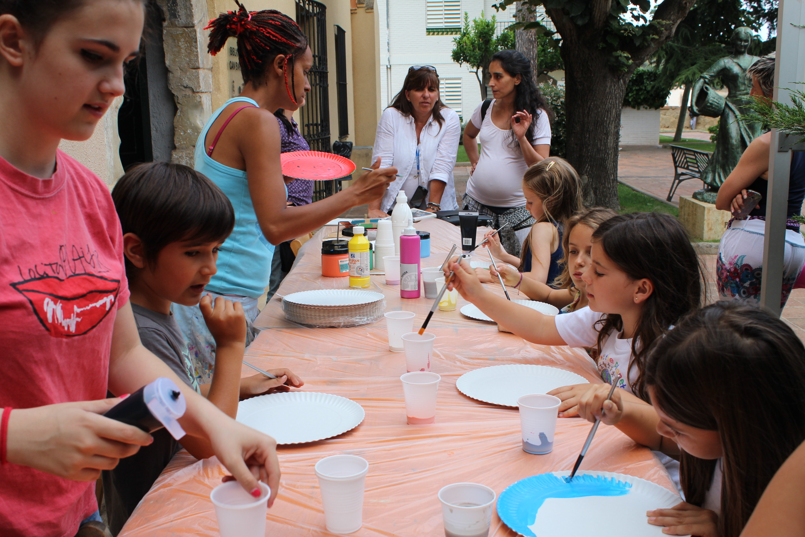El primer dels tallers consistia en fer ventalls de colors a partir de materials molt senzills d’utilitzar; un plat de paper tallat per la meitat que els nens havien de decorar i on, posteriorment, se li enganxava amb cola un pal de fusta. Un entreteniment ideal pels més creatius i calorosos del poble. Envoltant una llarga taula de fusta, cada cop han anat apropant-s’hi nens d’entre cinc i dotze anys, cridats pels pots de pintura de tots colors perfectes per decorar els ventalls.