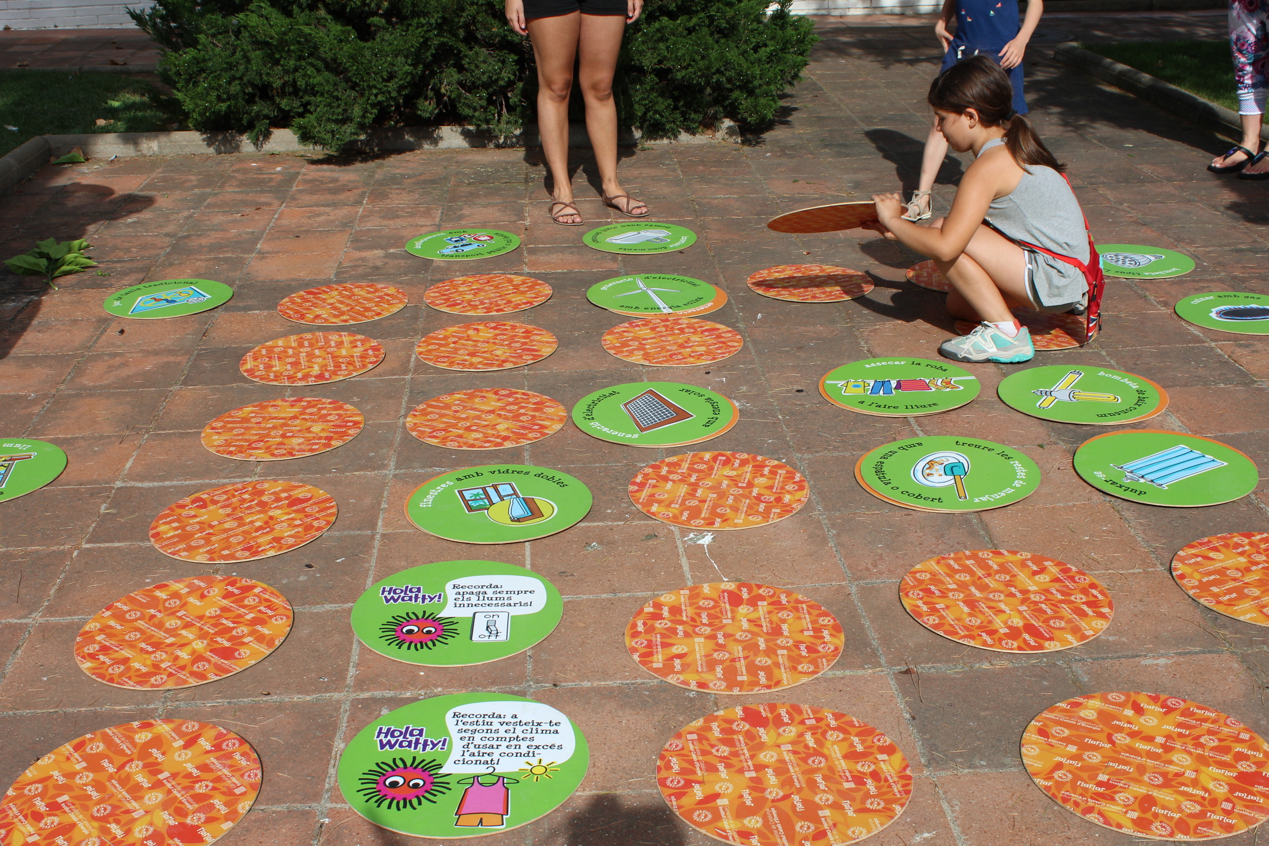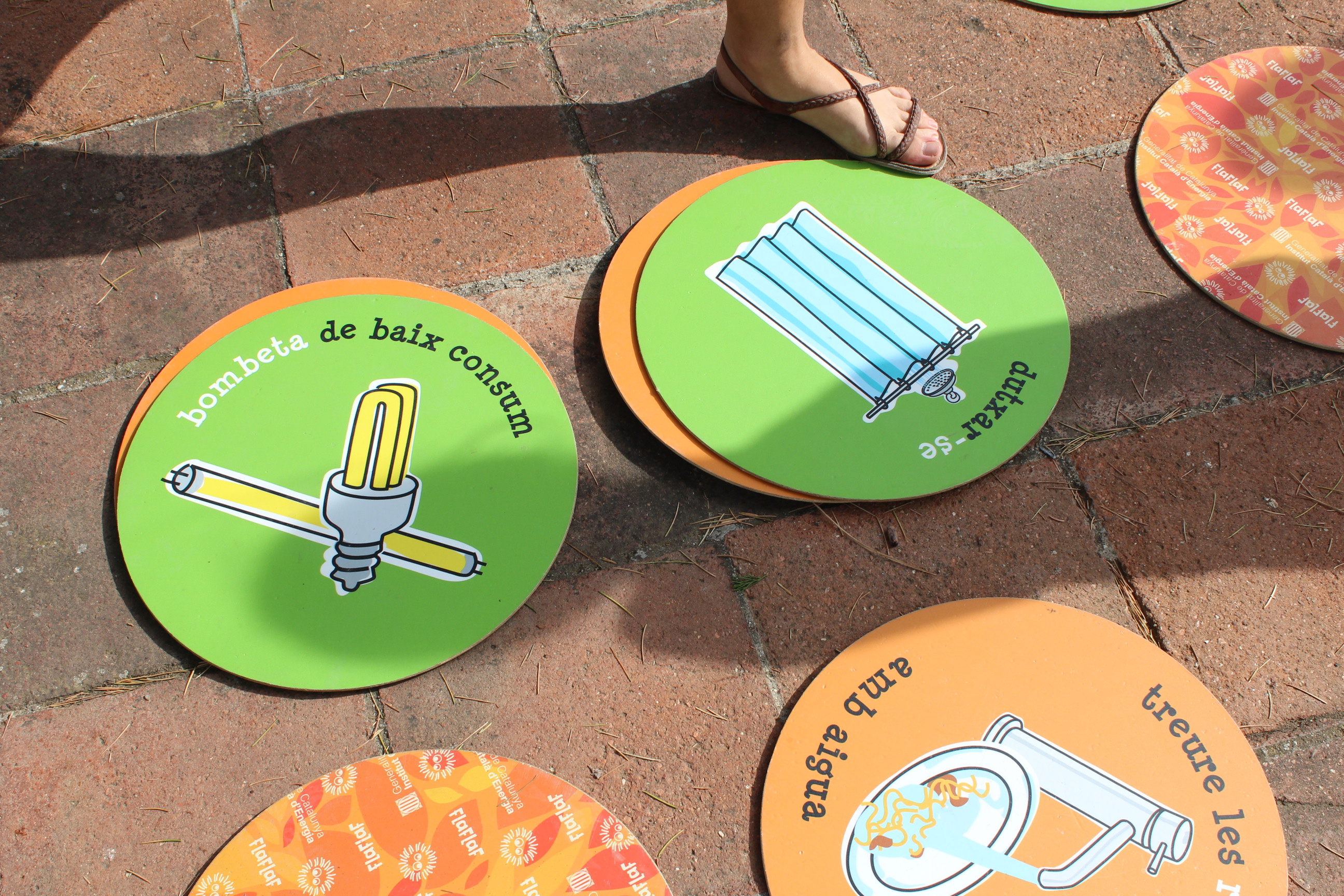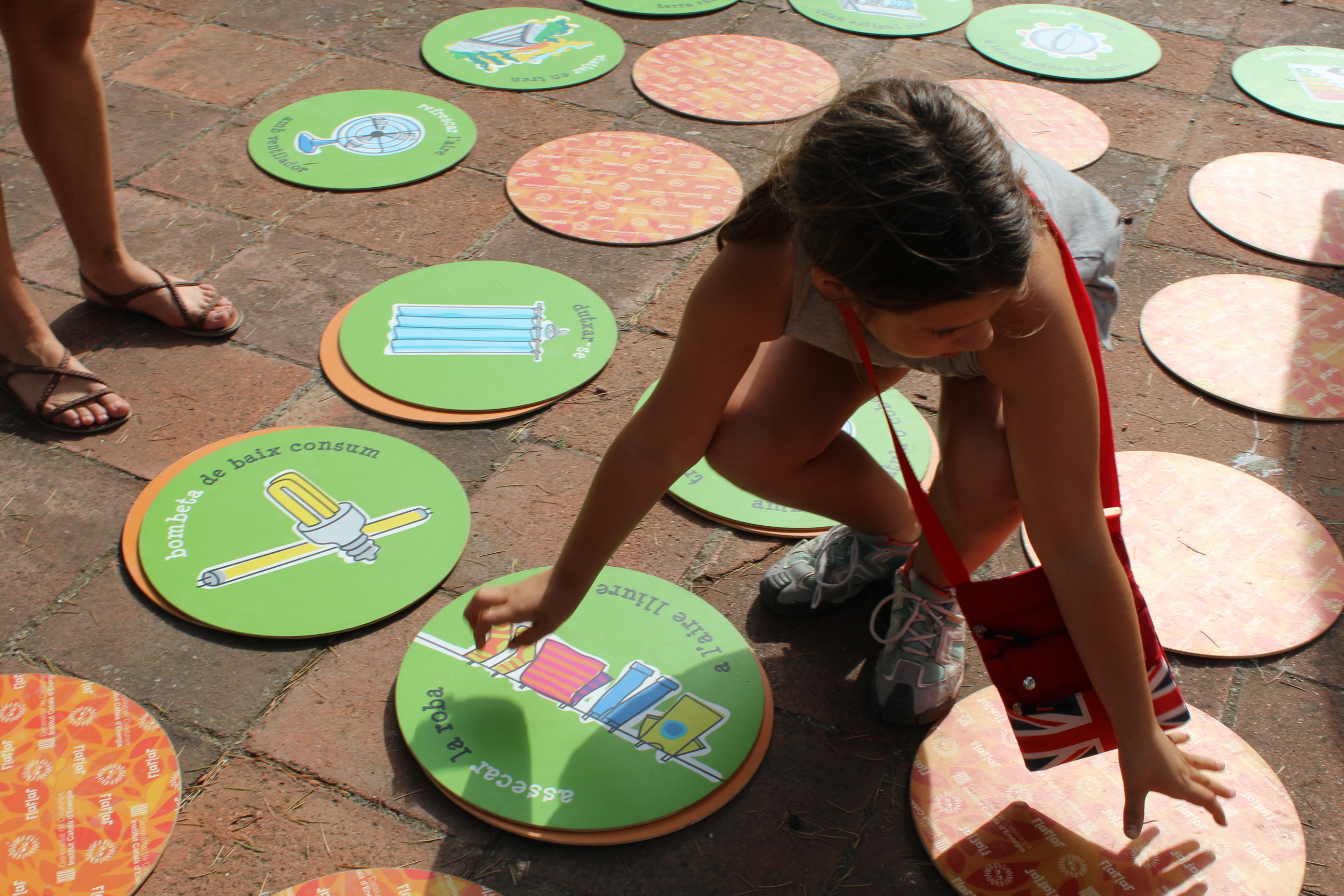 El segon taller convidava a aprendre jugant. Era una activitat enmarcada en la Setmana de l’Energia. Al bell mig dels jardins de la Biblioteca, s’hi ha instal·lat un enorme joc de parelles d’allò més original. Els que hi han jugat, han hagut d’aparellar accions del dia a dia en les quals gastem molta energia amb d’altres que fan gastar-ne menys. Per exemple, havien d’aparellar el fet de fer-nos una banyera amb l’acció de dutxar-nos, on gastem molta menys aigua.