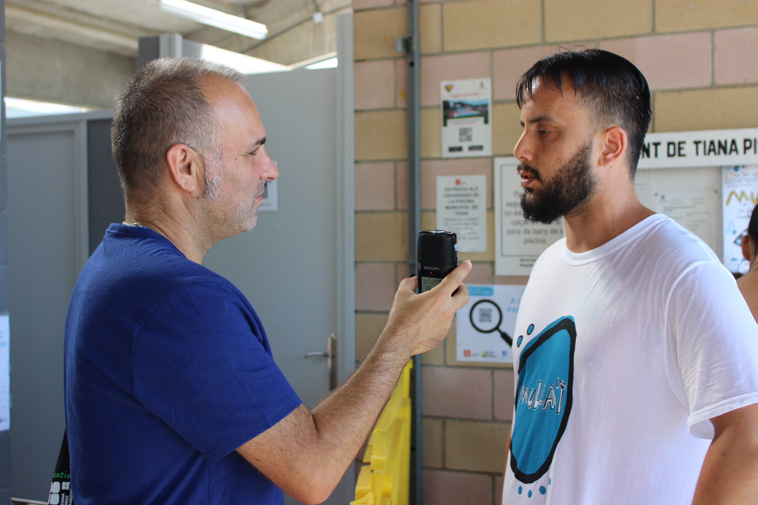 A l’entrada de la piscina Albert Alujas de 27 anys, voluntari fundació esclerosi múltiple, venia material Mulla’t i recollia donatius destinats a la FEM.