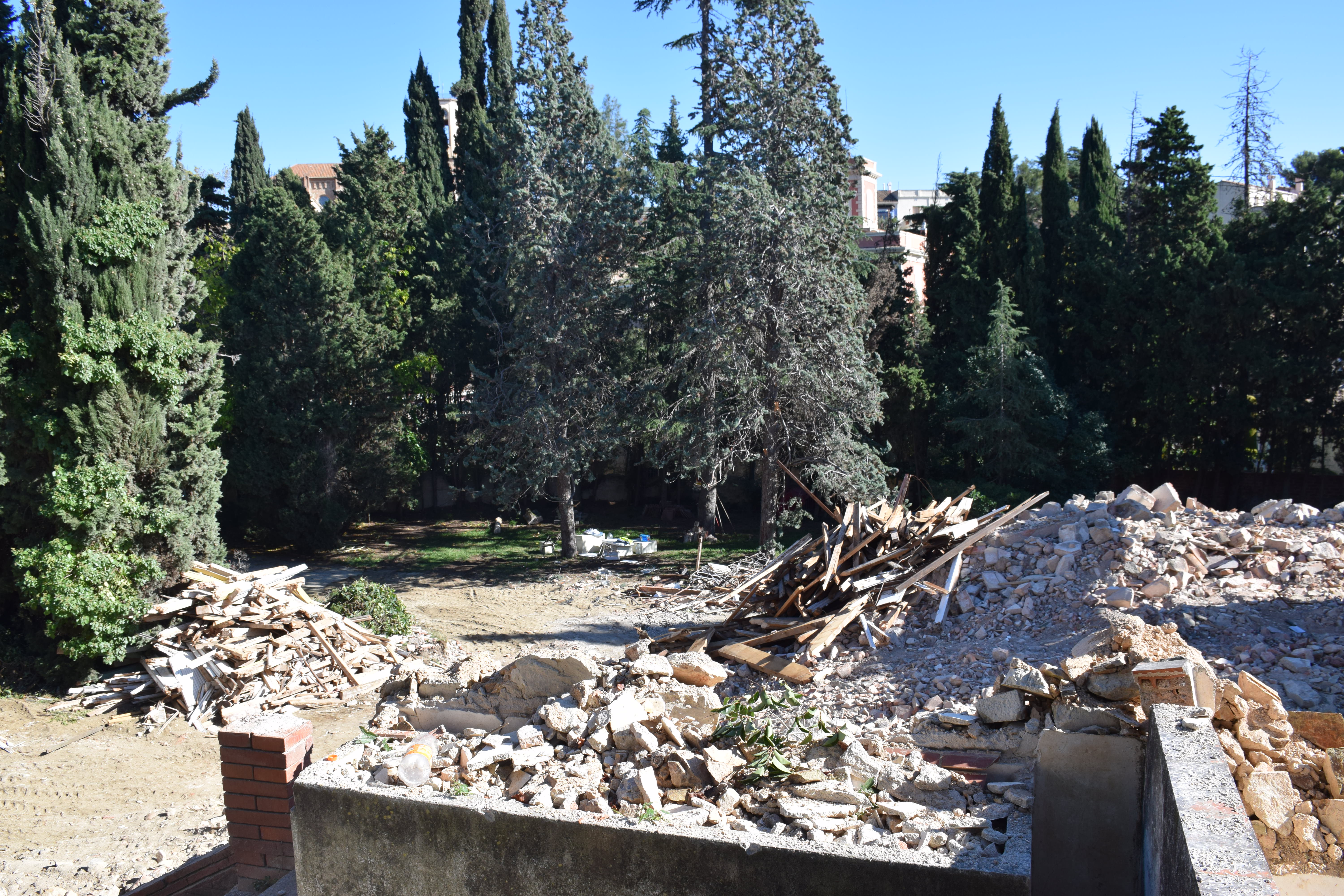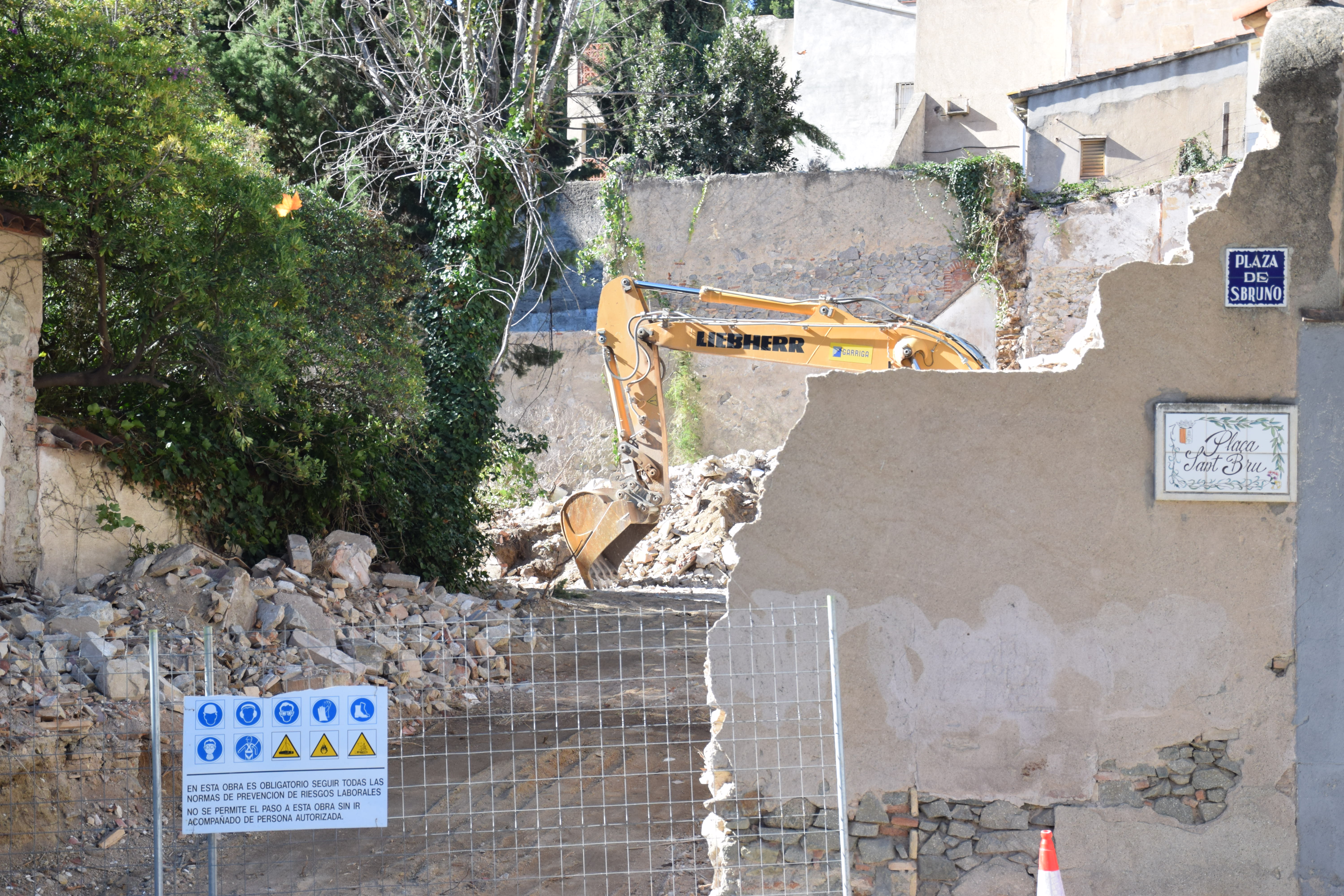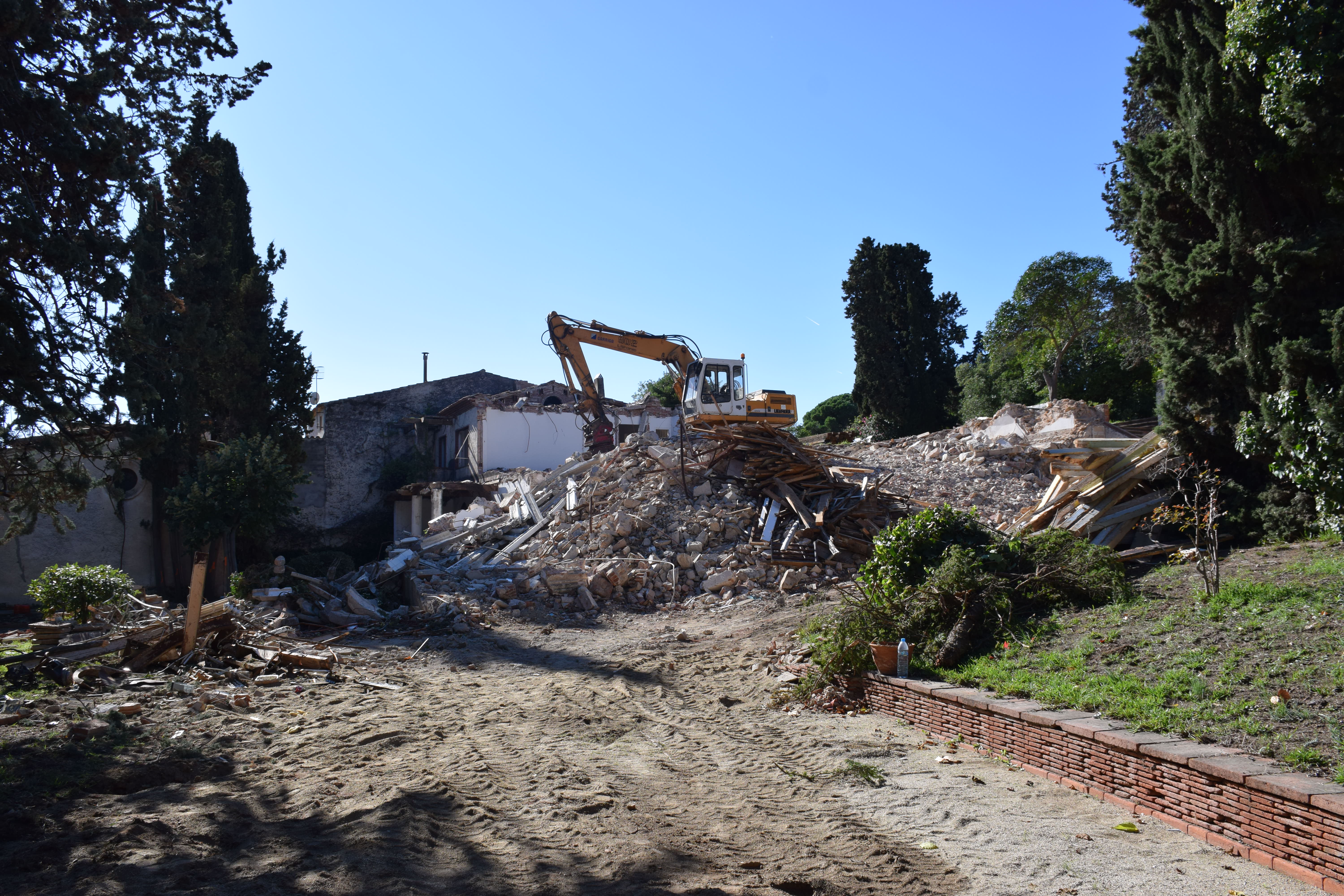 Dues excavadores i altres màquines van entrar la setmana passada pel costat del gran reixat que és l’entrada principal de la mansió. Per fer-ho, ha calgut enderrocar una part del mur de Can Peitx que dóna a la Riera. És, però, la part que no es conservarà ja que el fragment de mur que té la part superior ondulada, a l’altra banda de la reixa, està protegit i, per tant, no s’enderrocarà.