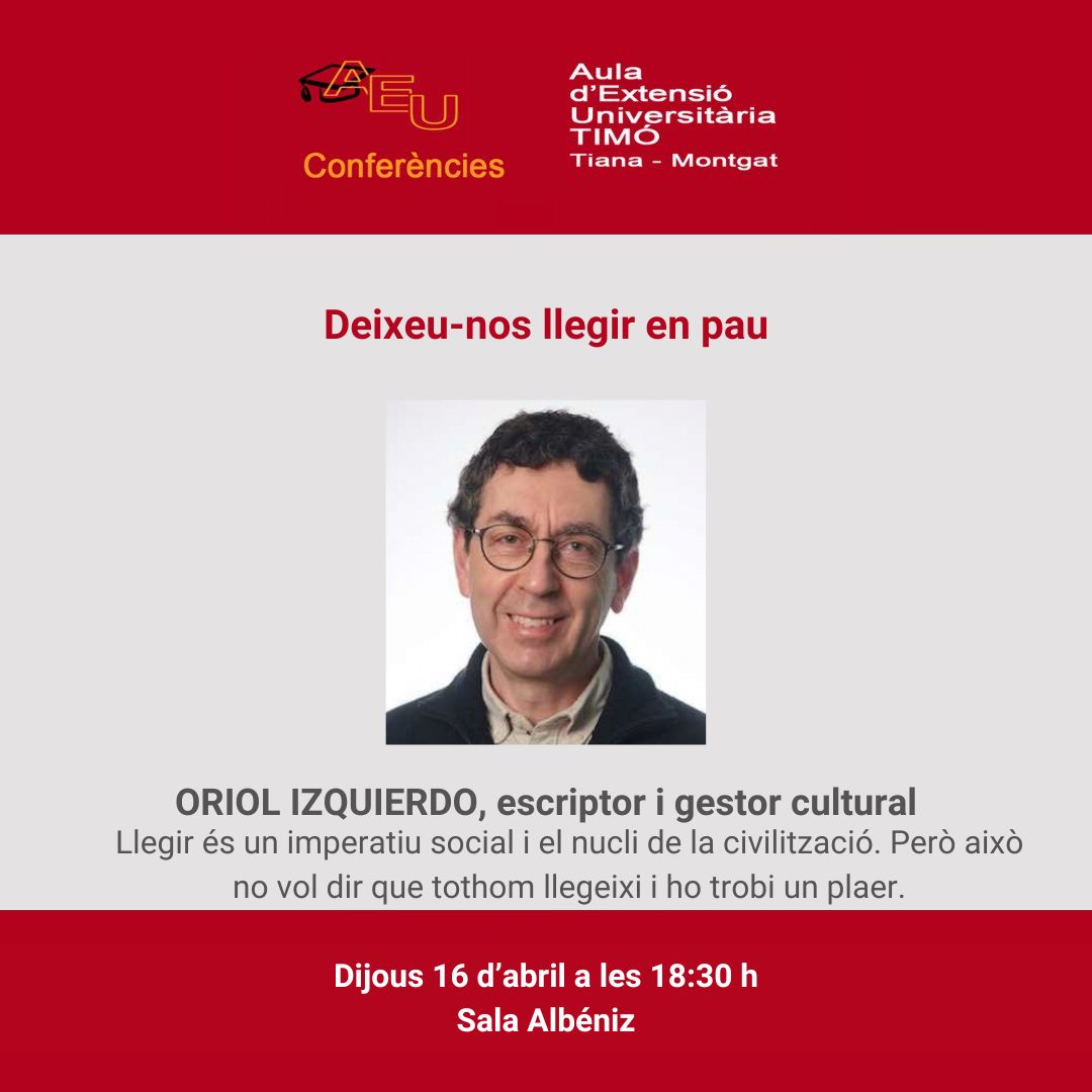 La segona conferència del mes d’abril de l’Aula d’Extensió Universitària de Tiana i Montgat es farà aquest dijous 16 a la Sala Albéniz de Tiana amb l‘escriptor i gestor cultural Oriol Izquierdo, titulada “Deixeu-nos llegir en pau!”. Tal com explica la Isabel Monseny, aprofitant que tindrà lloc en dates properes a Sant Jordi, des de l’Aula han volgut programar una xerrada amb una temàtica que, d’alguna manera, estigués relacionada amb aquesta festivitat: