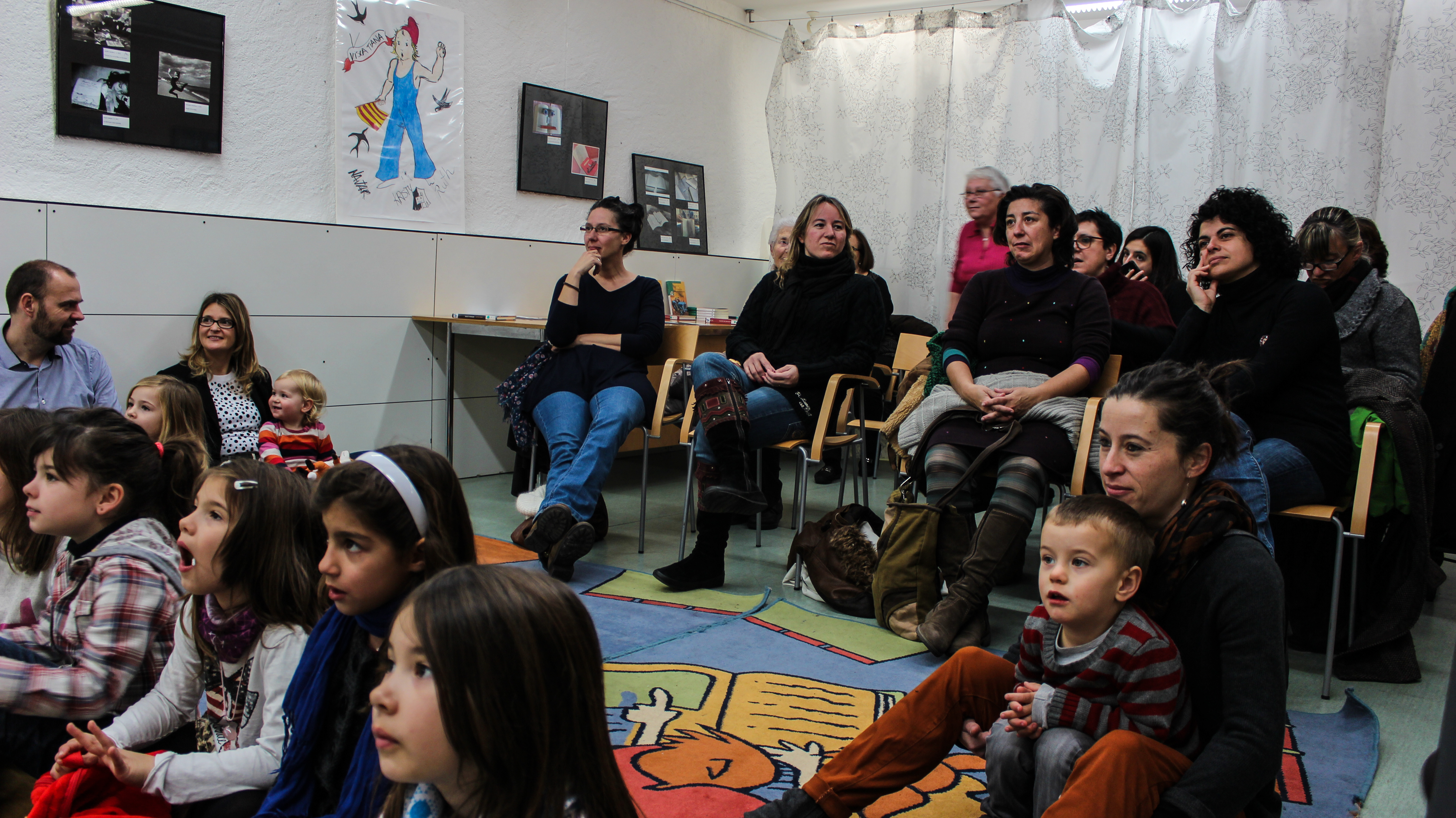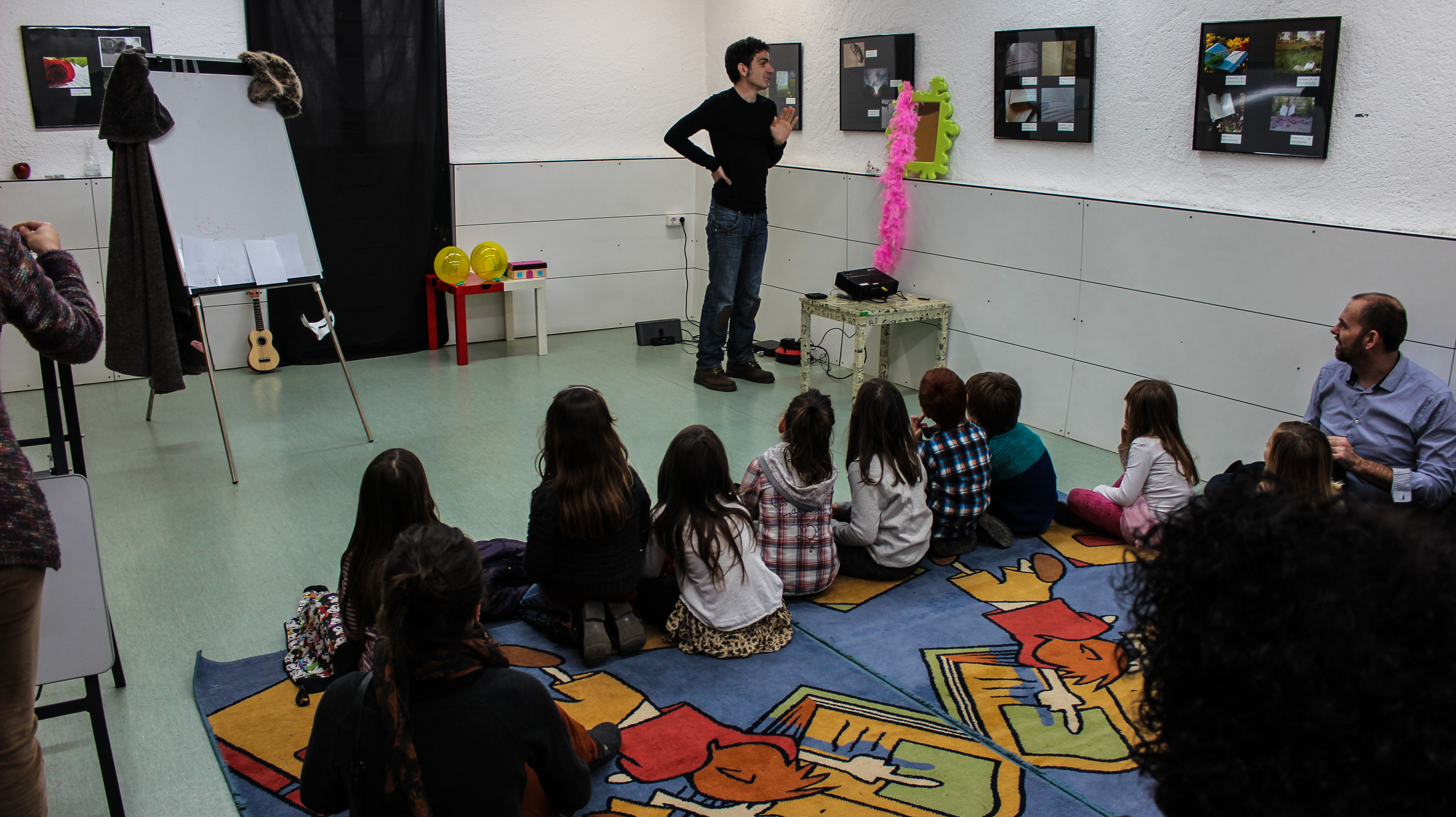 Josep Mª Ibern ha explicat una nova història agafant i barrejant els personatges del contes tradicionals d’una manera especial i diferent que ha absorbit l’atenció dels més menuts. Era un conte negre. Els tres porquets i la Blancaneus havien estat segrestats i el gat amb botes havia de resoldre l’enigma de qui era el segrestador: la guineu, disfressada de caçador.