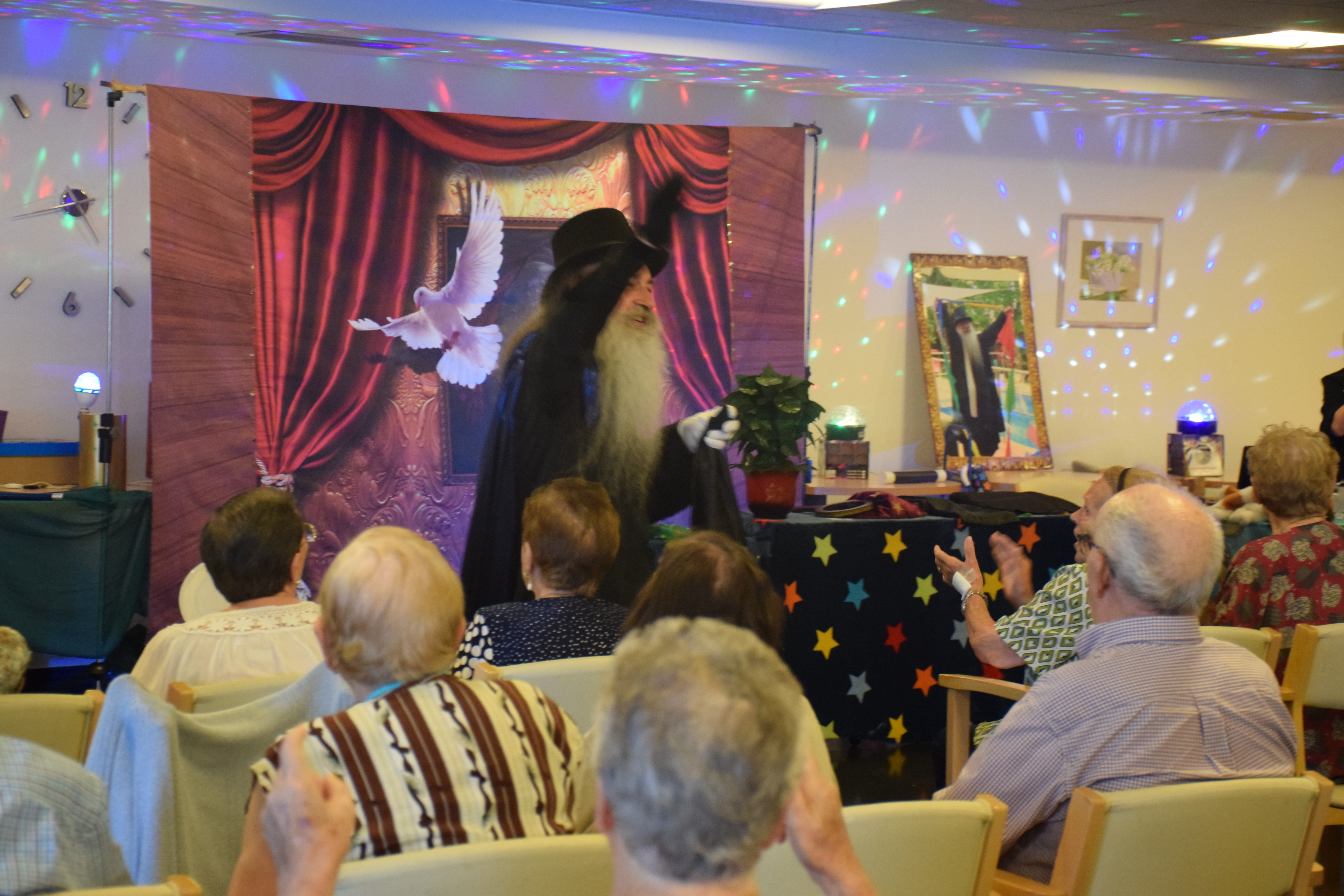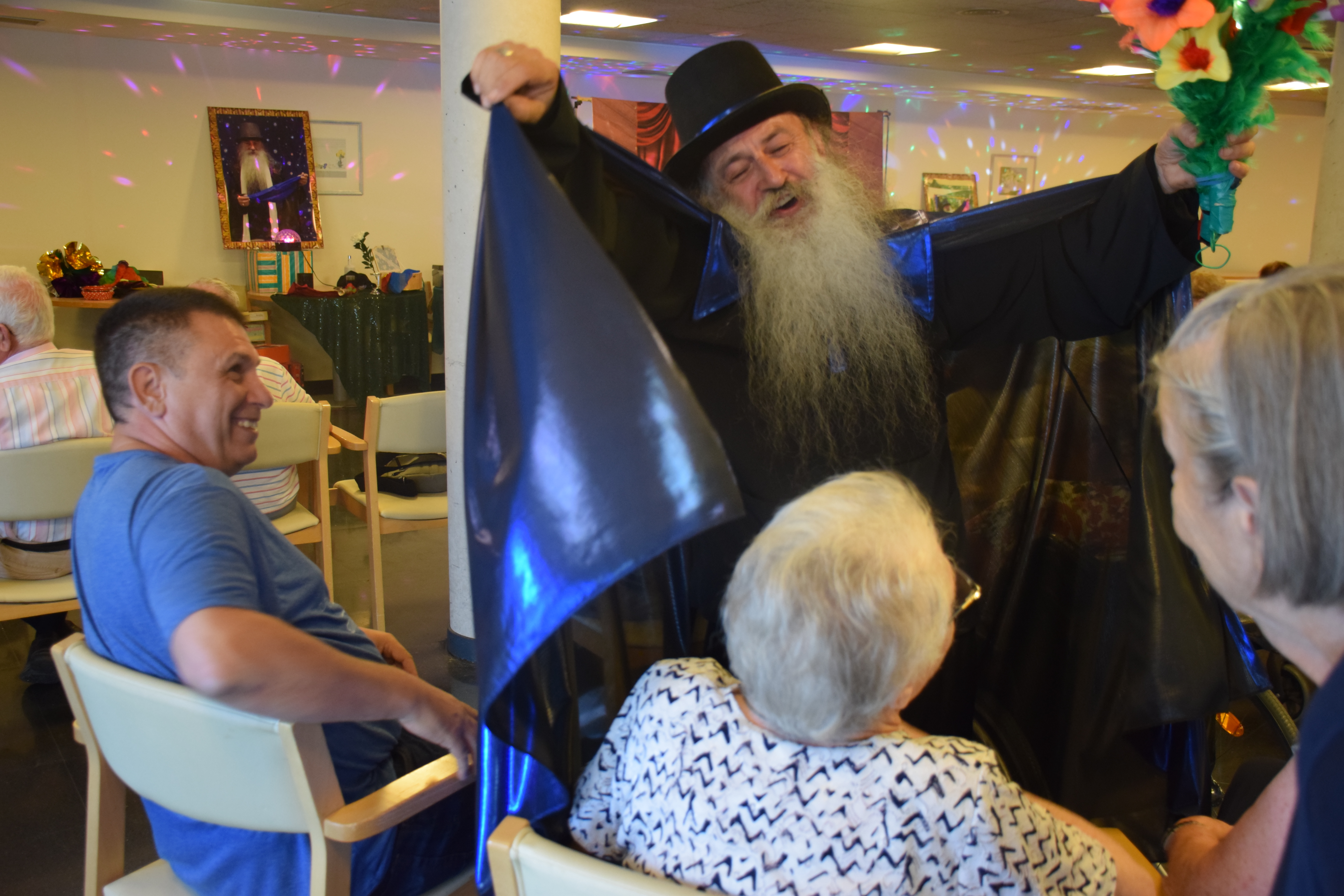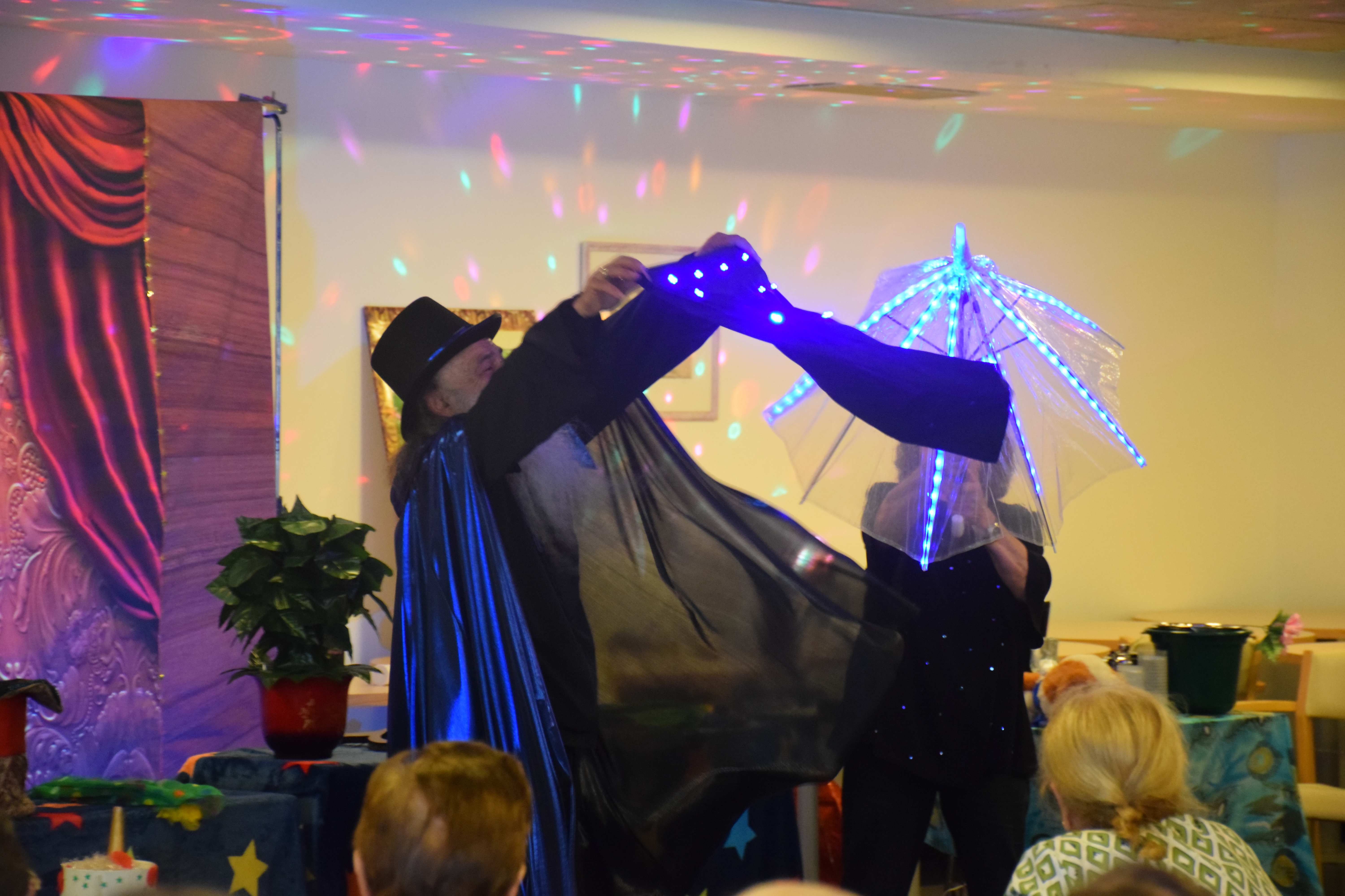 Es va passejar entre el públic, fent que els avis i àvies interactuessin amb els seus trucs de màgia, els regalava abraçades i petons, a tots, un a un; i els més valents van sortir al final per fer un trenet al ritme de la cançó “El Chacachá del Tren”.