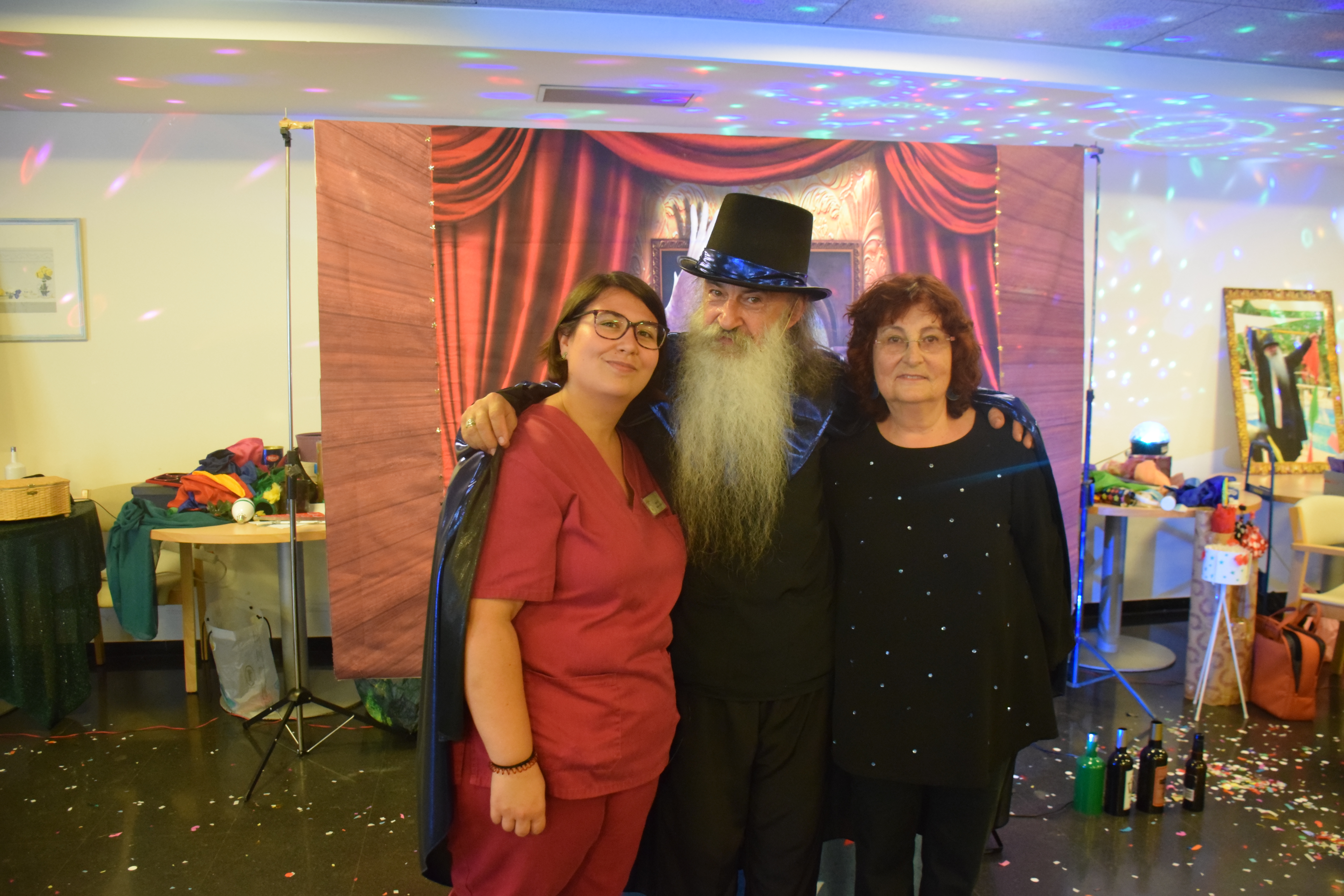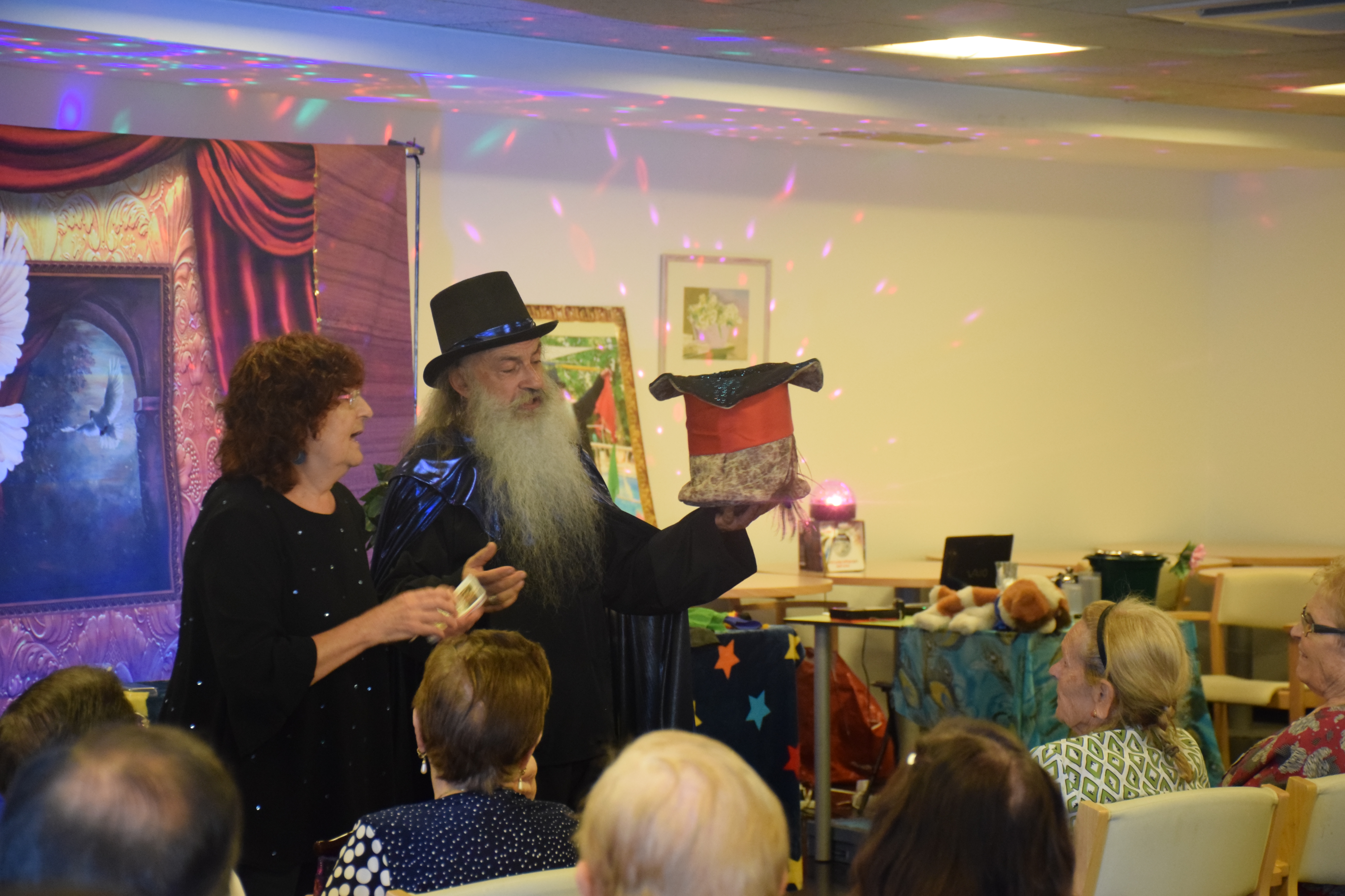 Com tots els mags clàssics, l’acompanyava la seva ajudant. Tots dos van de residència en residència, principalment de la comarca del Maresme, duent el seu espectacle. Ja han passat per més de 80, expliquen: