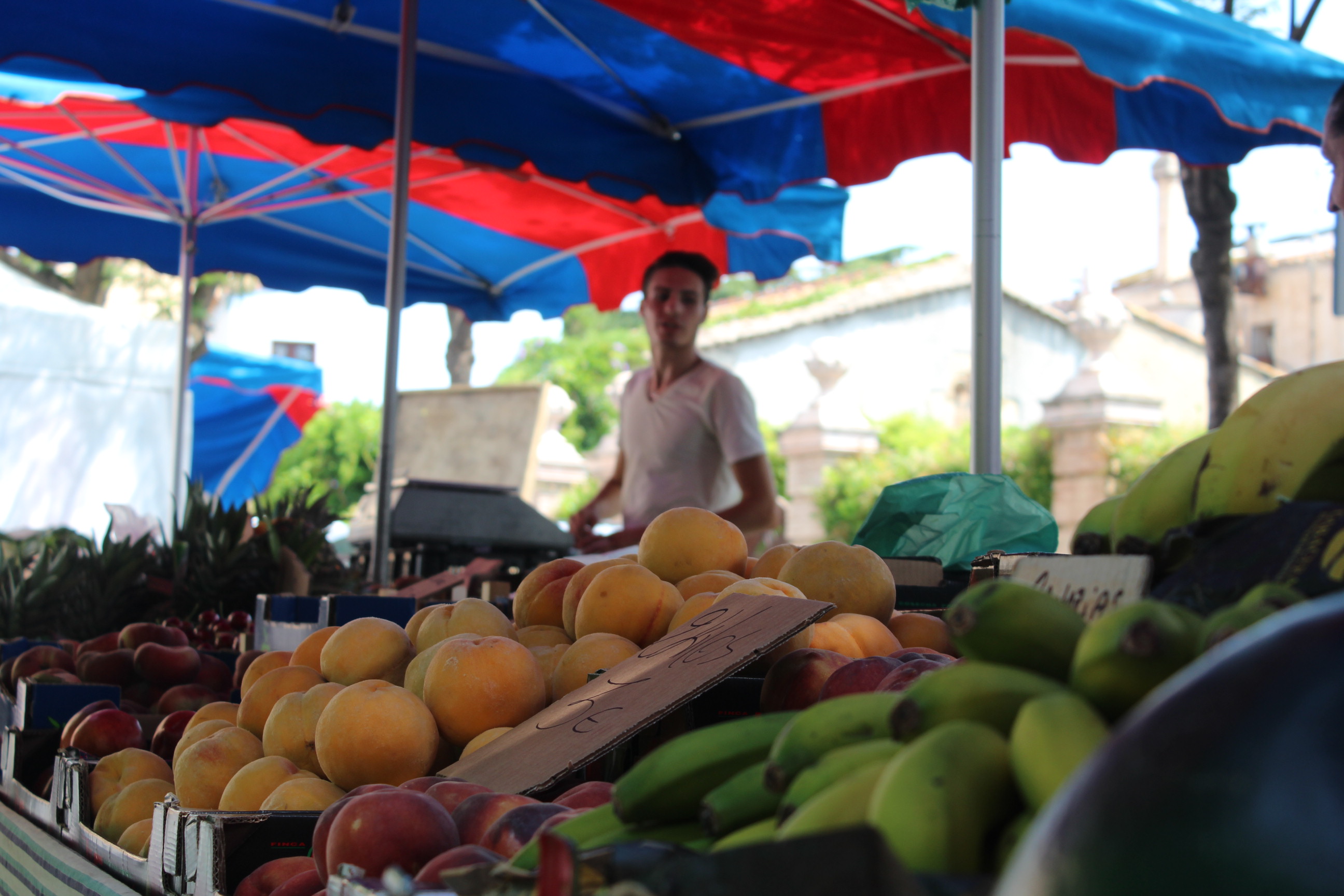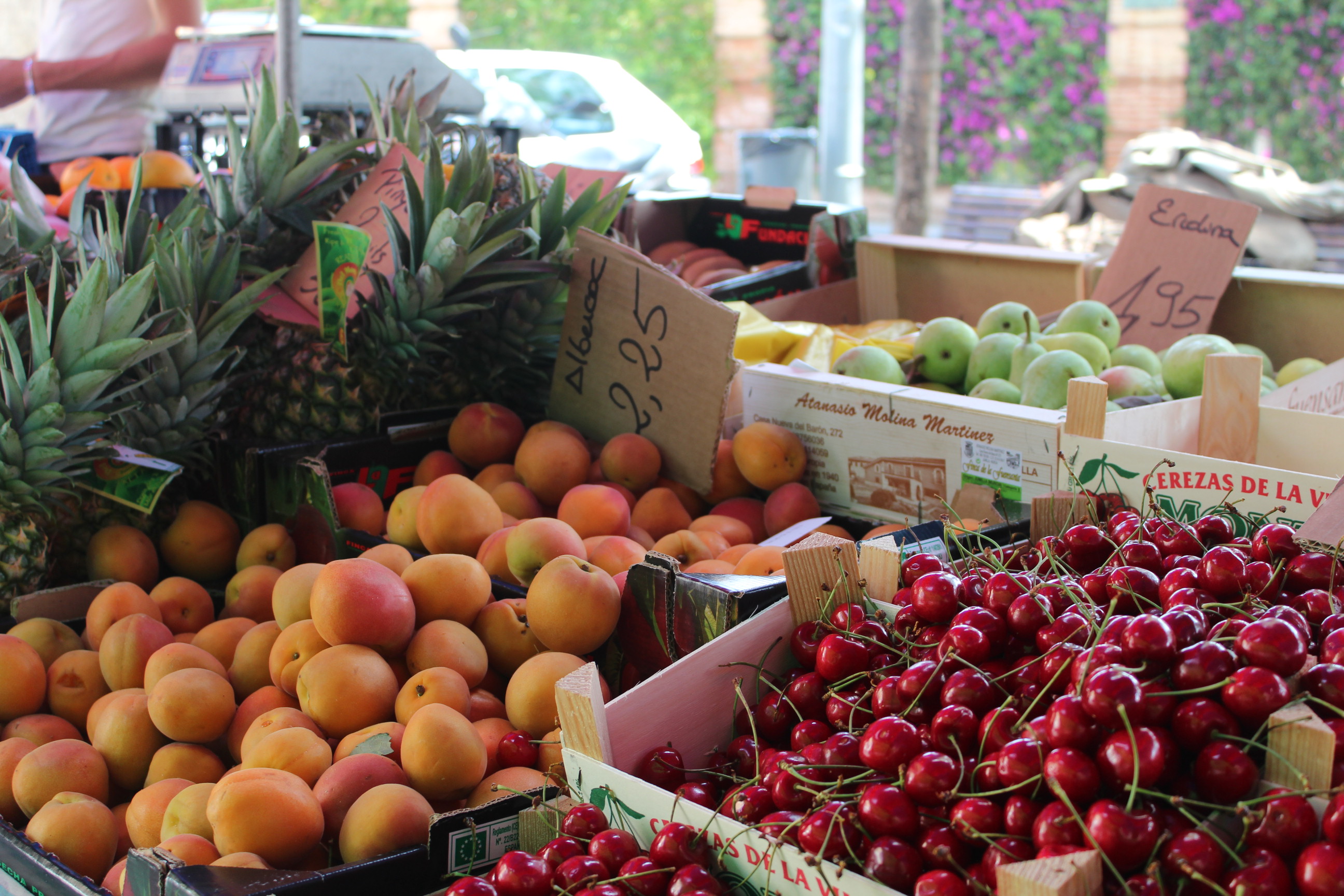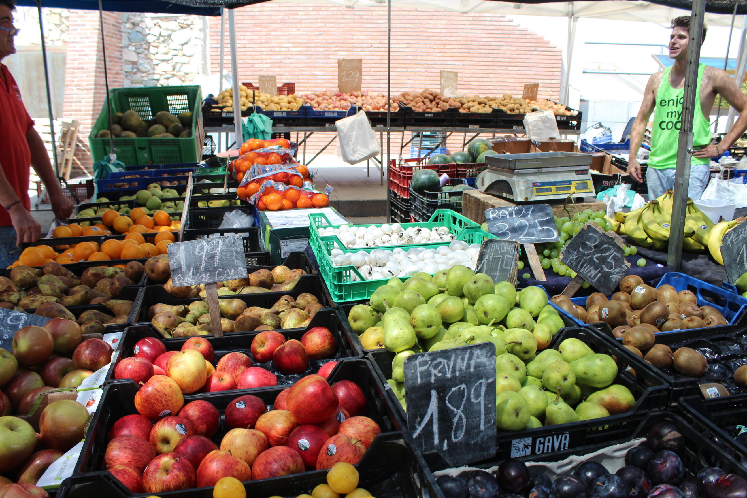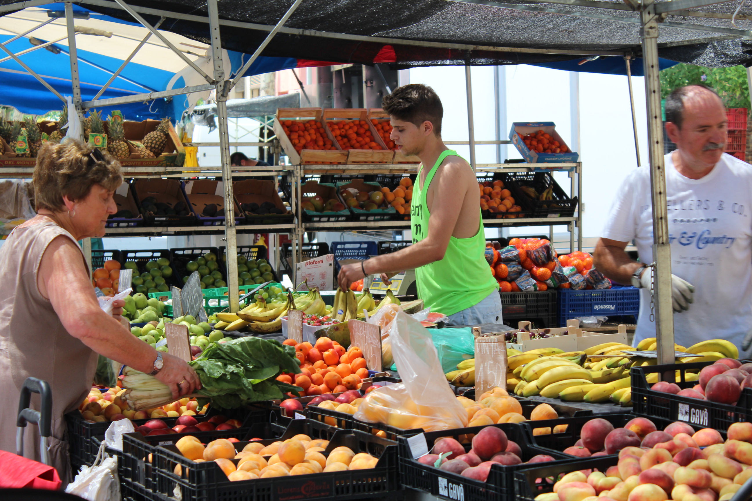 L’altre fruiteria que trobem al mercat és de collita pròpia. Els pares de l’Ivan fa 40 anys que es dediquen a cultivar i vendre productes de la terra. Aquest és el valor afegit de la fruiteria. Conreen cireres, préssecs mongetes, patates, apis, porros, tomàquets entre d’altre productes, segons la temporada. A més de vendre en diferents mercats del Maresme, també tenen una botiga a Arenys de Mar.