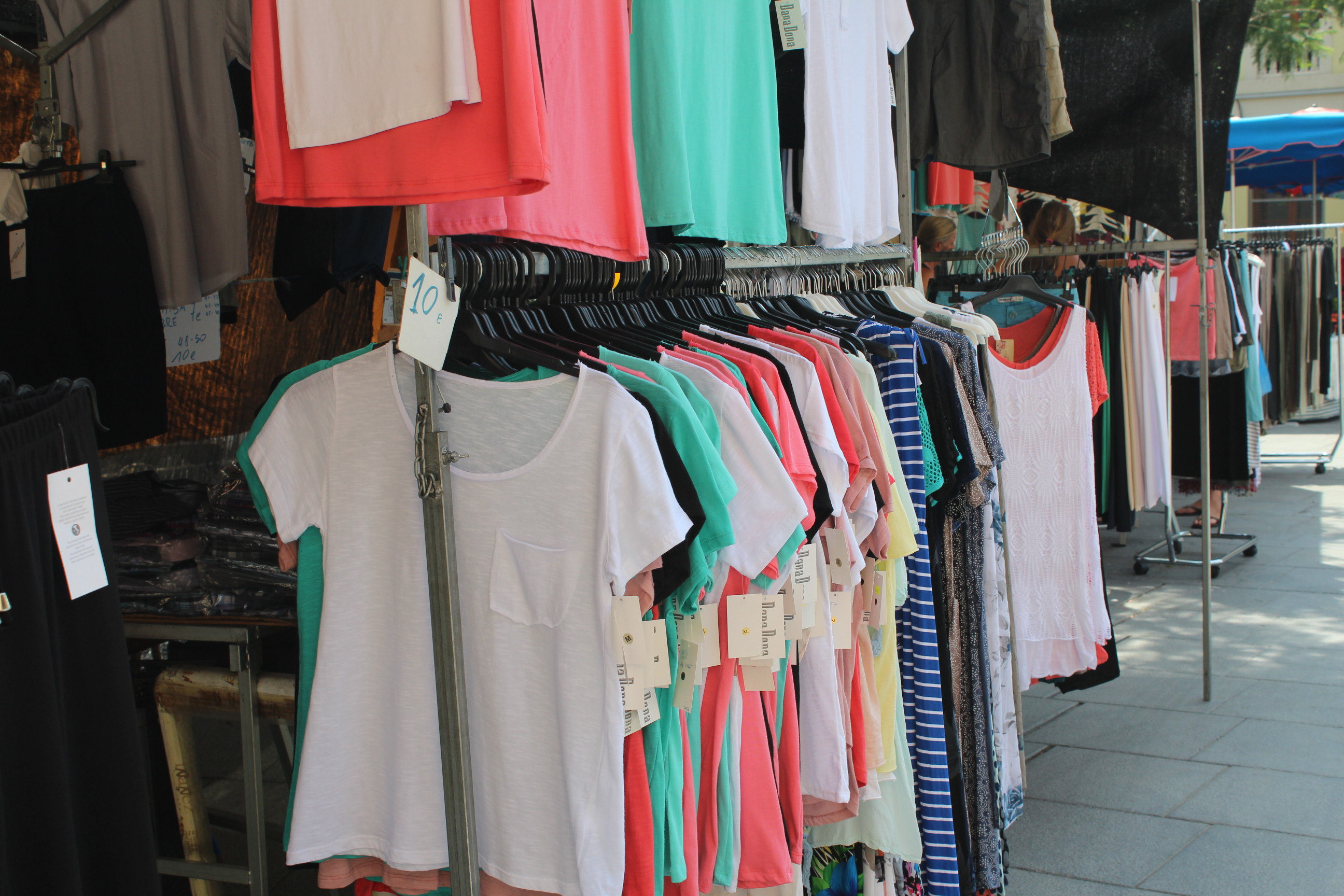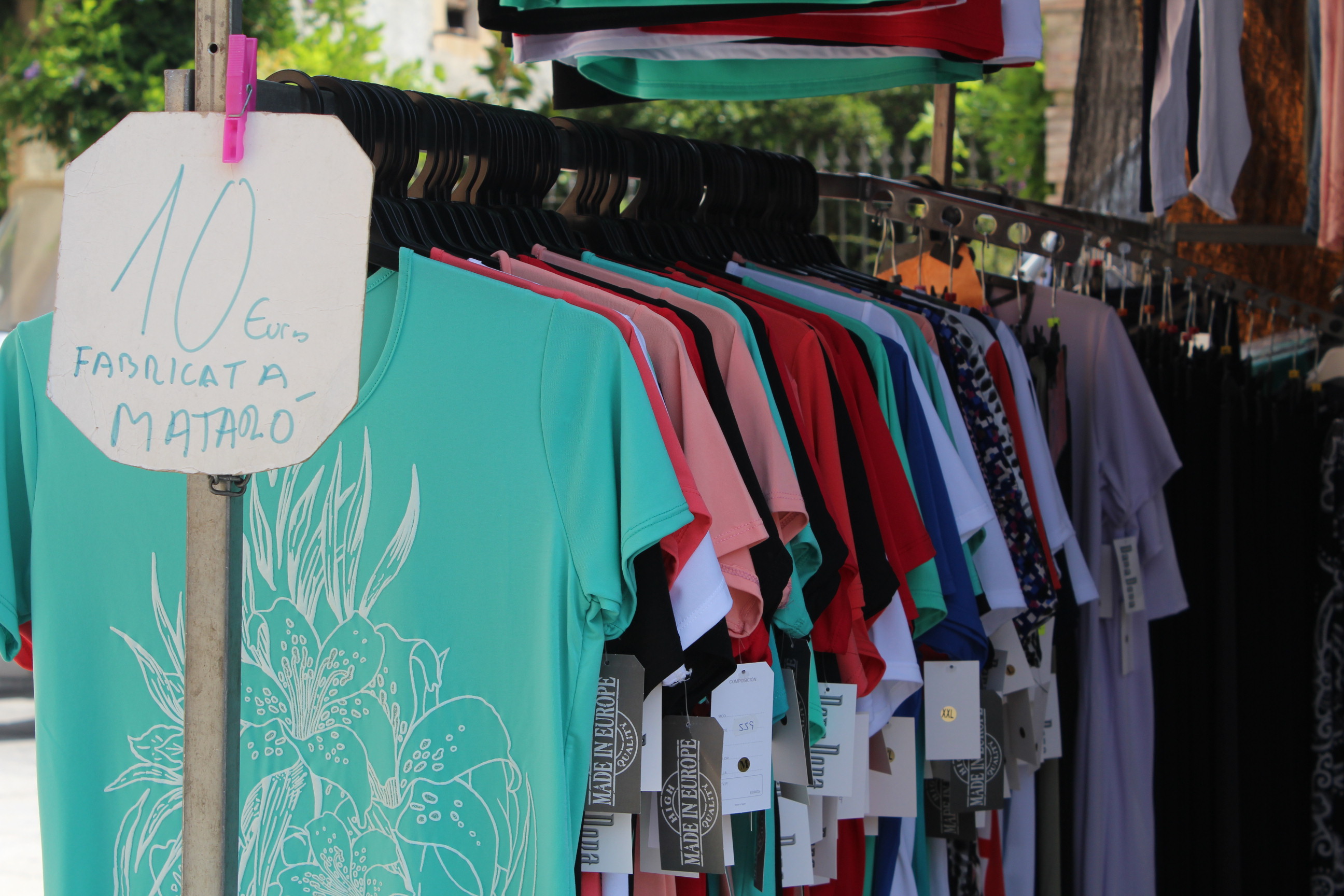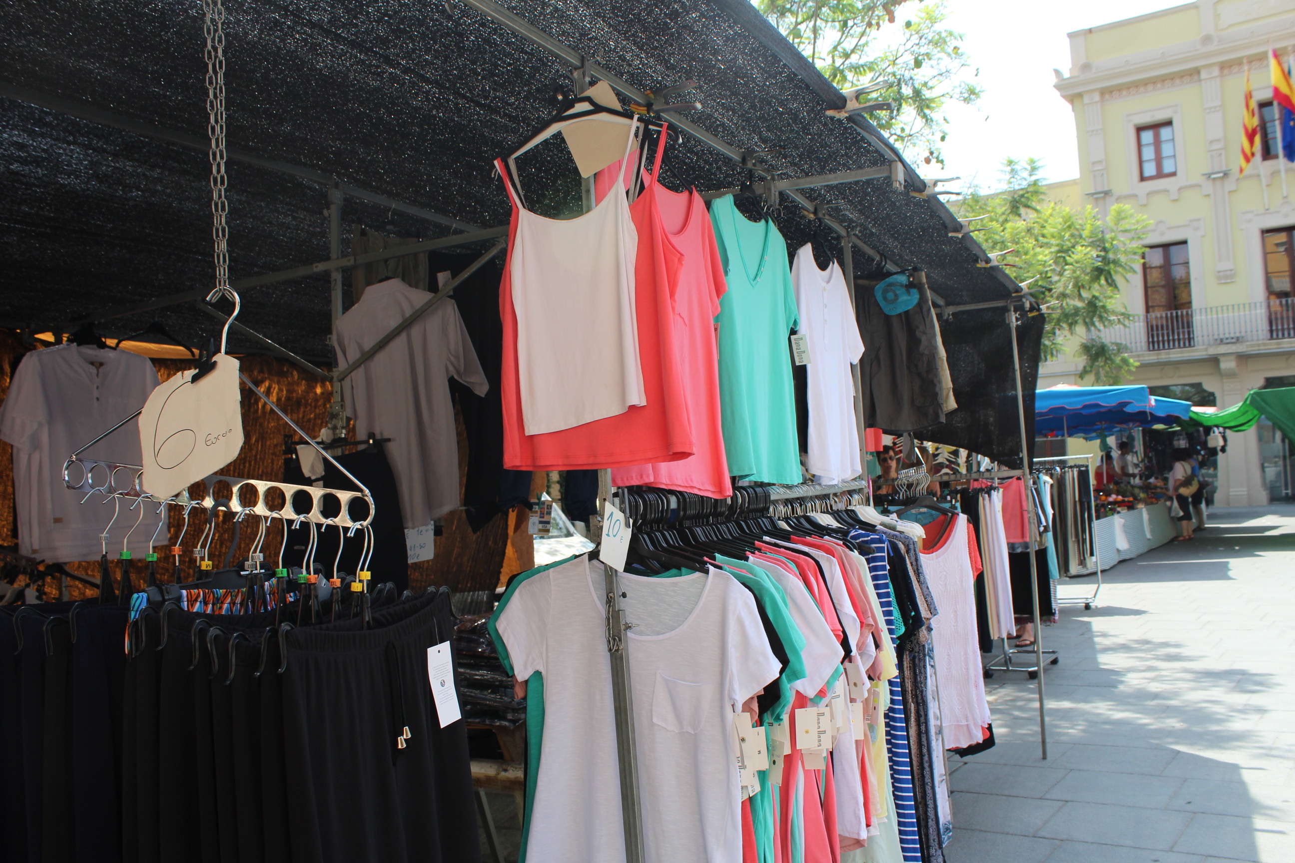 En el mercat també s’hi poden trobar diverses paradetes de roba. El Jose fa 10 anys que cada dimarts ve al mercat de Tiana i ven roba tant de dona com d’home. El que caracteritza el seu producte és la proximitat ja que la roba es fabrica a Mataró. Ell és un dels propietaris que ha notat que es ven menys que abans.
