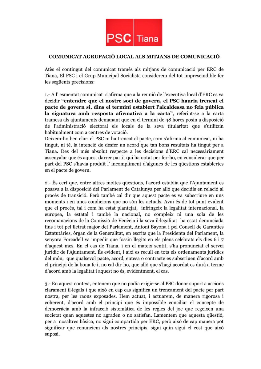 El comunicat repeteix els arguments que, aquest divendres, esgrimia la portaveu del grup municipal del PSC, Núria Blasco: que un pacte no els pot obligar, com és el cas, argumenta, “a fer una cosa il.legal”. Ho deia en clara referència al fet d’haver de facilitar que se celebri el referèndum a Tiana.