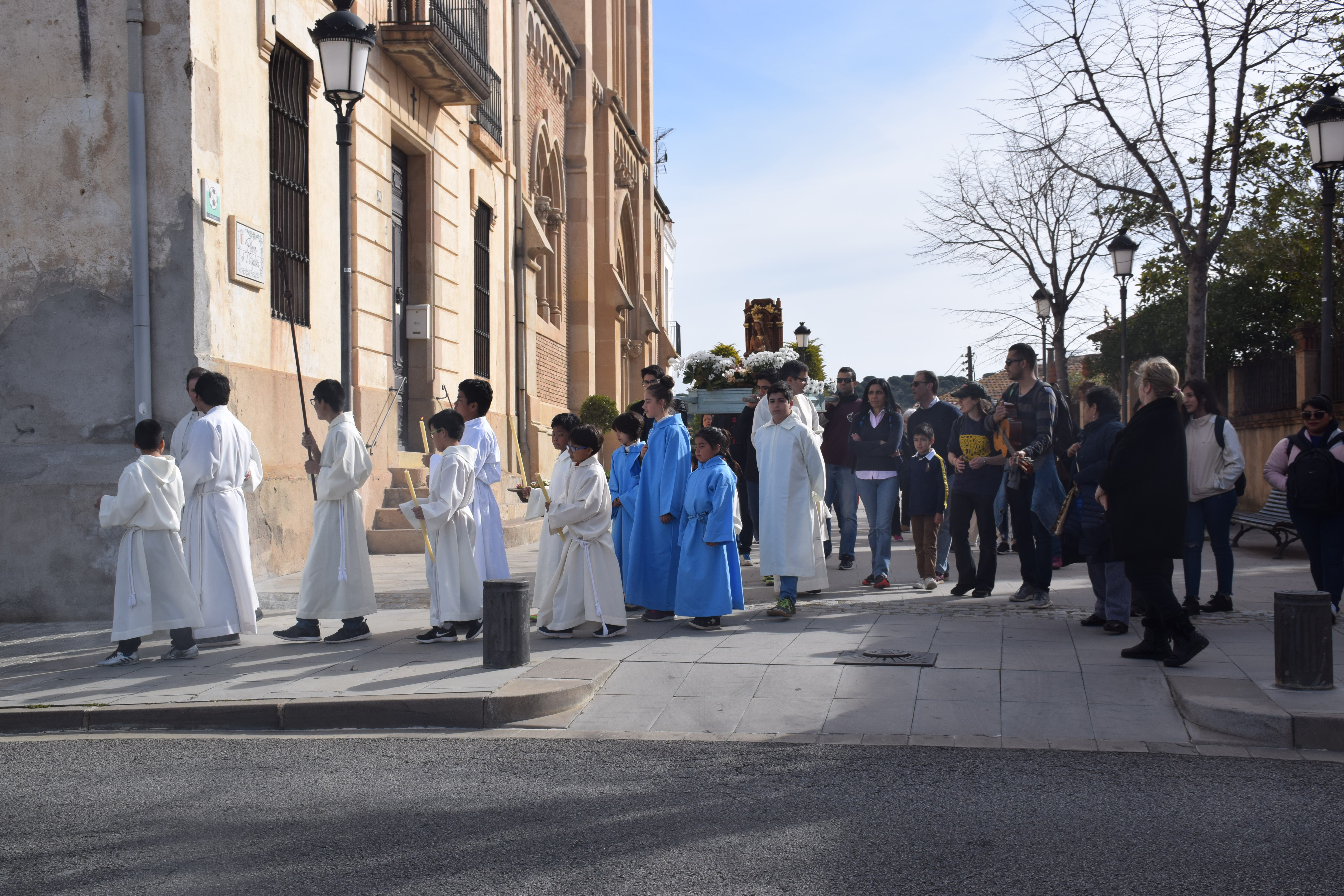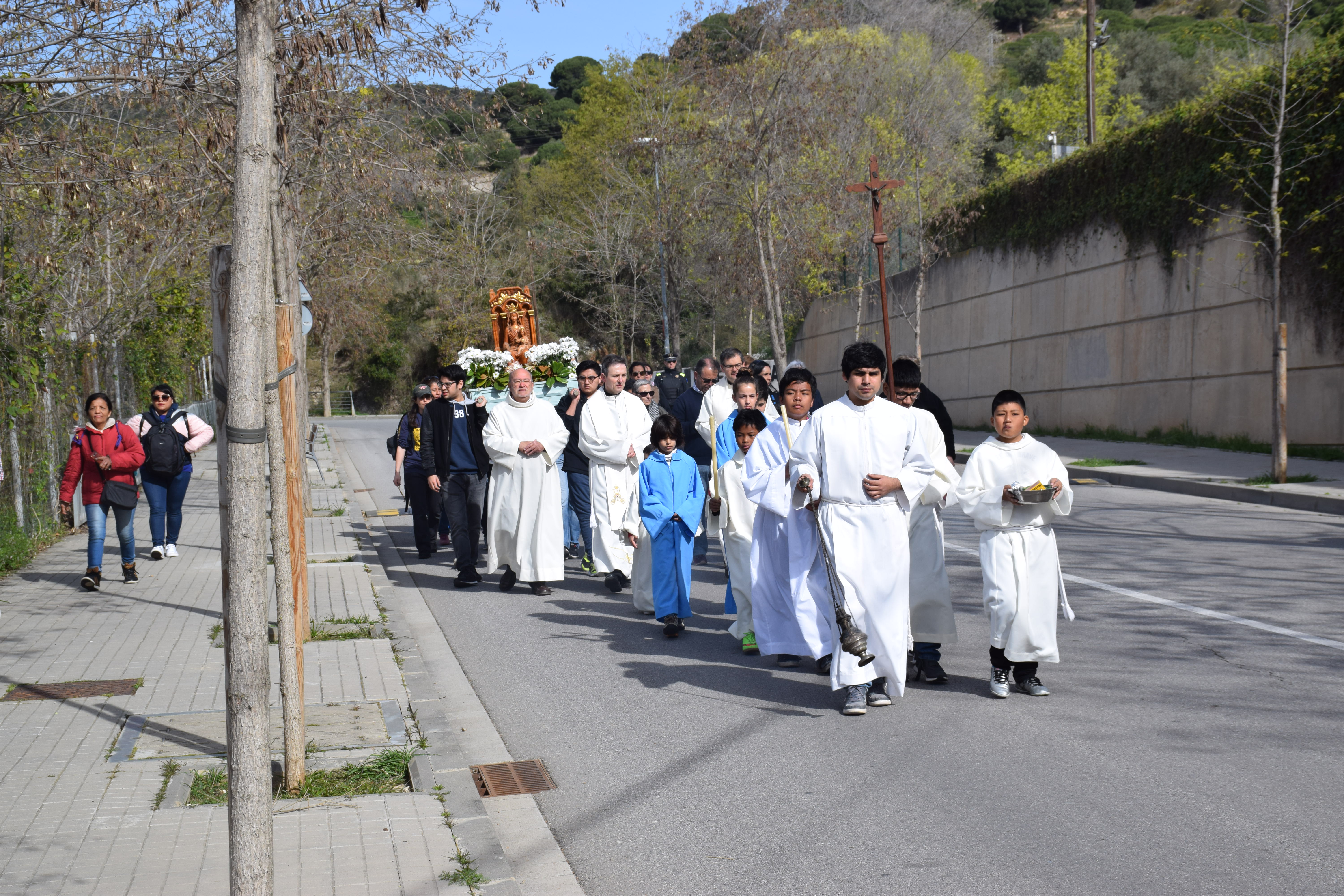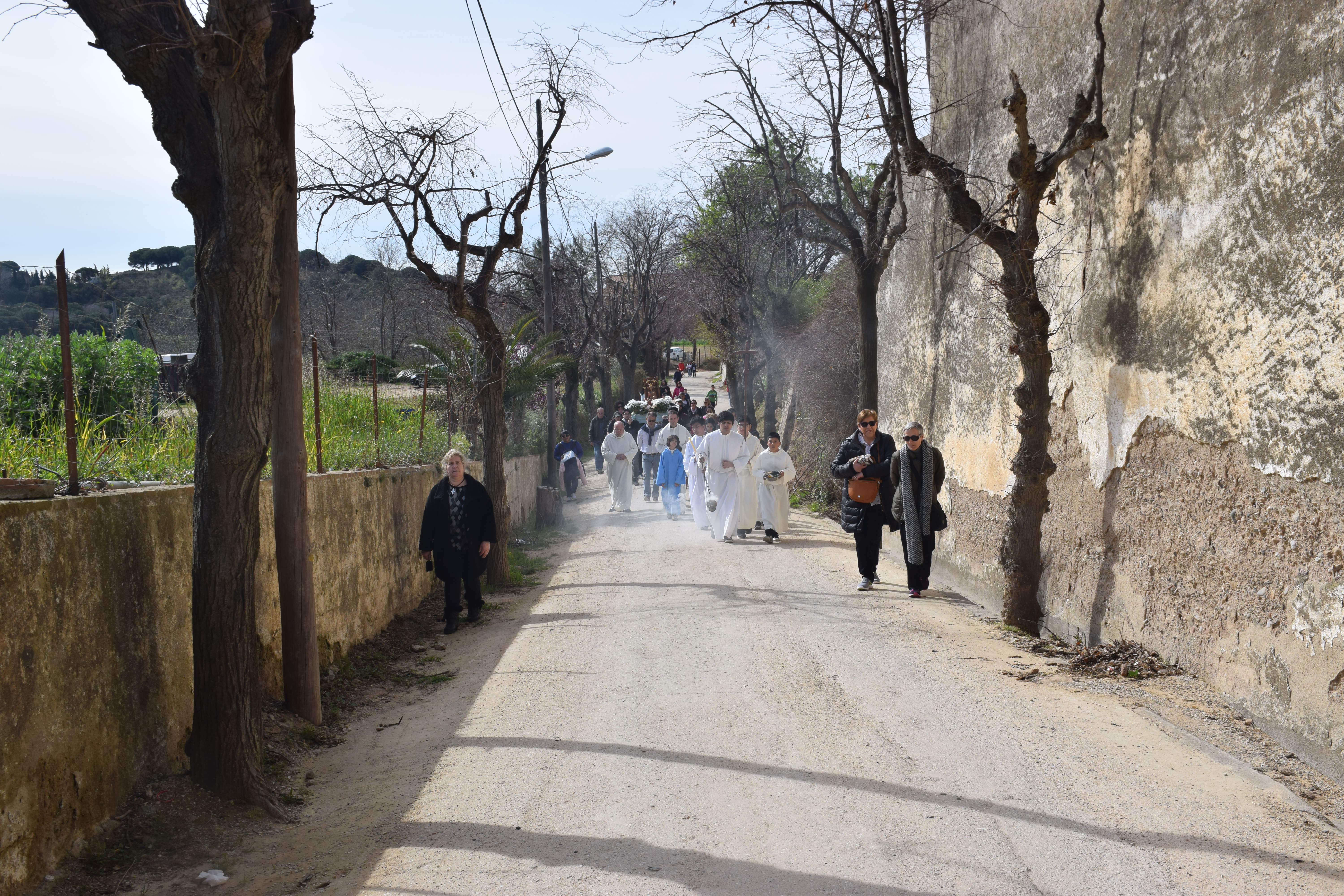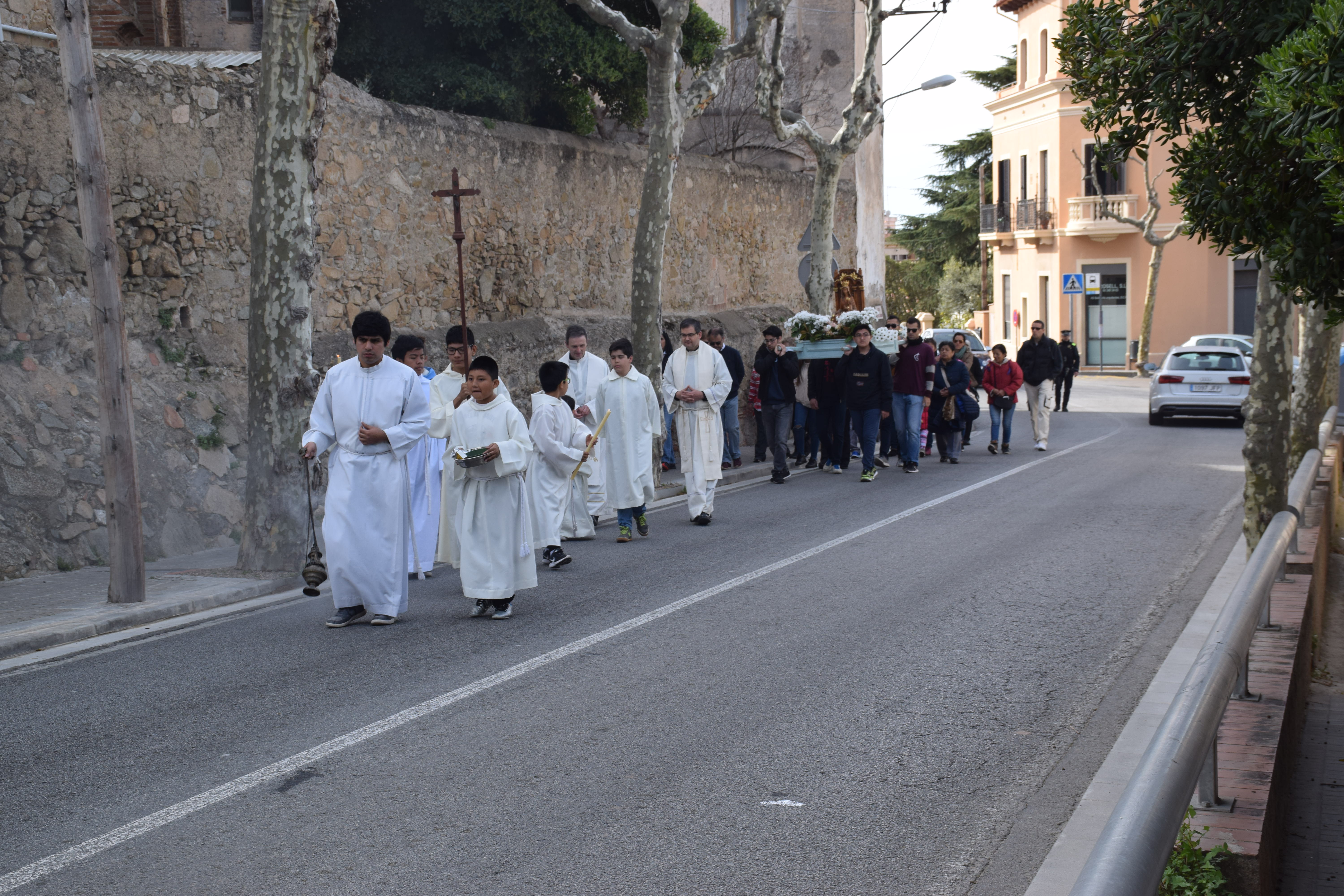 La processó ha sortit de la parròquia de Sant Cebrià, carretera amunt fins el camí Dalt d’Alella, acompanyada de persones cantant i tocant la guitarra: