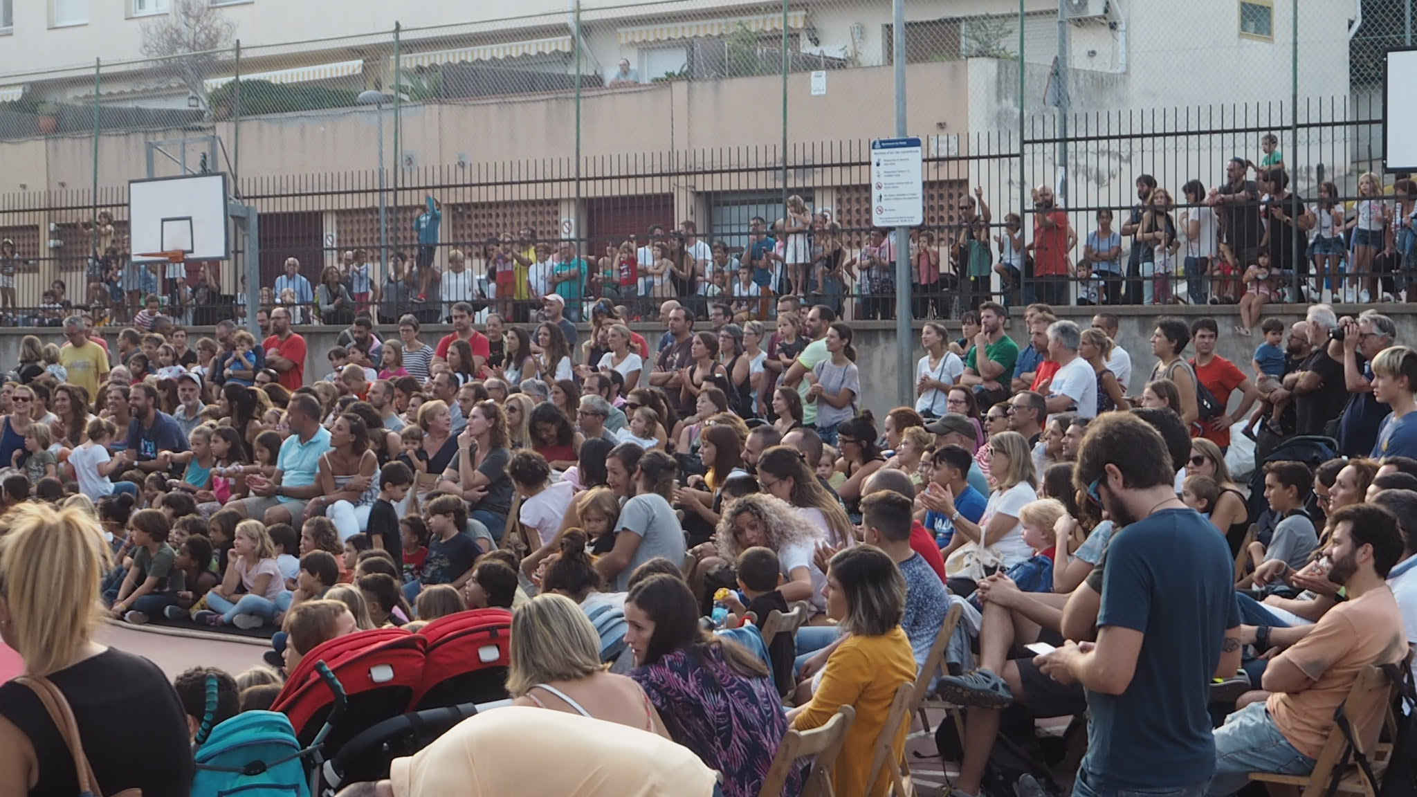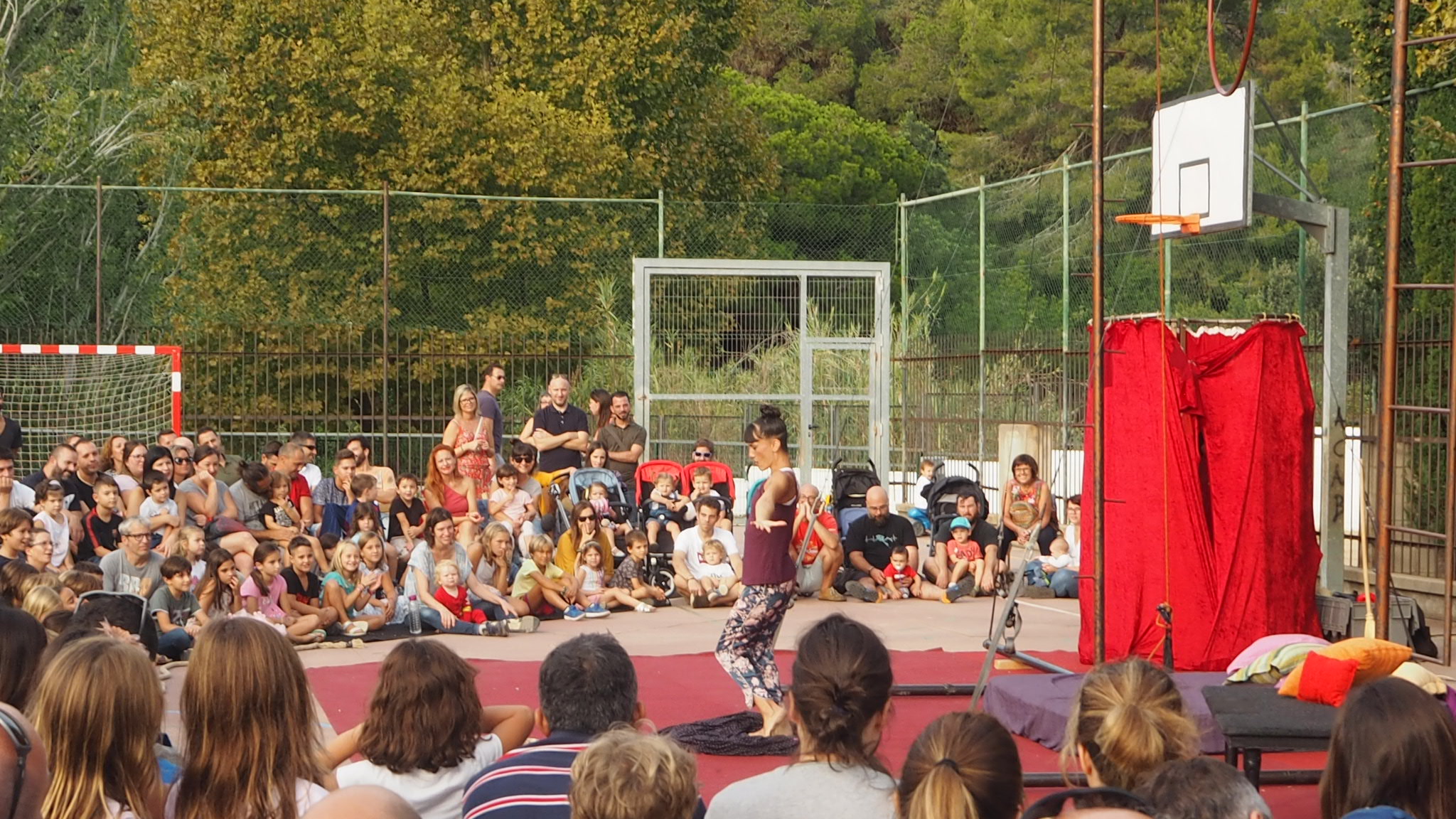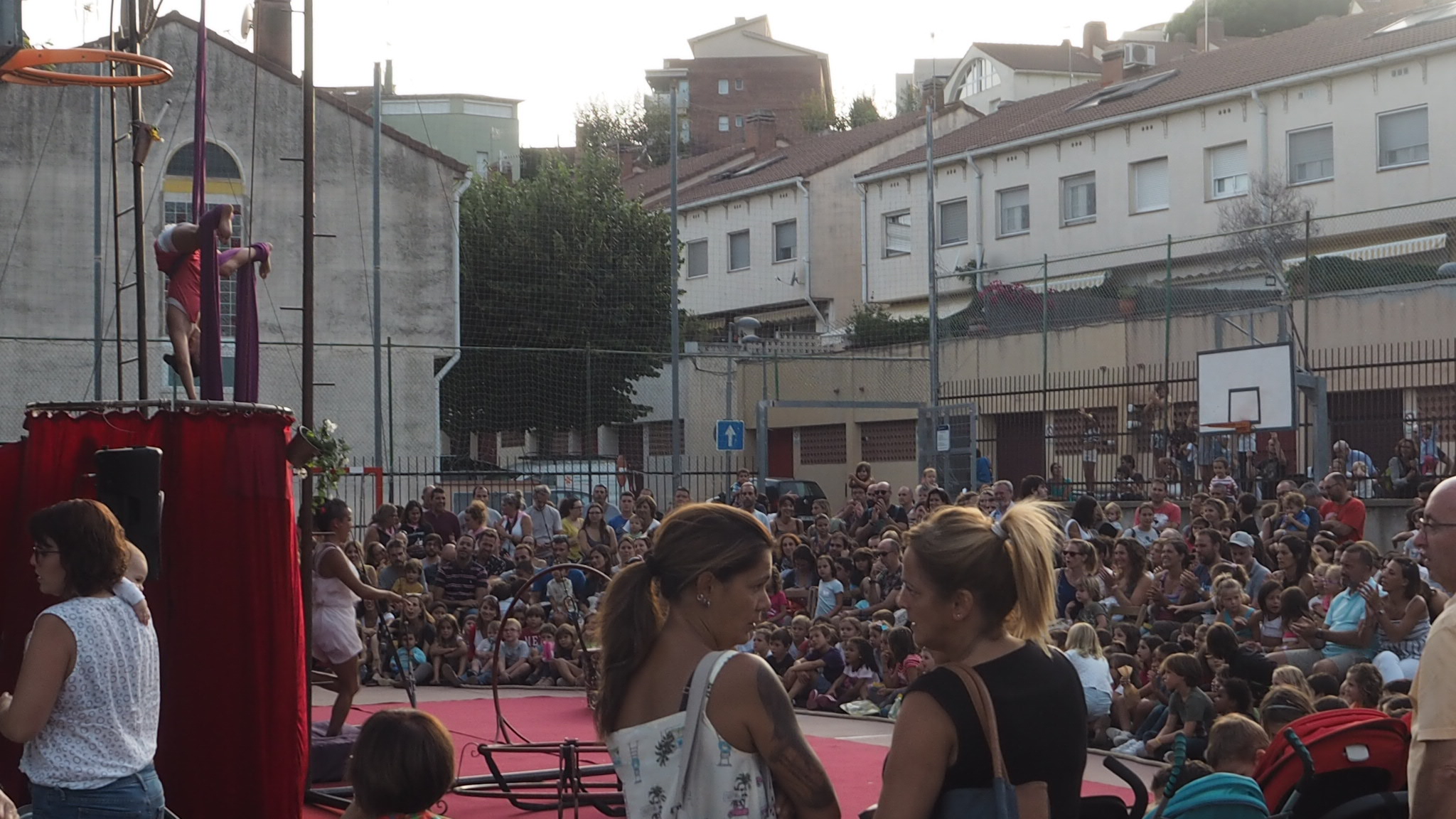 L’actuació aquí a Tiana és el clar exemple del bon funcionament entre el públic i les seves acrobàcies. Unes 200 persones omplien tant el pati de l’escola que hi havia un gran nombre de nens i nenes veient-ho des de fora.