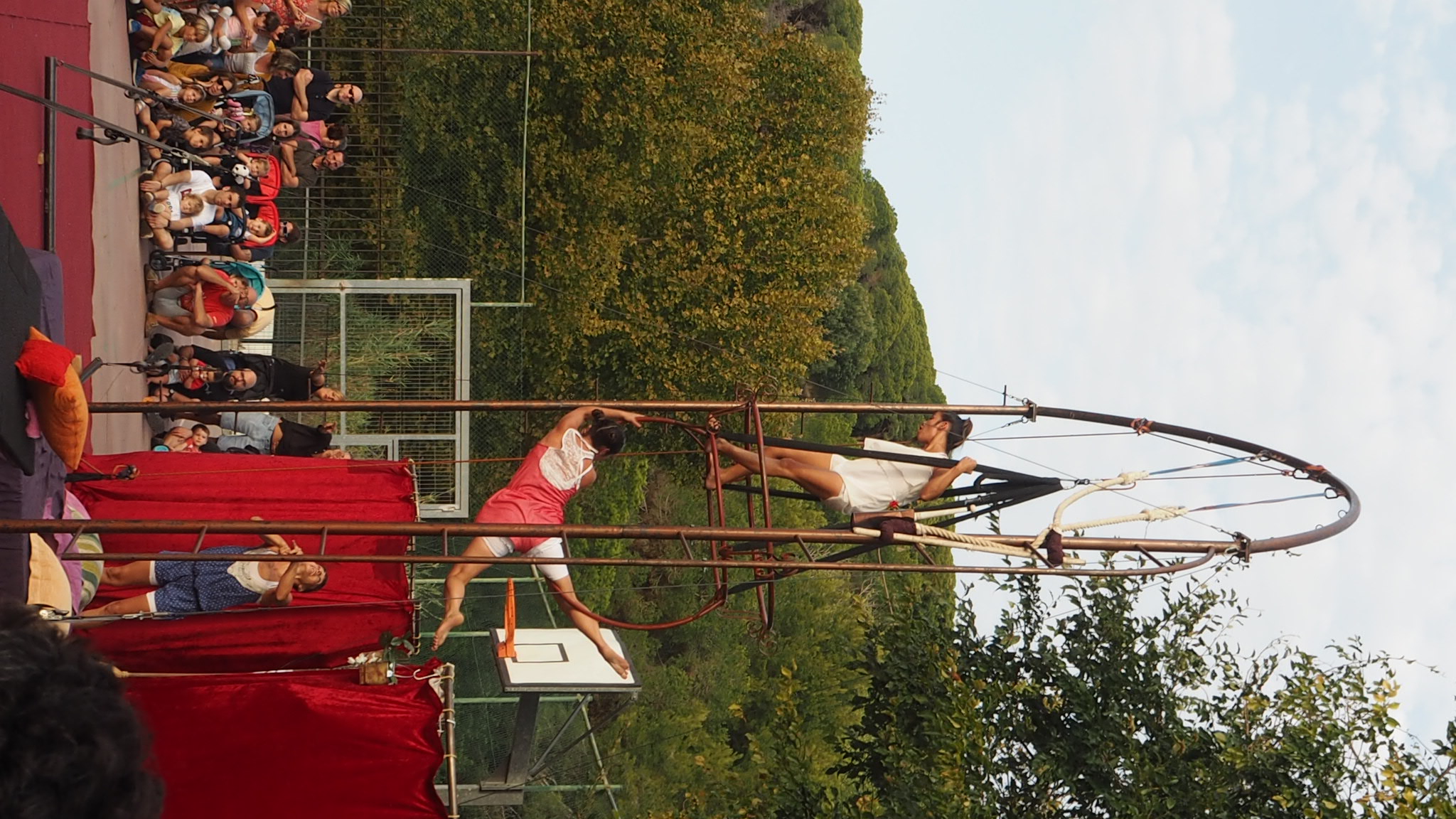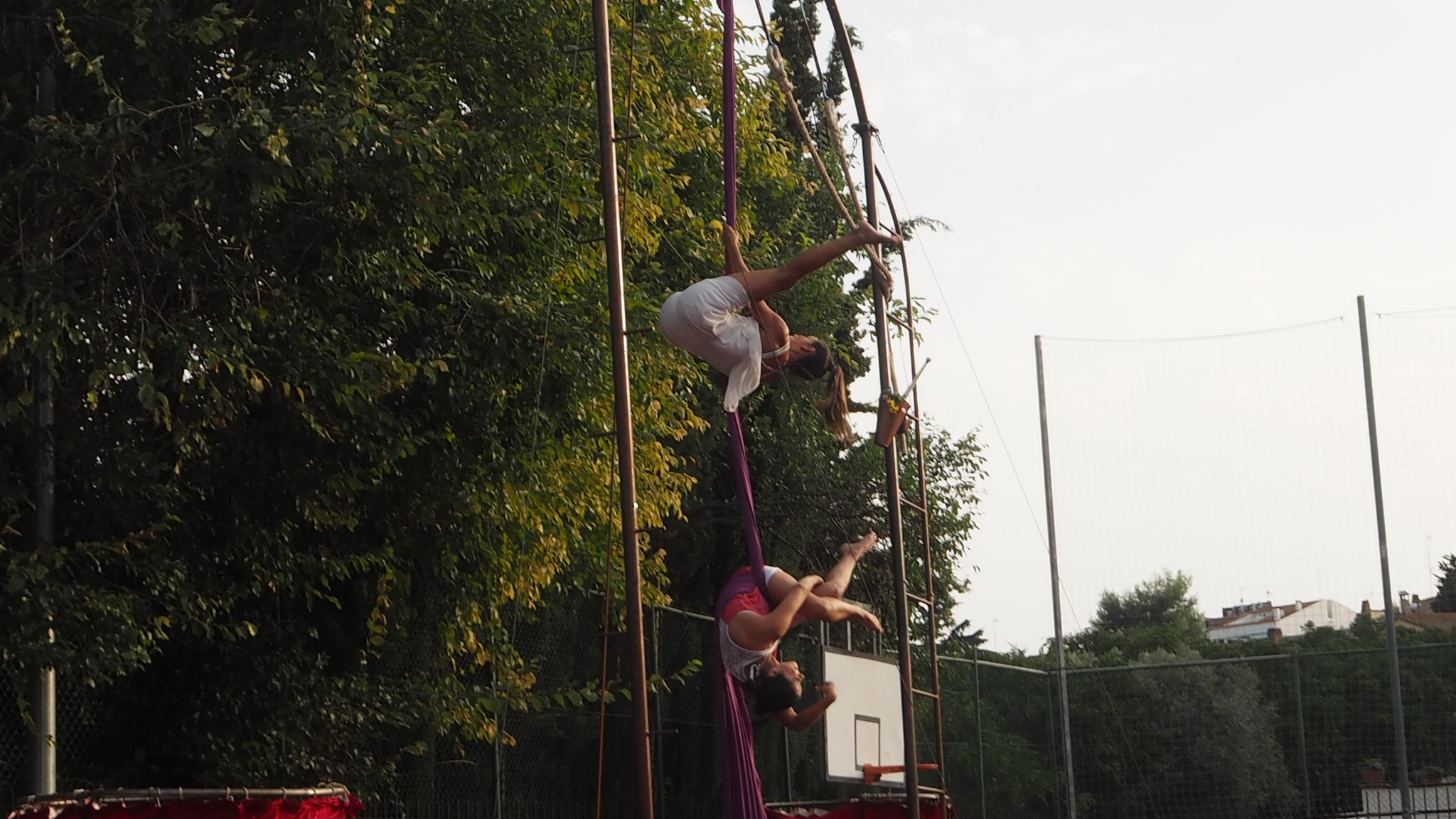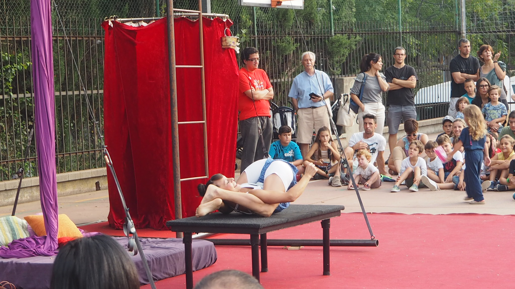 L’actuació aquí a Tiana és el clar exemple del bon funcionament entre el públic i les seves acrobàcies. Unes 200 persones omplien tant el pati de l’escola que hi havia un gran nombre de nens i nenes veient-ho des de fora.