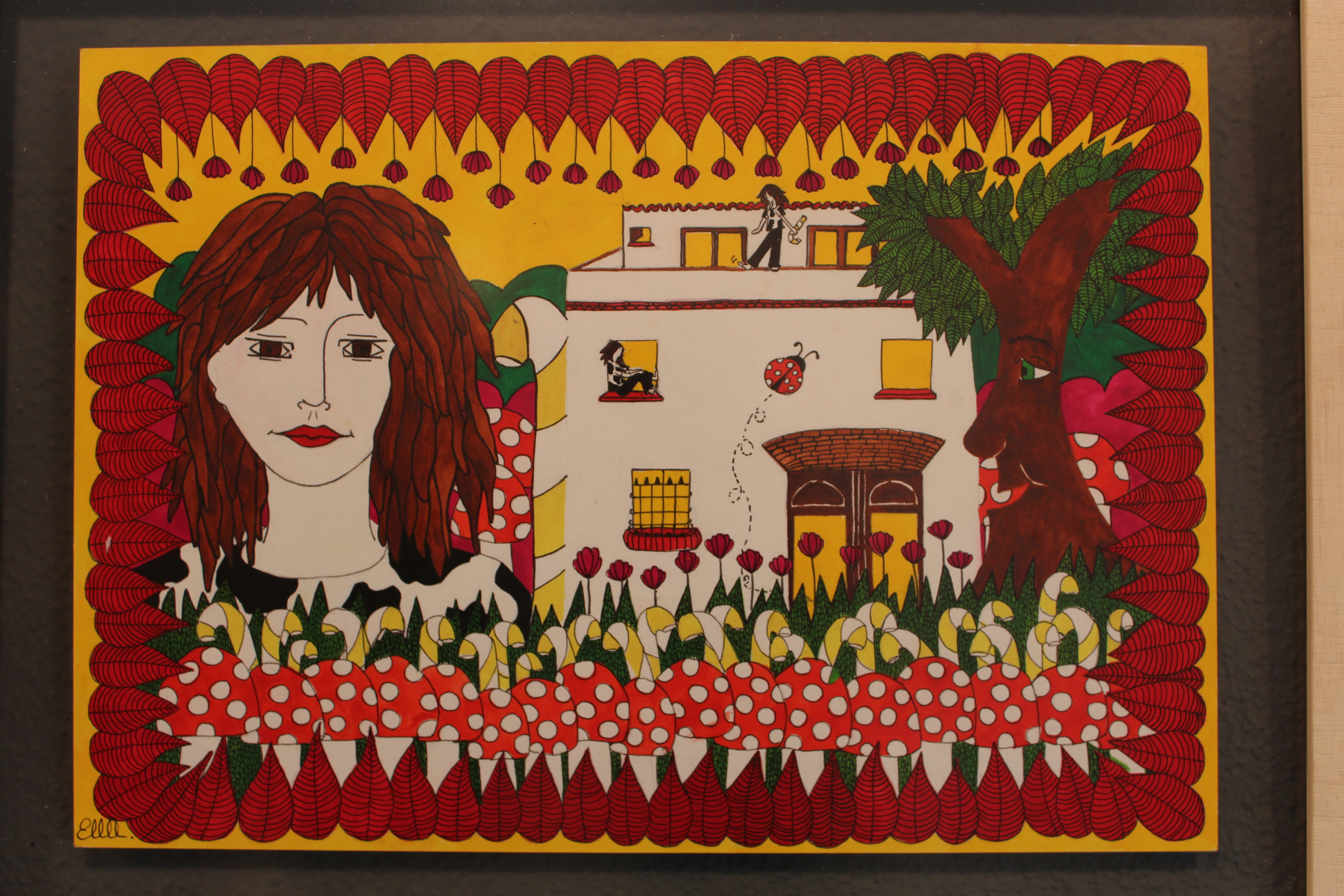 Les principals influències de l’estil d’Elena Llongueras són ben diverses: la cultura maia, la llibertat del moviment hippie i el rock simfònic. Aquesta música, central a la seva vida, ha estat el que l’ha inspirat per pintar gairebé tots els quadres de l’exposició que aquests dies es pot veure a Tiana.