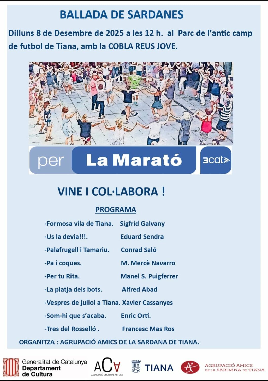 L’Agrupació Amics de la Sardana de Tiana es suma a les activitats emmarcades en la Marató d’aquest 2025 amb una ballada de sardanes. La Cobla Reus Jove vindrà el dilluns 8 de desembre a les dotze del migdia al Parc de l’antic camp de futbol per fer sonar i ballar sardanes com Formosa vila de Tiana, Per tu Rita o Vespres de juliol a Tiana.