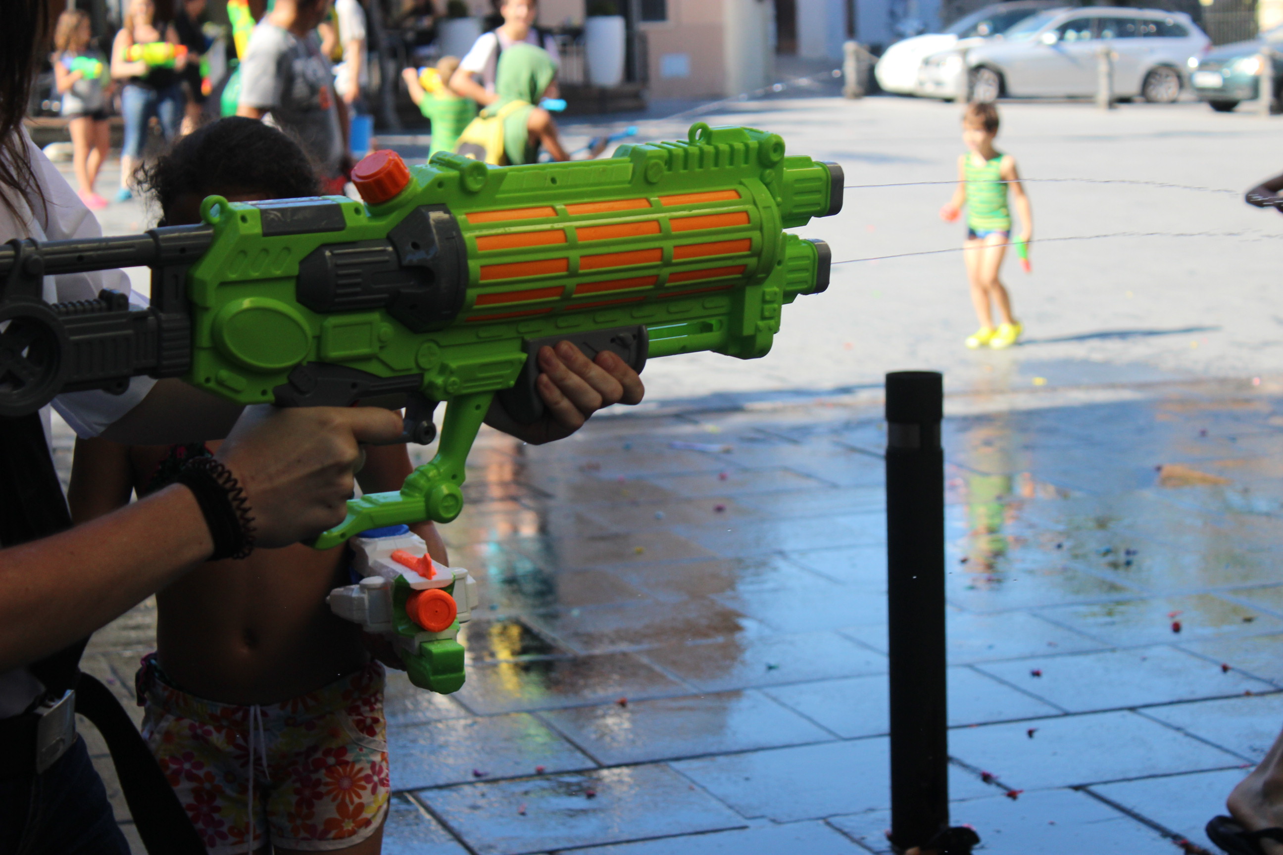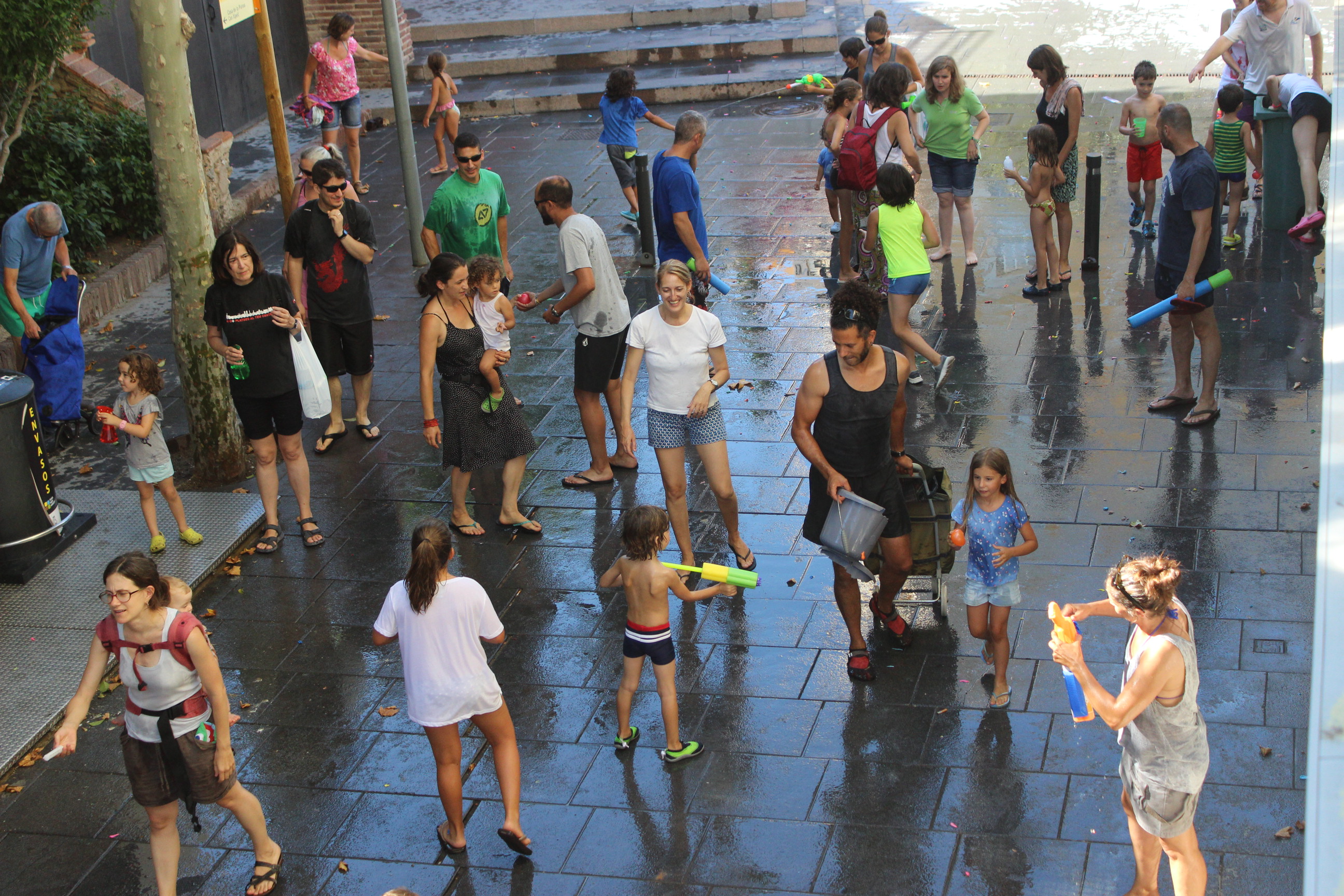 17:14. Com gat escaldat amb aigua tèbia en té prou, ens allunyem dels pistolers d’aigua com en Lluís. L’acte no ha començat oficialment, però la canalla a prop de la Marga,  ja va xopa
