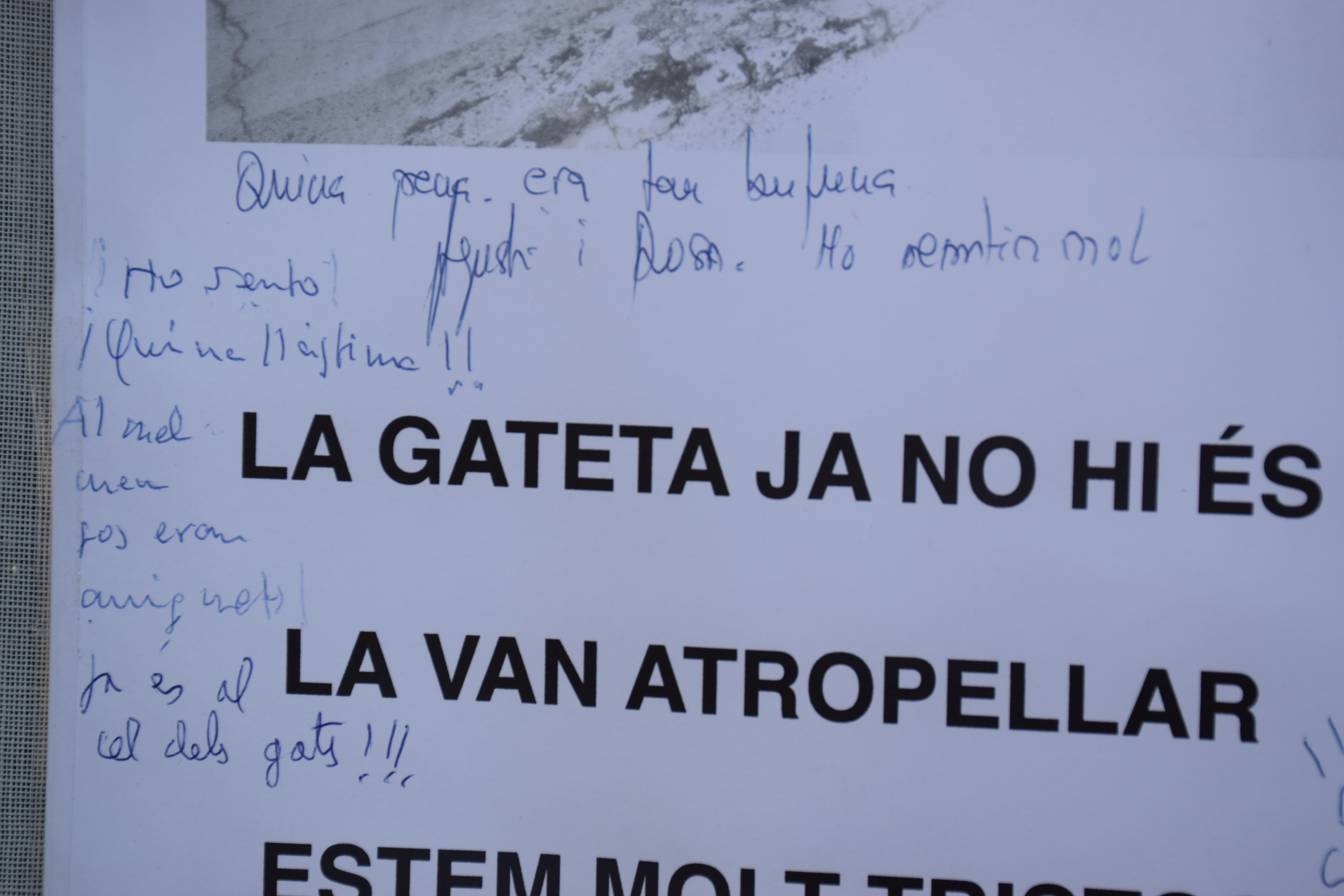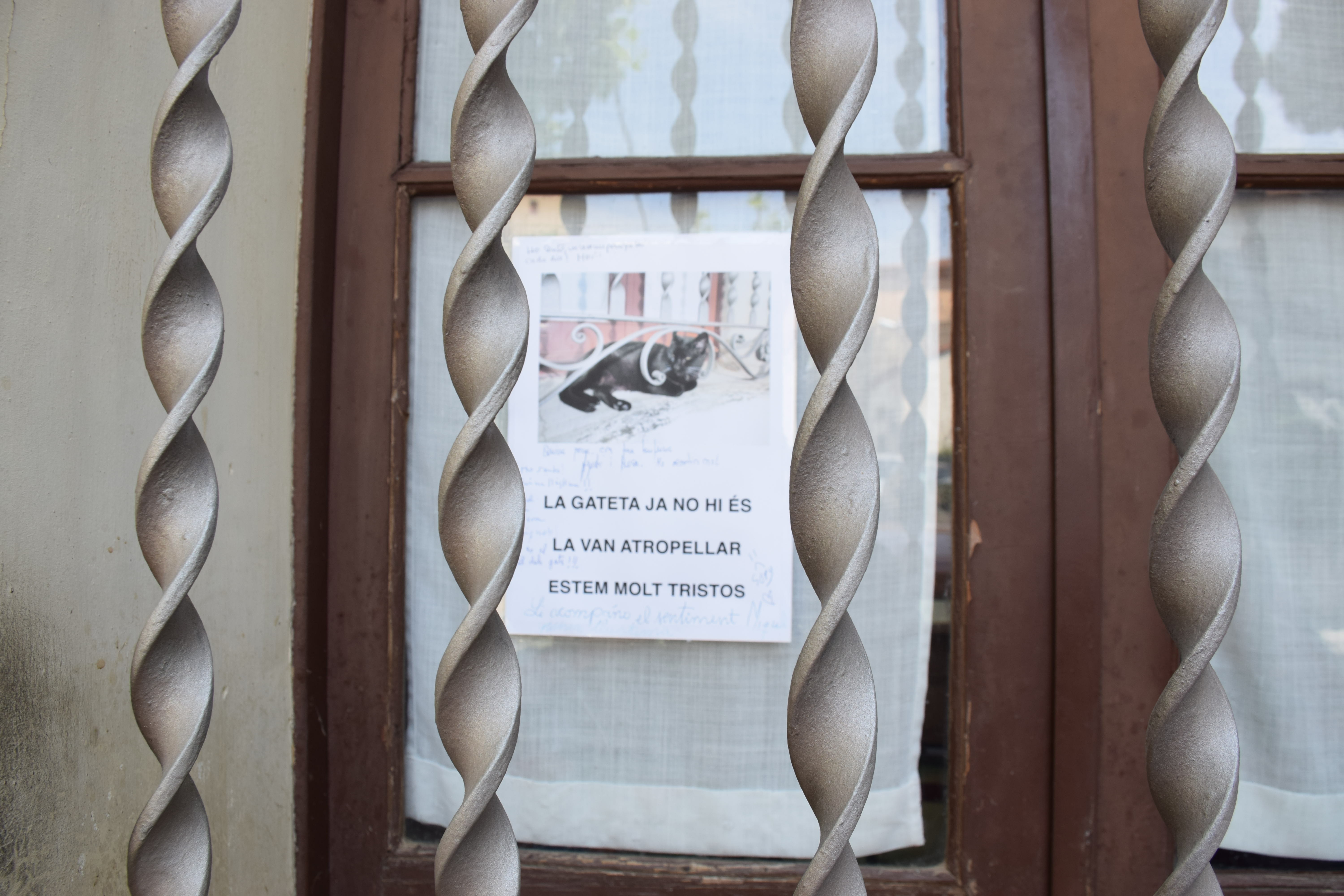 “Em semblava que tothom havia de saber-ho” explica la Iraida. Per això va col.locar el cartellet a la finestra davant de la qual “Gatitu” havia passat bona part dels seus darrers anys. En poques hores, algunes persones van escriure condolències al rètol mateix, d’altres van deixar flors a la finestra. Tmabé hi ha hagut qui li ha donat el condol en persona. I és que, sens dubte, era una gateta del poble.