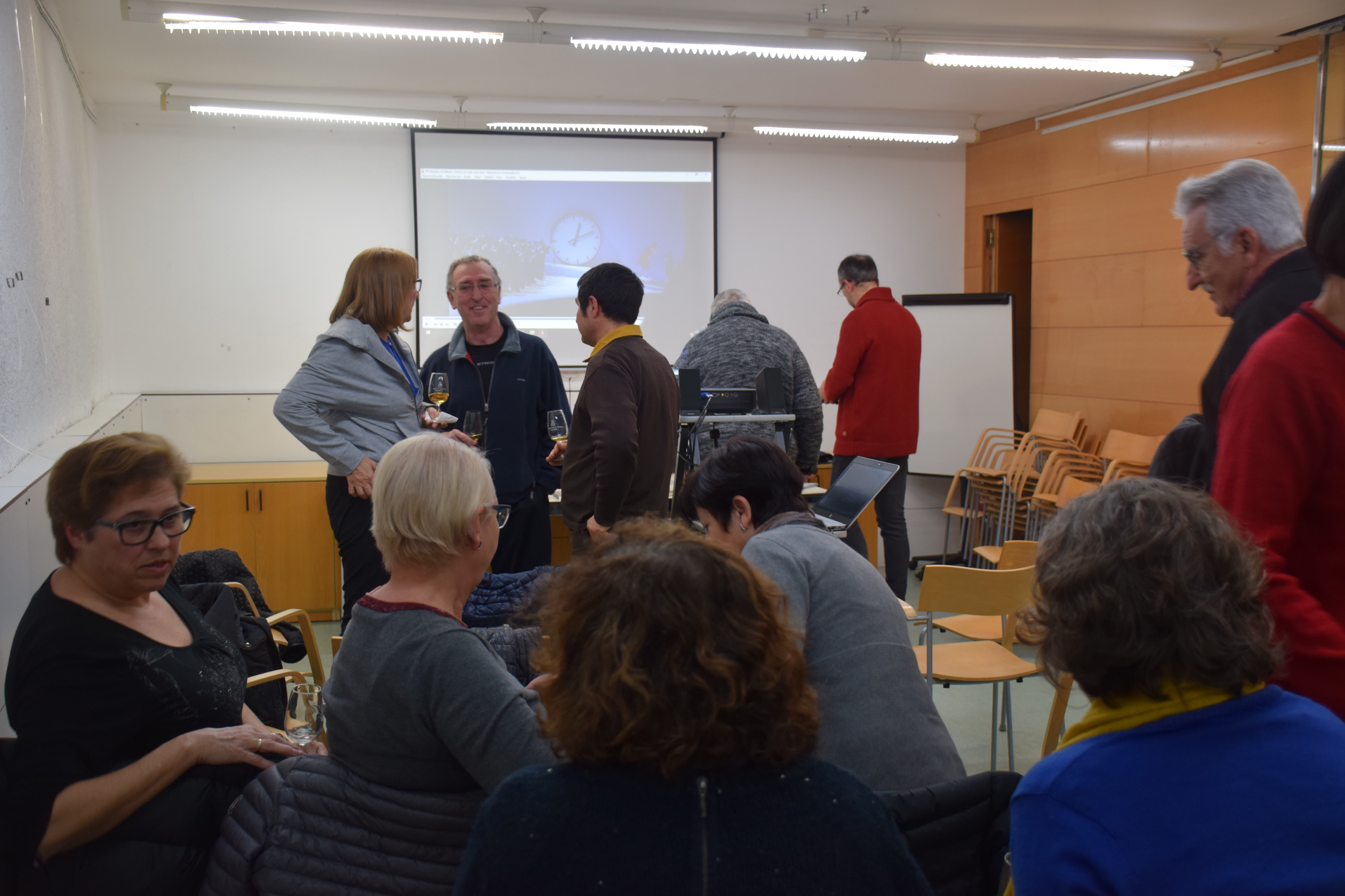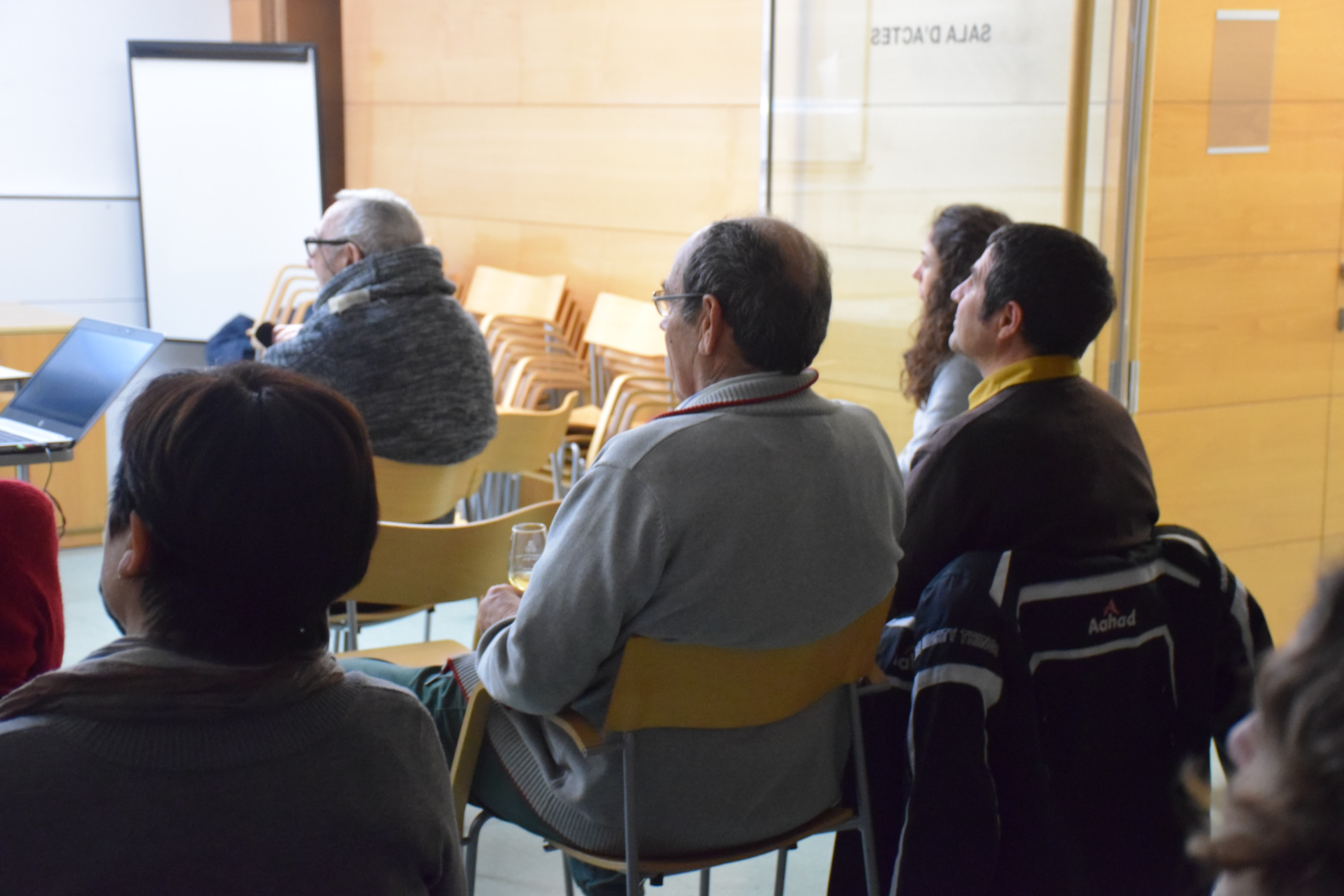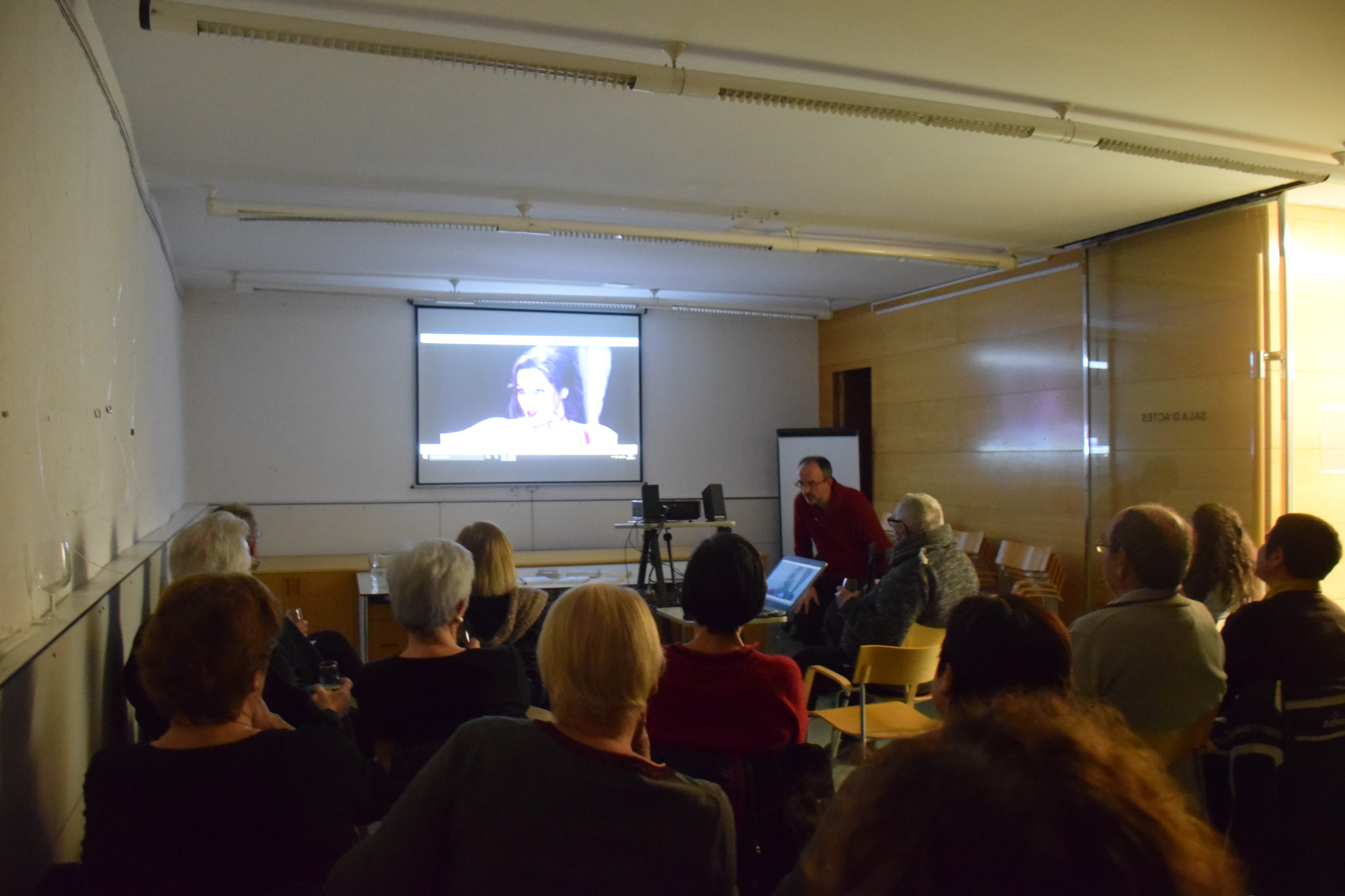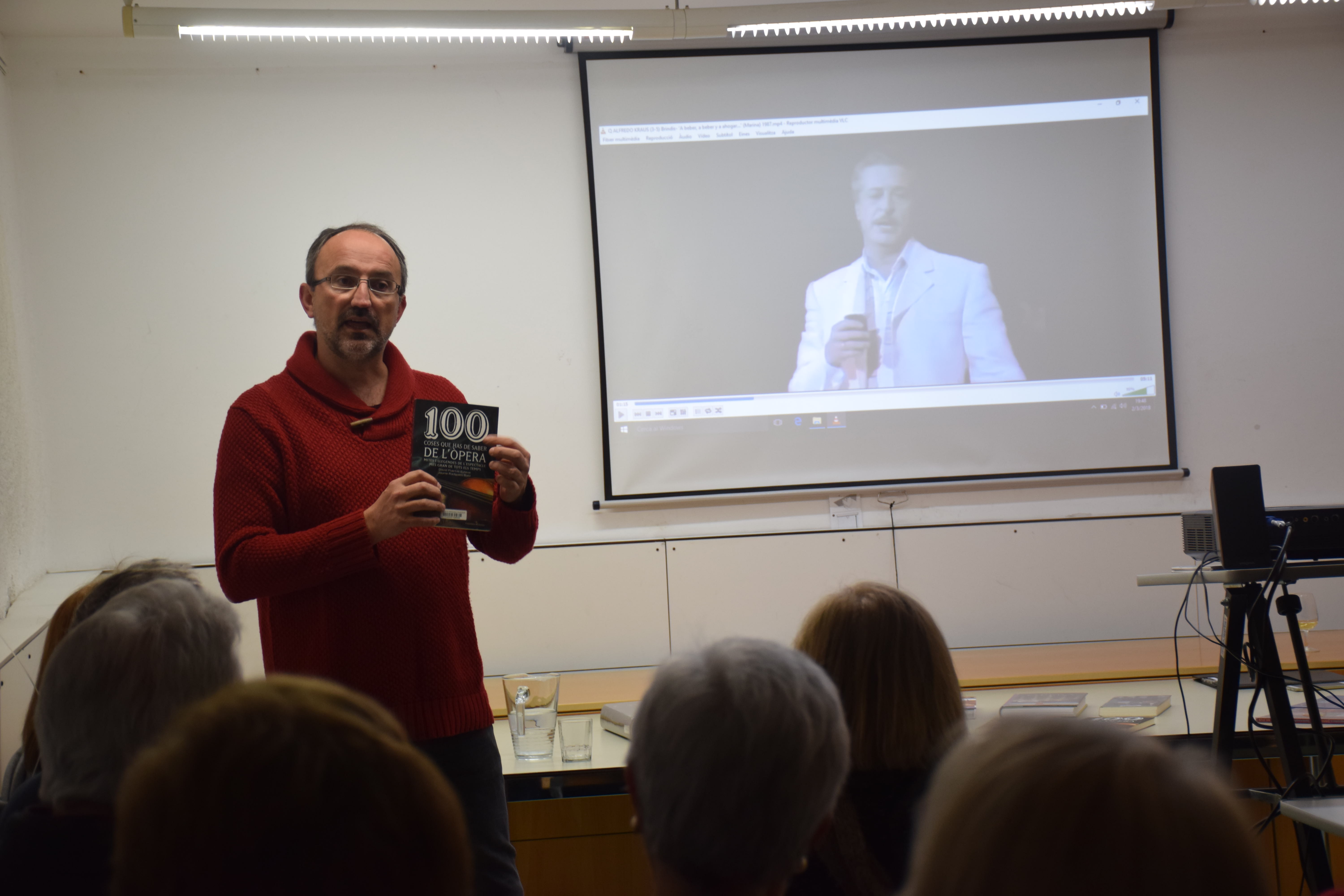 Totes les cadires que s’havien repartit per la sala estaven ocupades. Un projector i una pantalla mostraven un vídeo congelat esperant per reproduir-se. I en un costat de la sala, en una taula, hi havia copes de vi esperant a ser omplides. Aquest era l’aspecte de la Sala d’Actes de la Biblioteca de Can Baratau aquest divendres 2 de març a les set de la tarda. El músic, periodista i divulgador musical David Puertas estava a punt de començar la seva xerrada que, tal com avançava l’escenografia, venia acompanyada d’audicions de fragments d’òpera i un tast de vins a càrrec del Celler Quim Batlle.