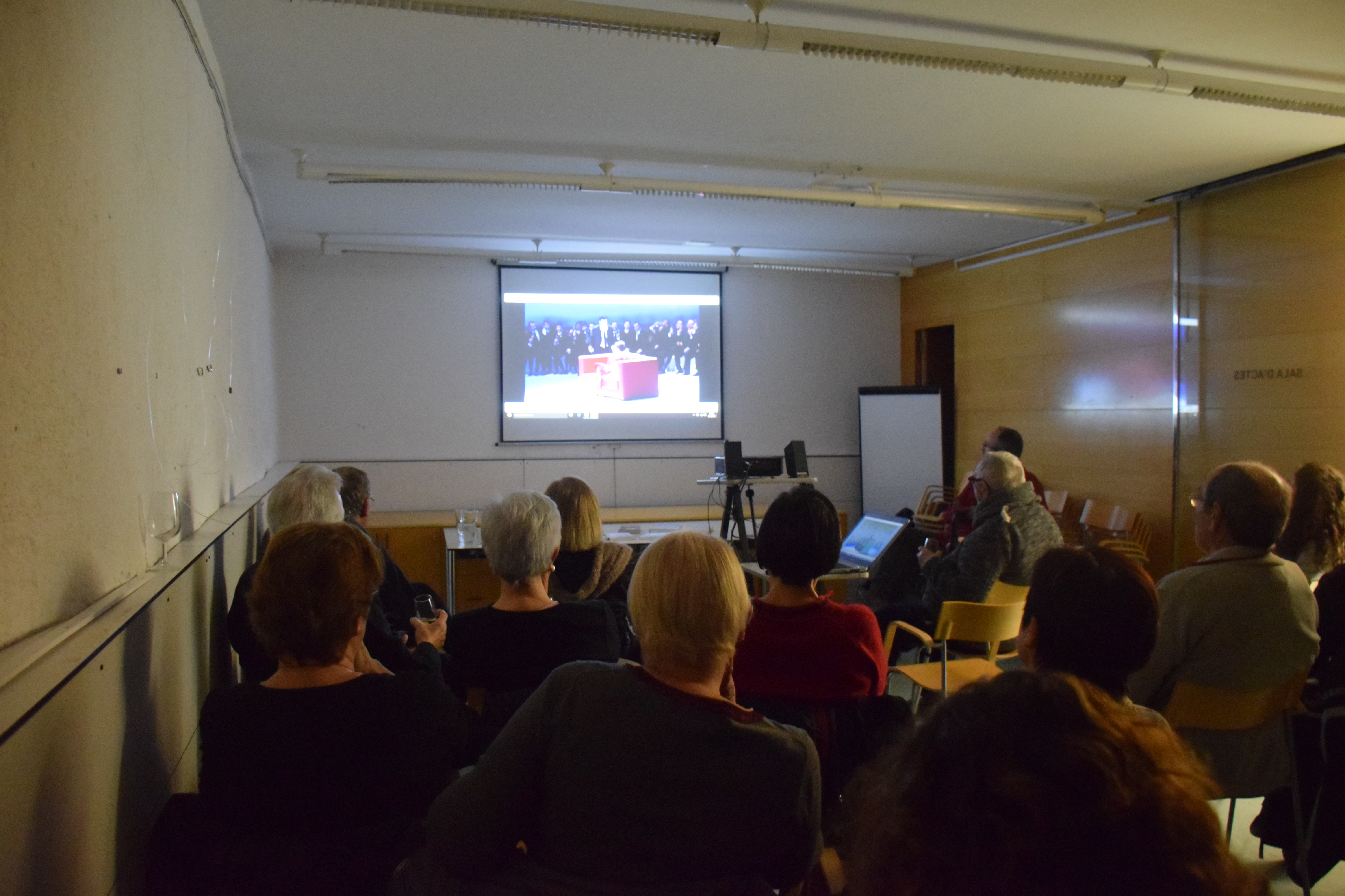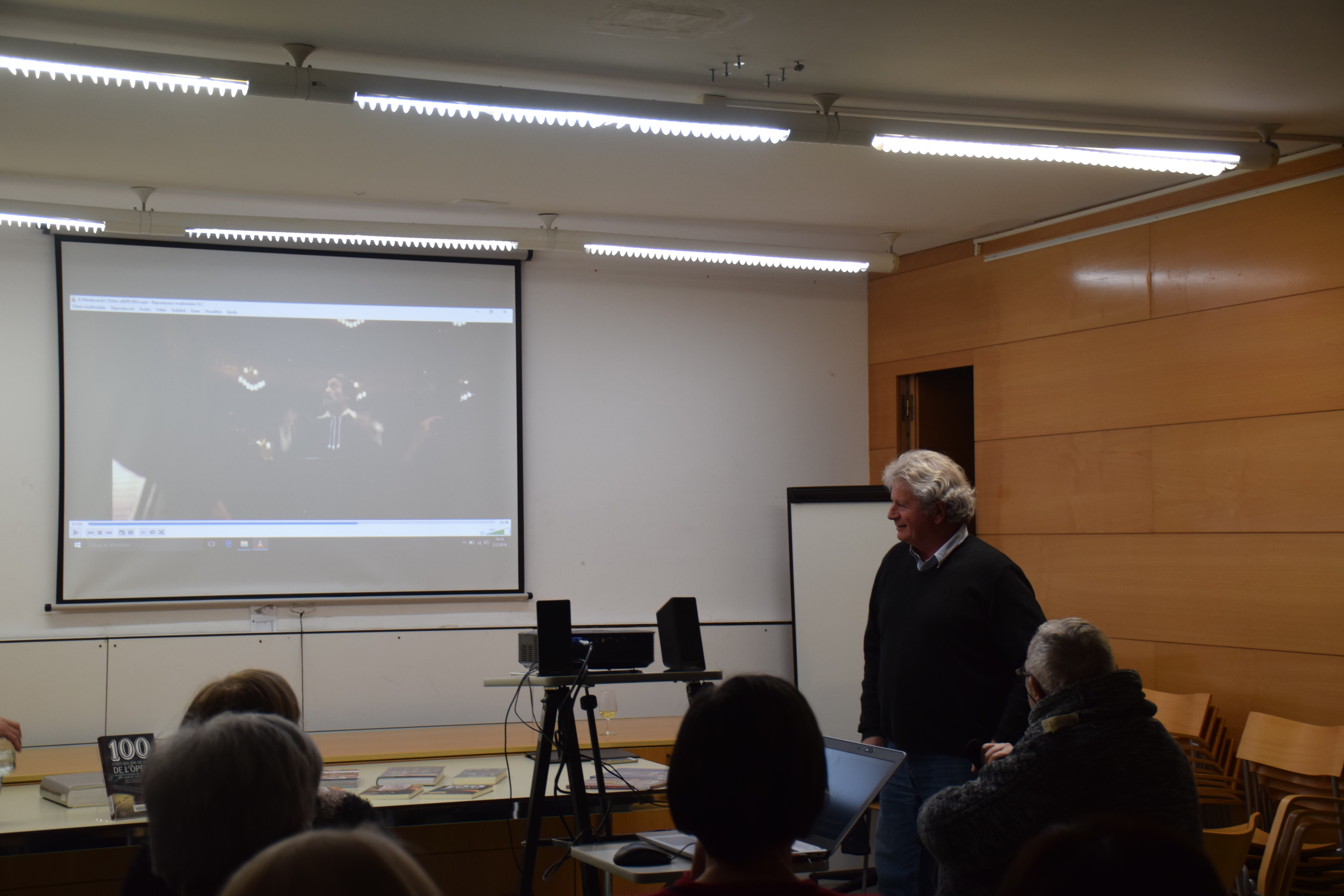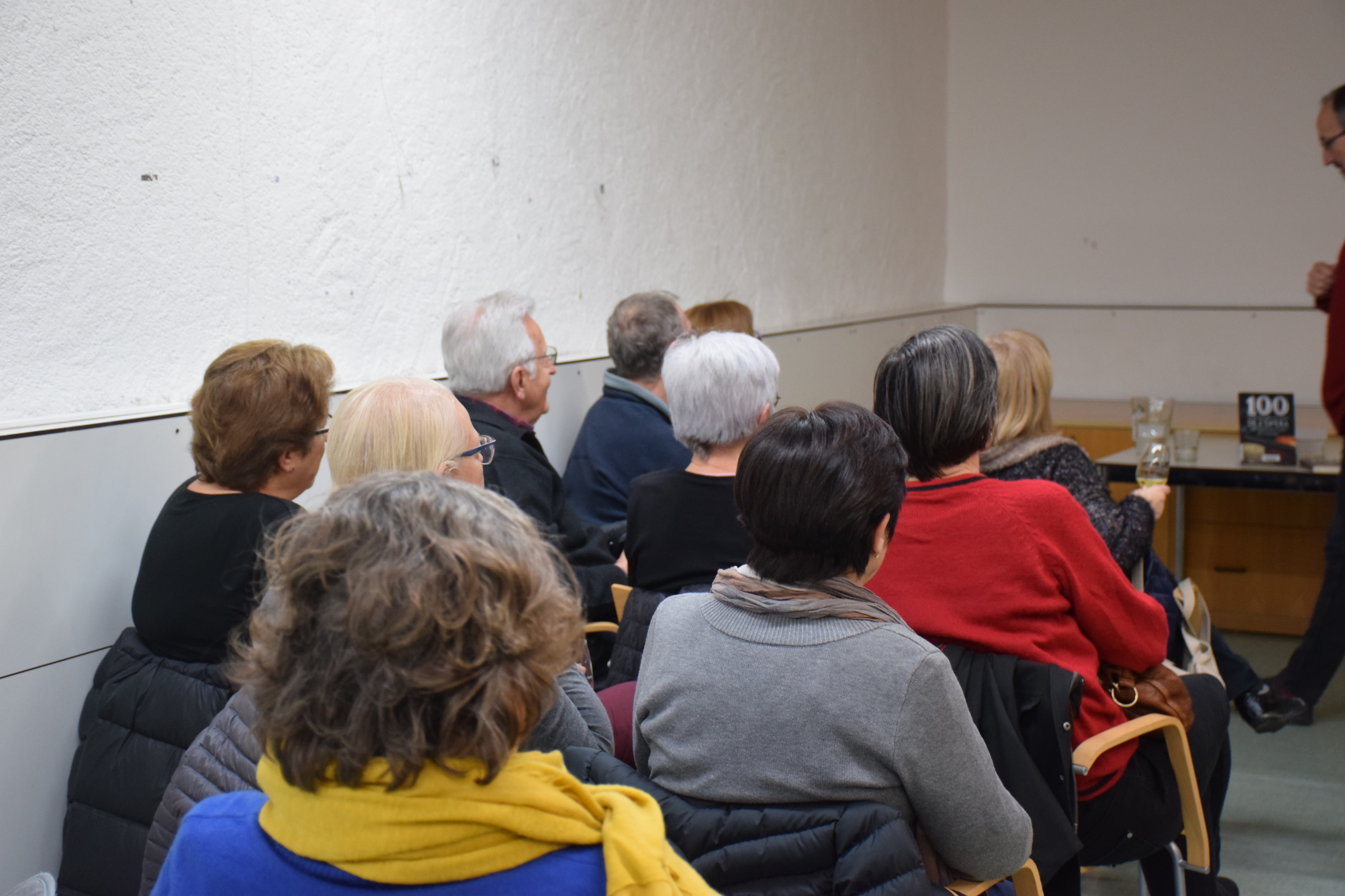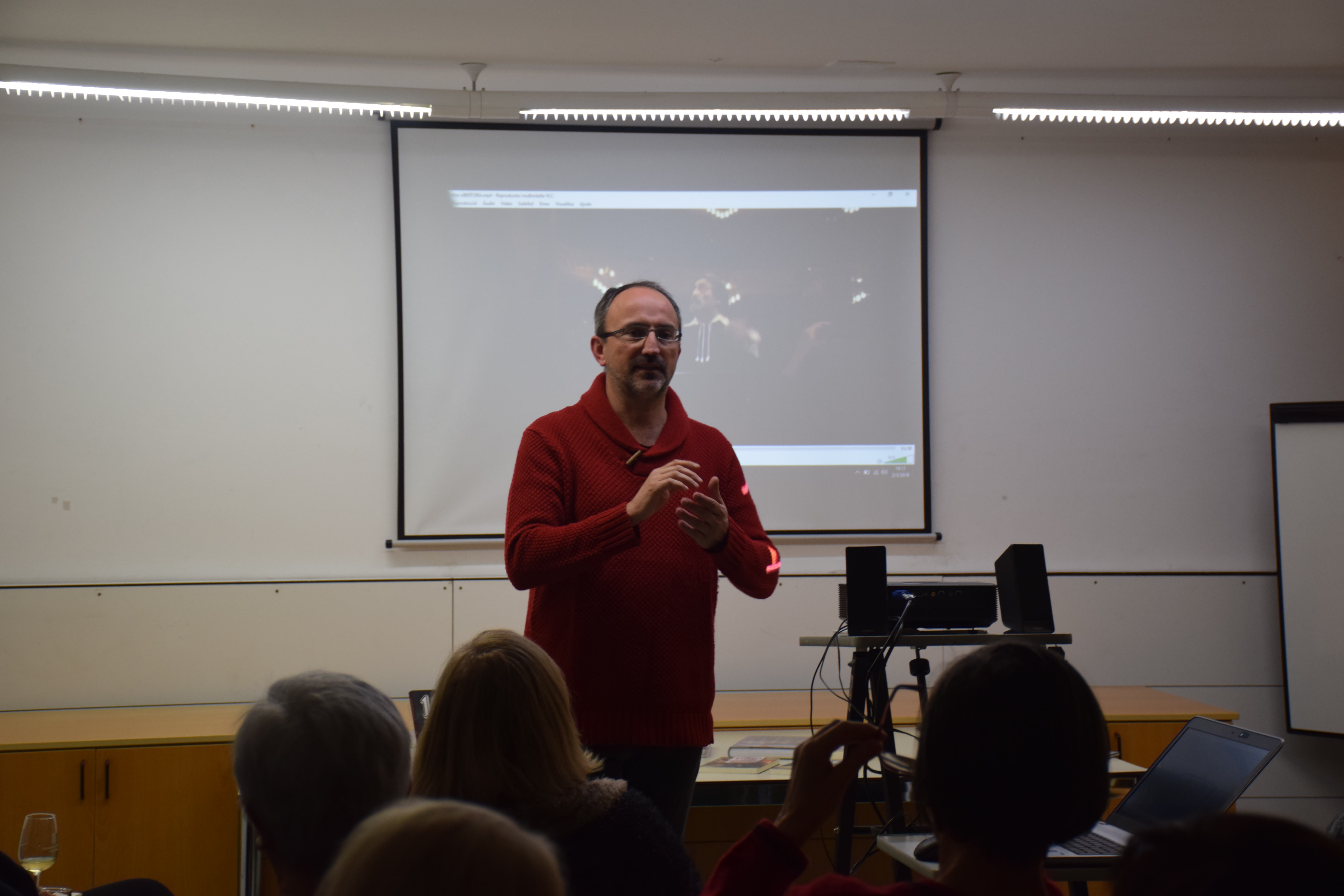 Totes les cadires que s’havien repartit per la sala estaven ocupades. Un projector i una pantalla mostraven un vídeo congelat esperant per reproduir-se. I en un costat de la sala, en una taula, hi havia copes de vi esperant a ser omplides. Aquest era l’aspecte de la Sala d’Actes de la Biblioteca de Can Baratau aquest divendres 2 de març a les set de la tarda. El músic, periodista i divulgador musical David Puertas estava a punt de començar la seva xerrada que, tal com avançava l’escenografia, venia acompanyada d’audicions de fragments d’òpera i un tast de vins a càrrec del Celler Quim Batlle.