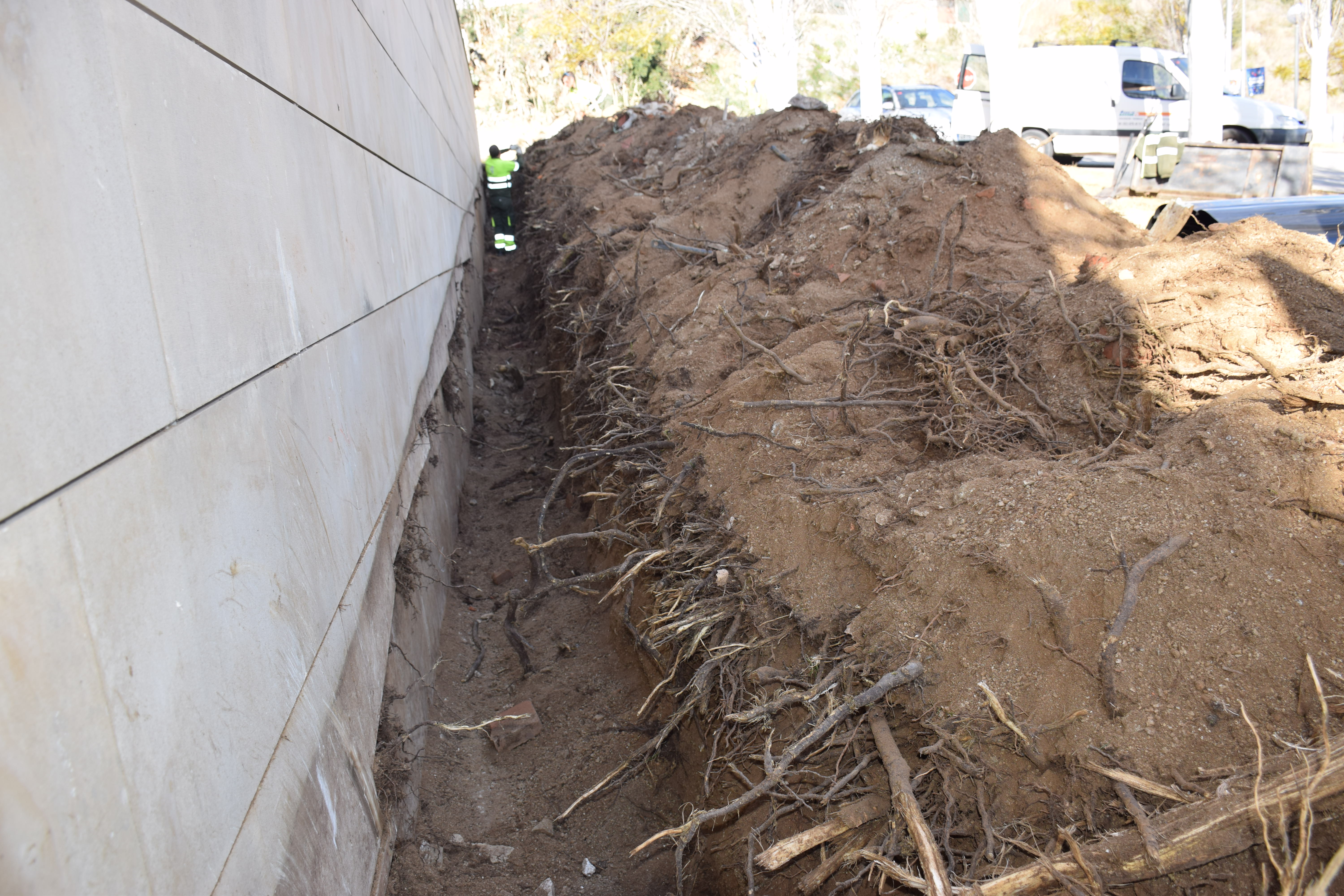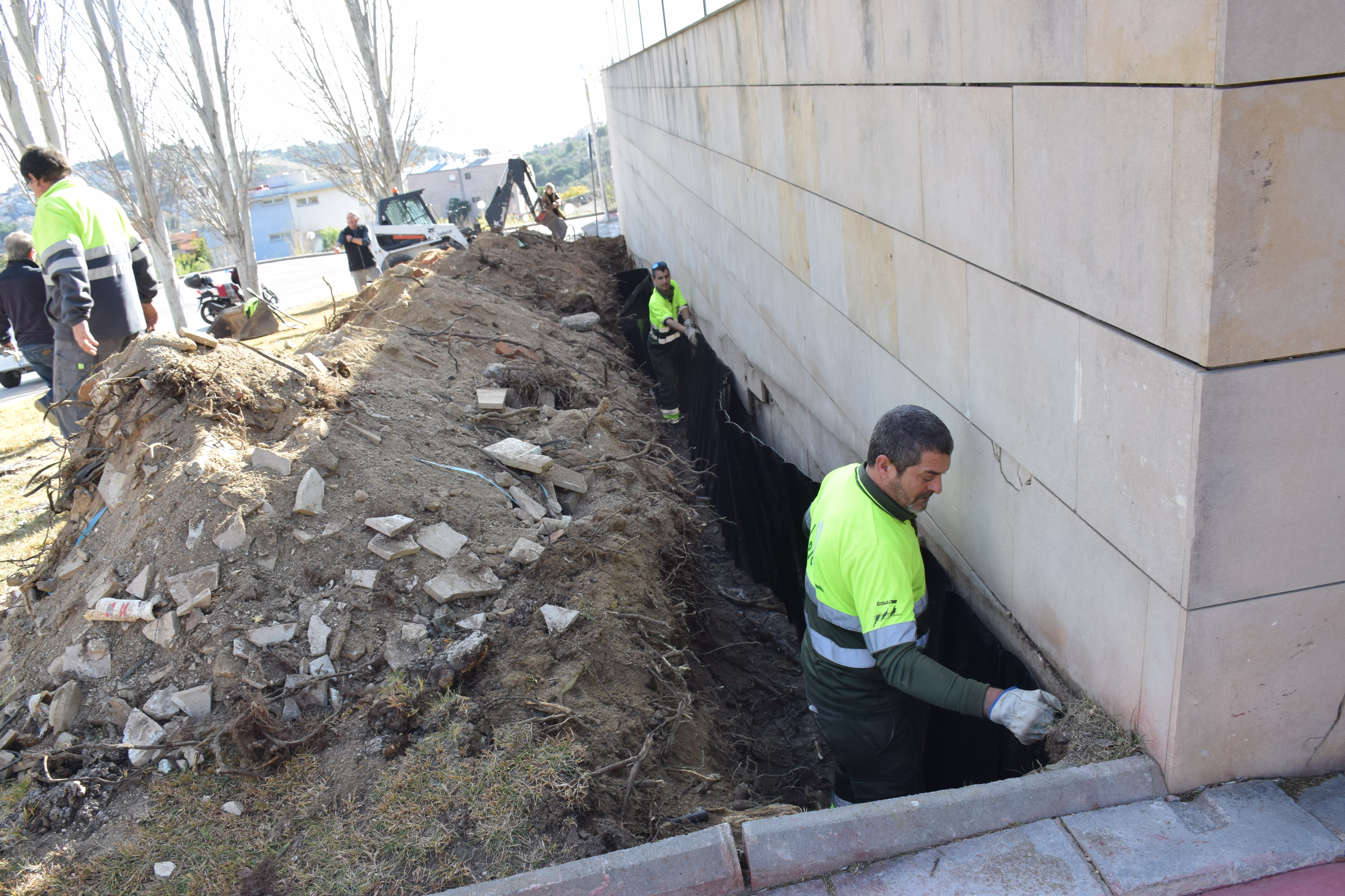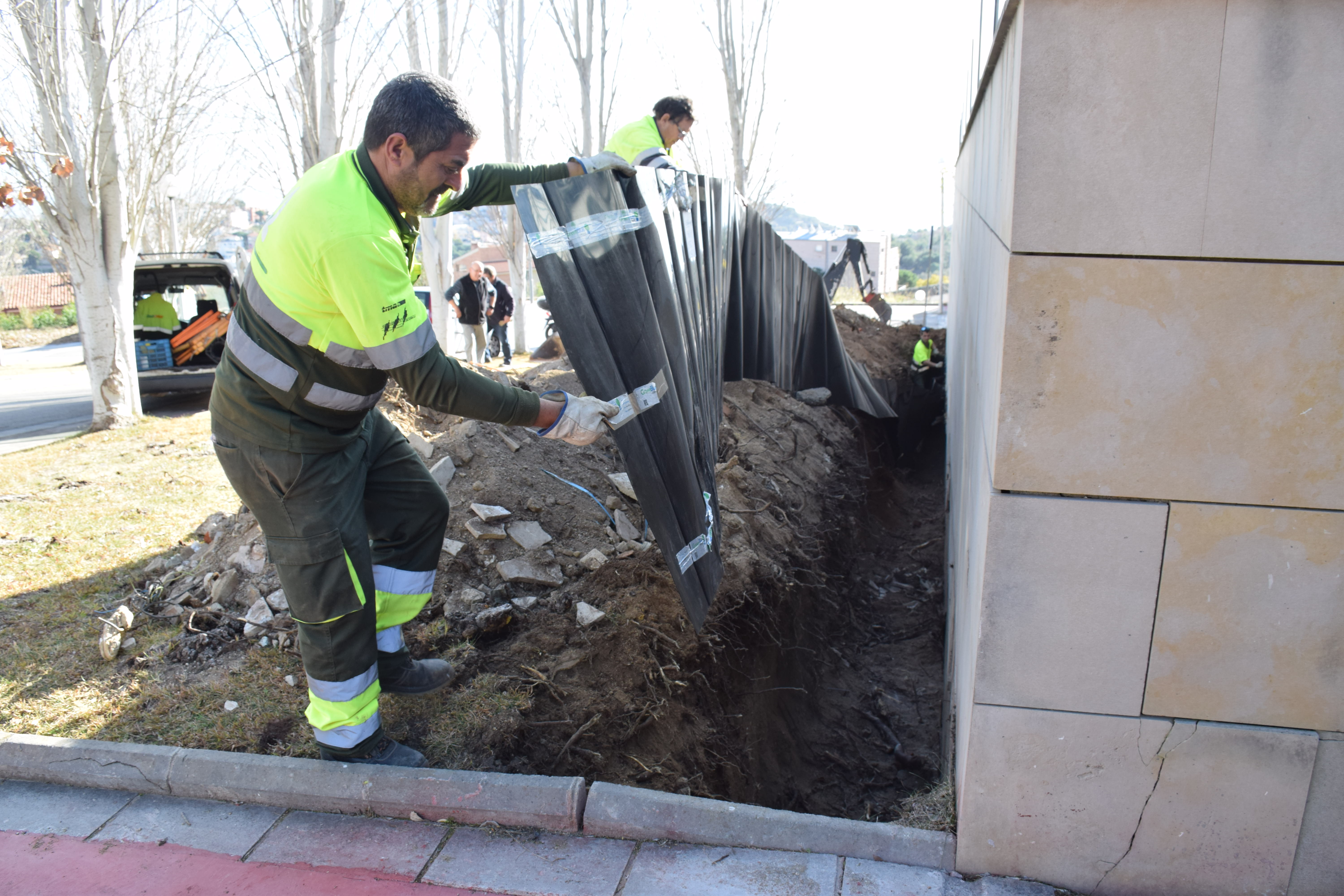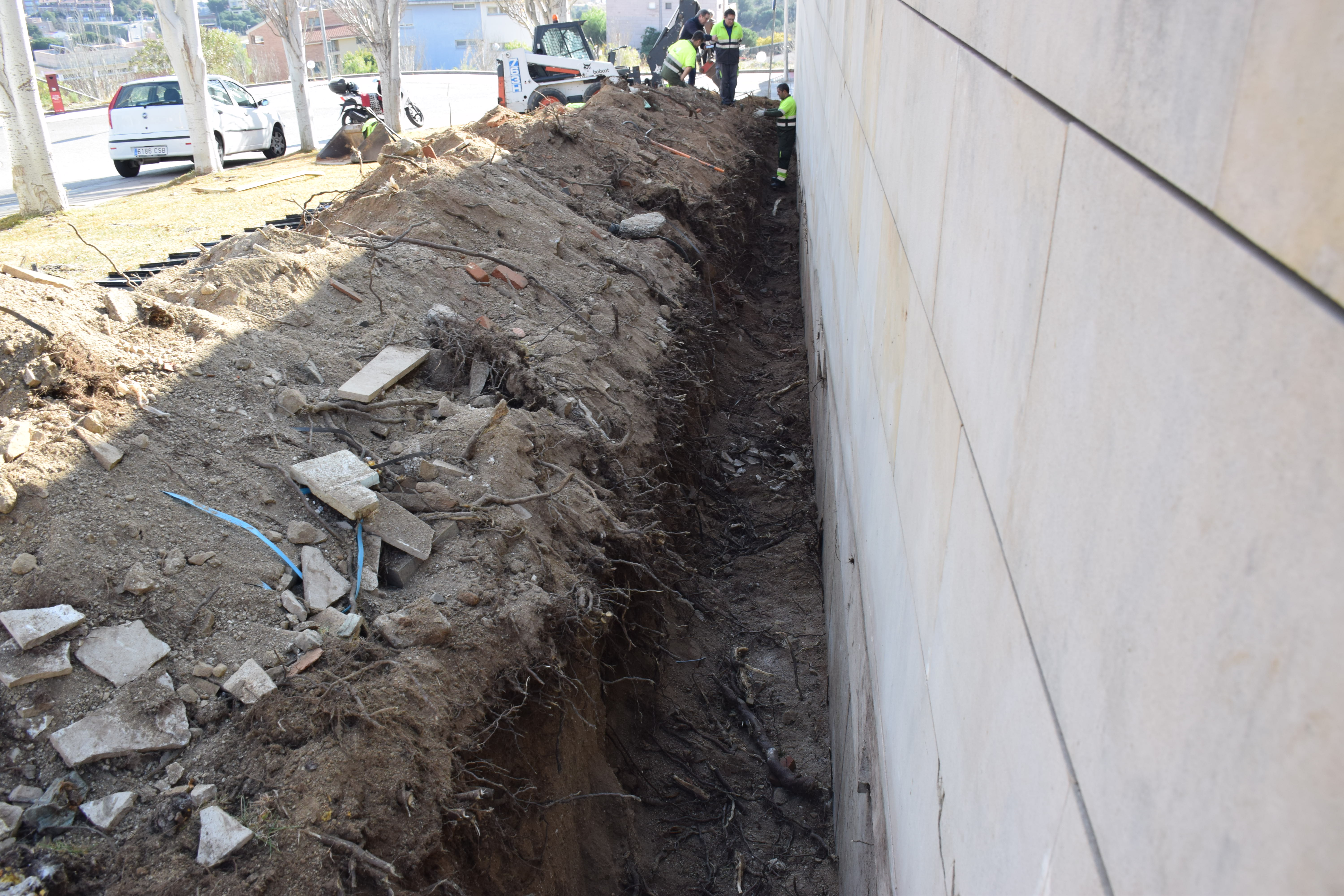 La intervenció, asseguren els operaris, no afecta els arbres: només els desvia les arrels i els brots.