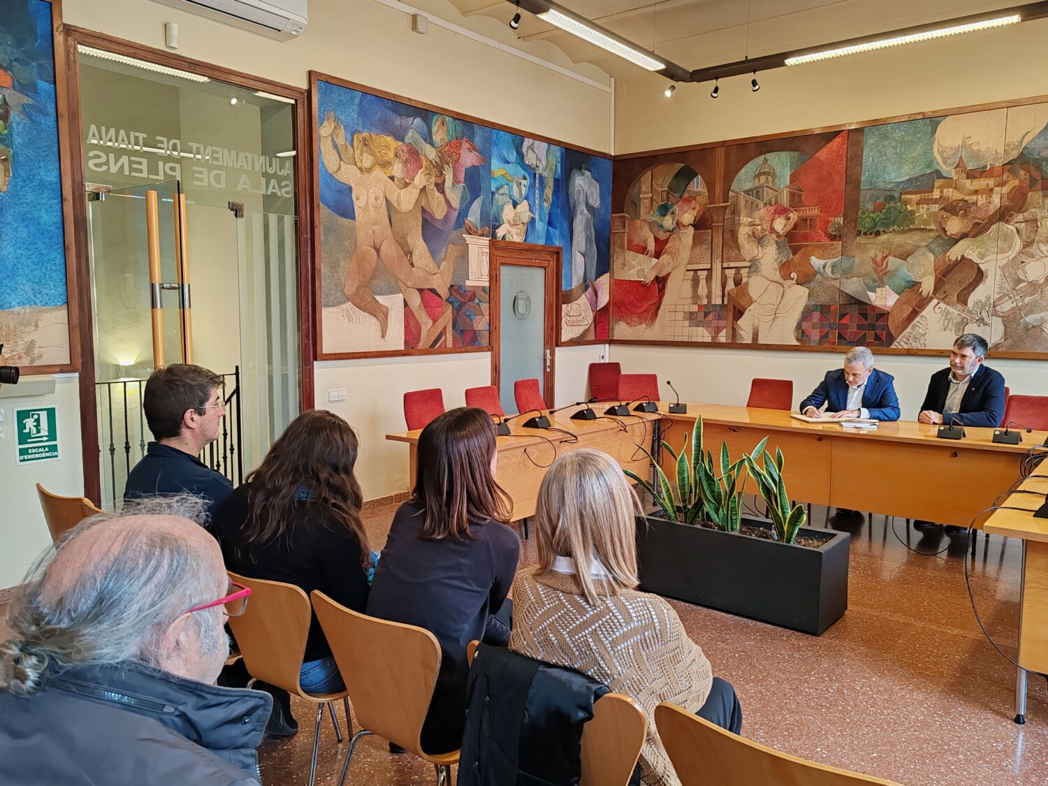 La visita institucional ha acabat a la Sala de Plens amb la signatura del Llibre d’Honor, que ha comptat amb la presència del regidor d’Acció climàtica i Mobilitat, Andrés Ortiz; la regidora del PSC, Mercè Serrano; i el primer secretari dels Socialistes de Tiana, Ferran Vallespinós.