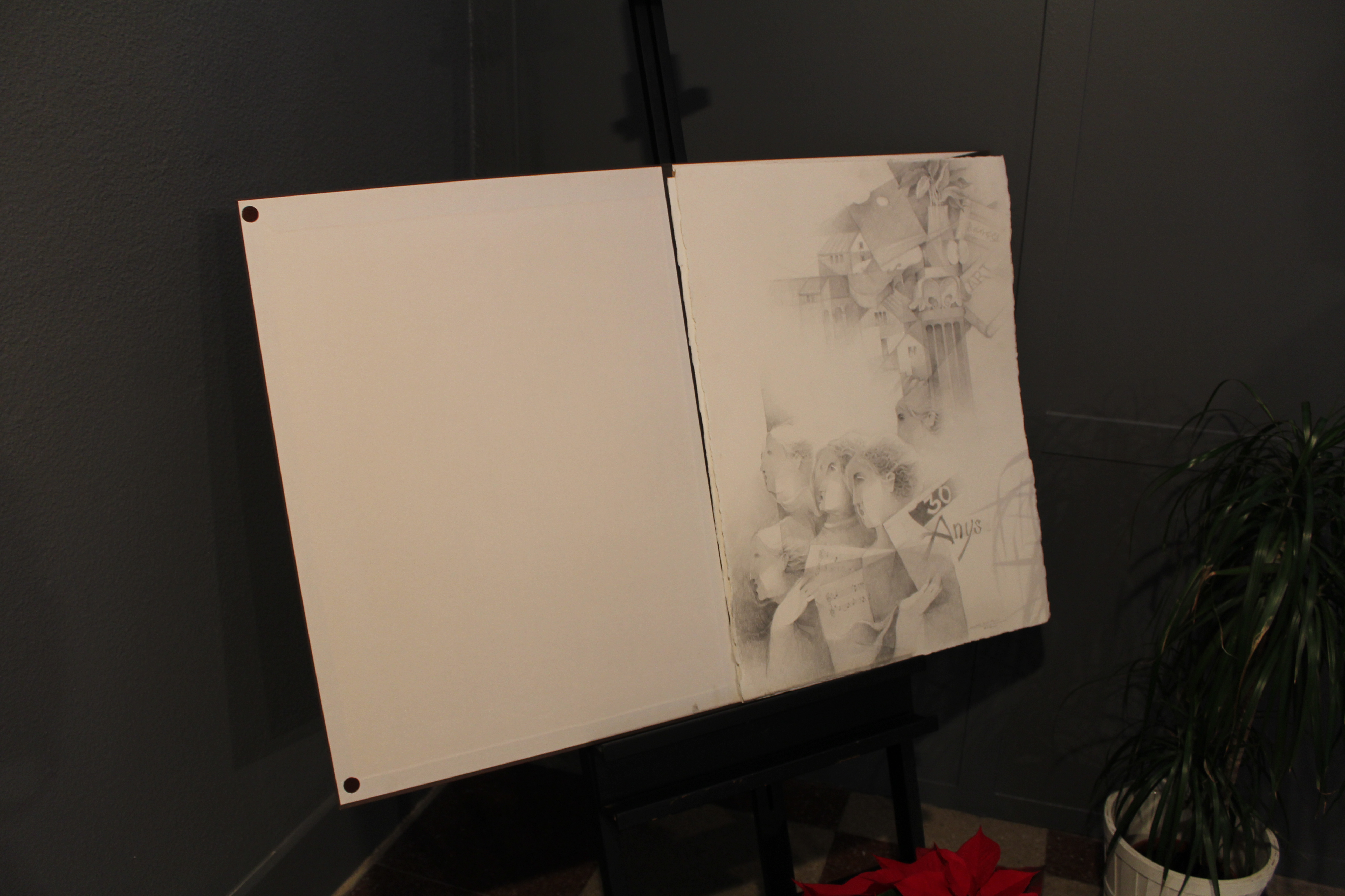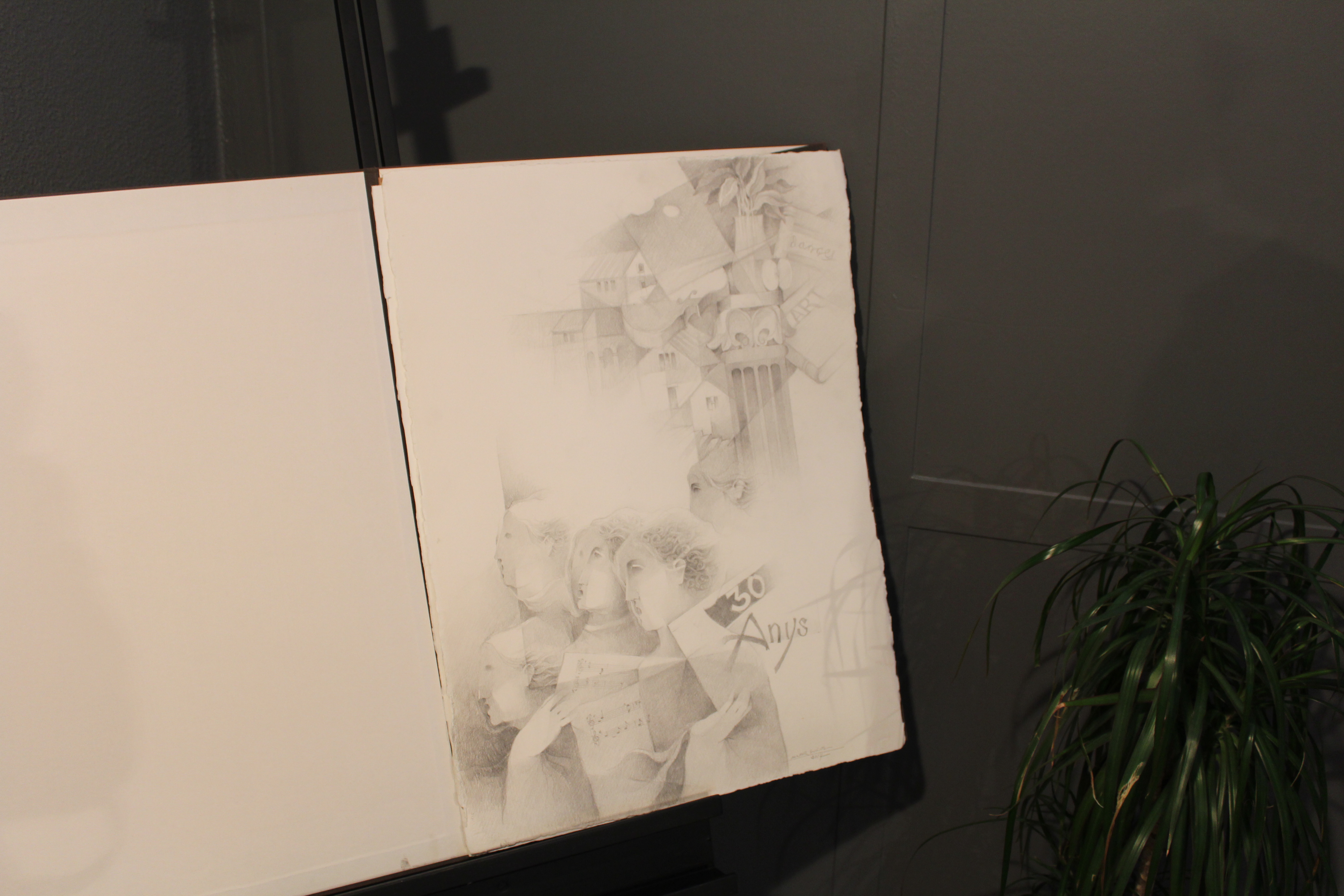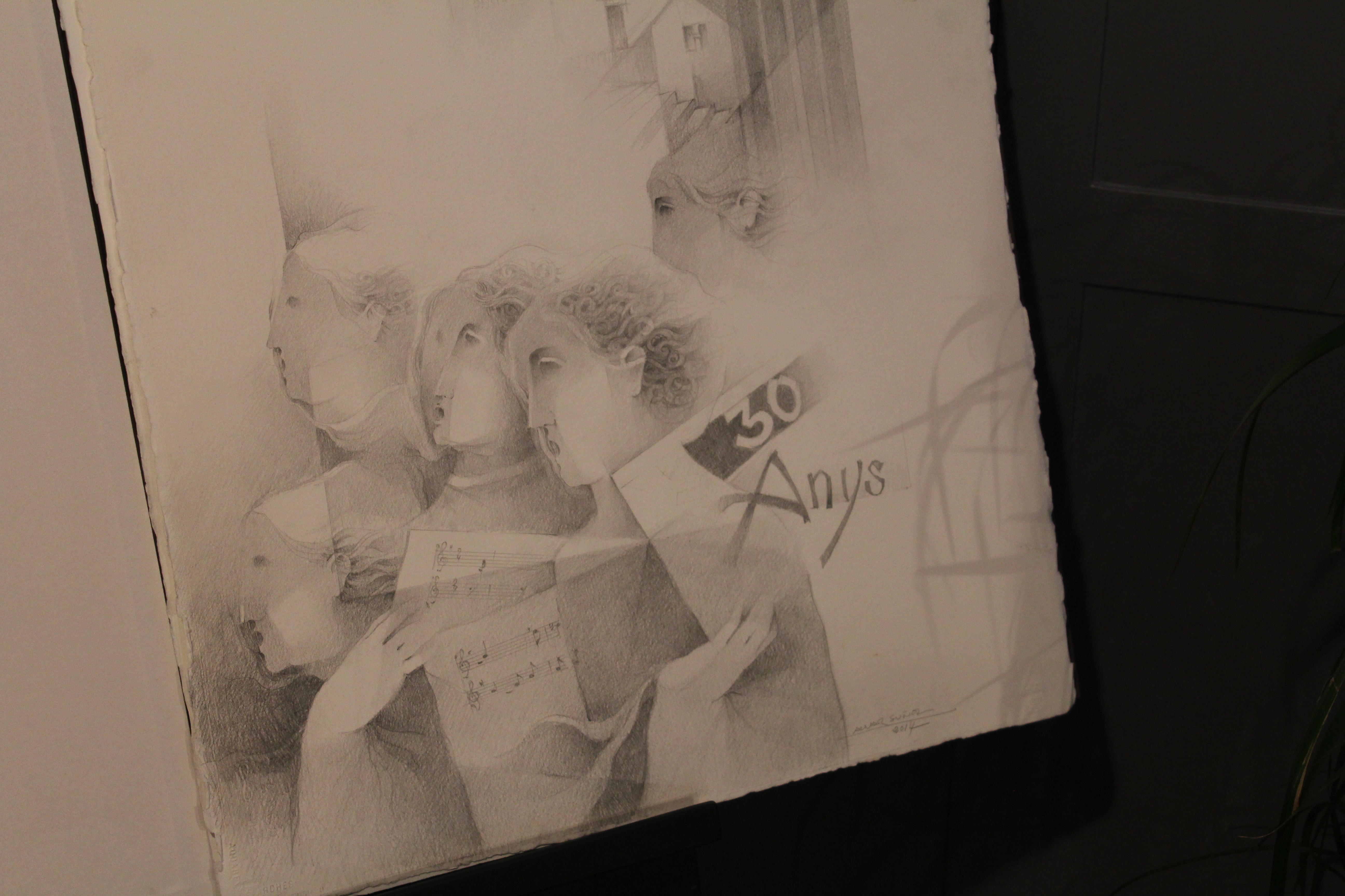 L’exposició és una de les celebracions que la Coral fa per aquests 30 anys. Hi podem trobar també el dibuix que l’artista local Àlvar Suñol els ha dedicat. El pintor mostra com els petits cantants construeixen la cultura del poble.
