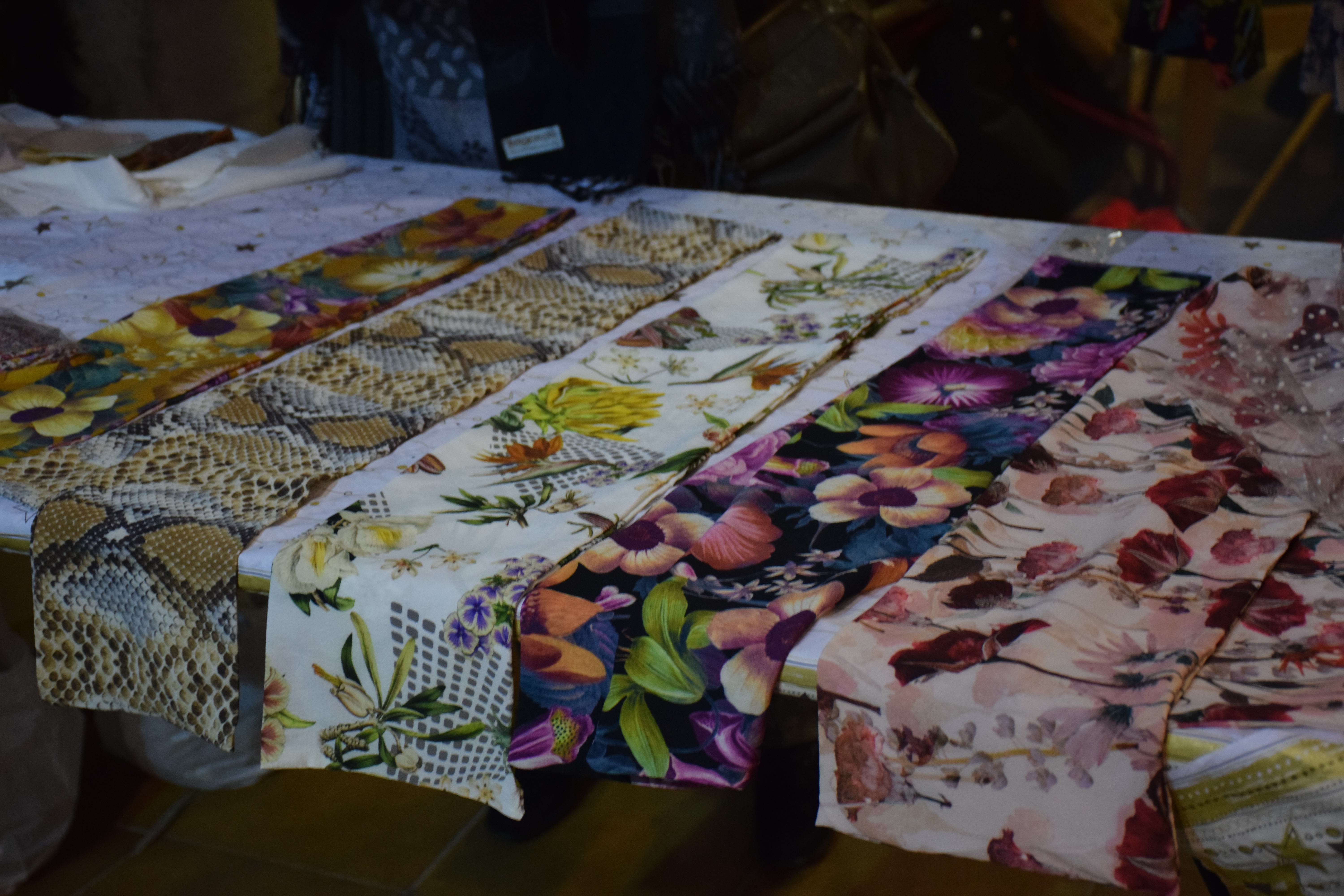 A la paradeta del davant hi havia la Luisa, que juntament amb dues dones més havia fet a mà uns bonics mocadors amb estampacions florals. Ella, però, no forma part del taller de manualitats sinó que ho ha anat fent a les seves estones lliures: