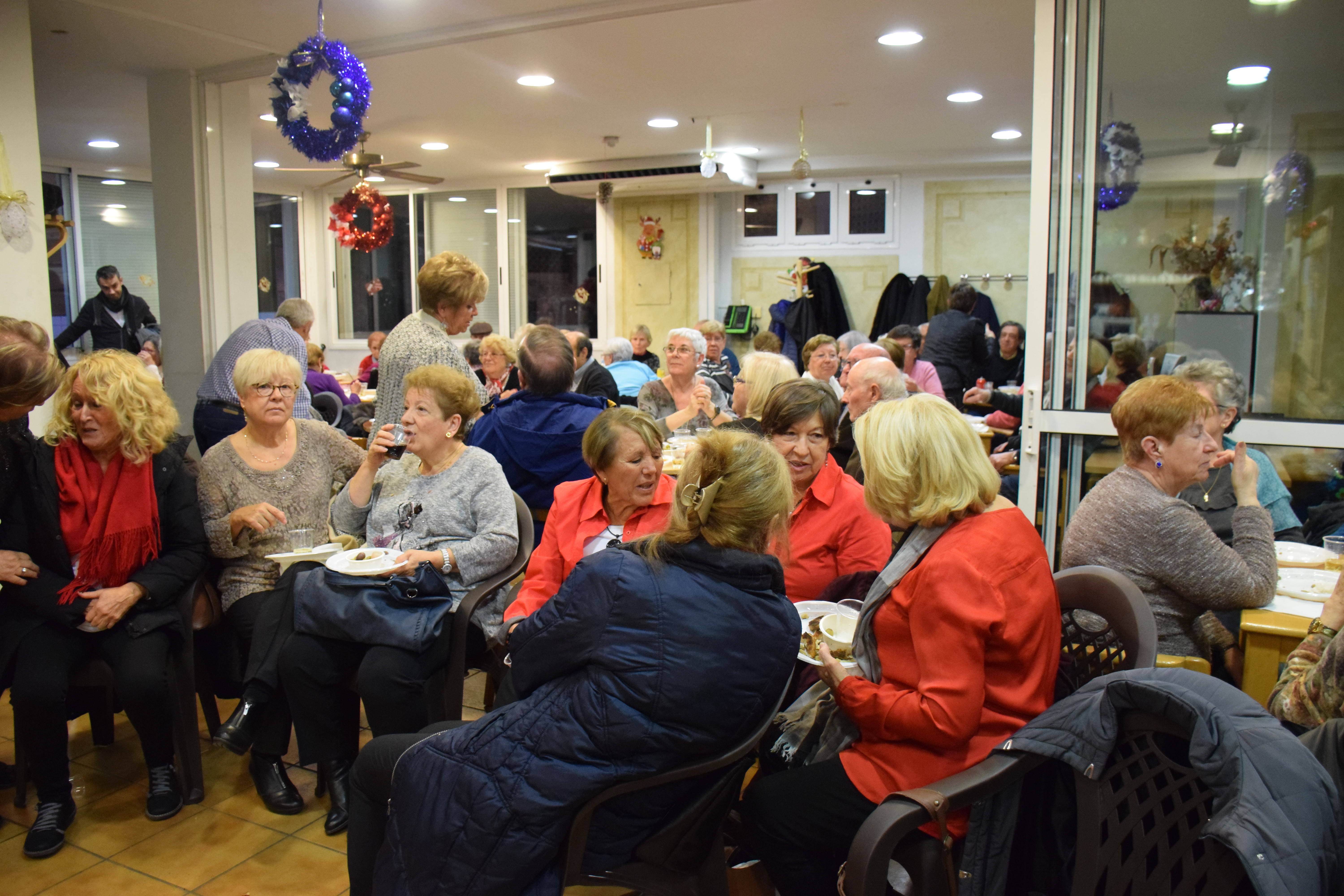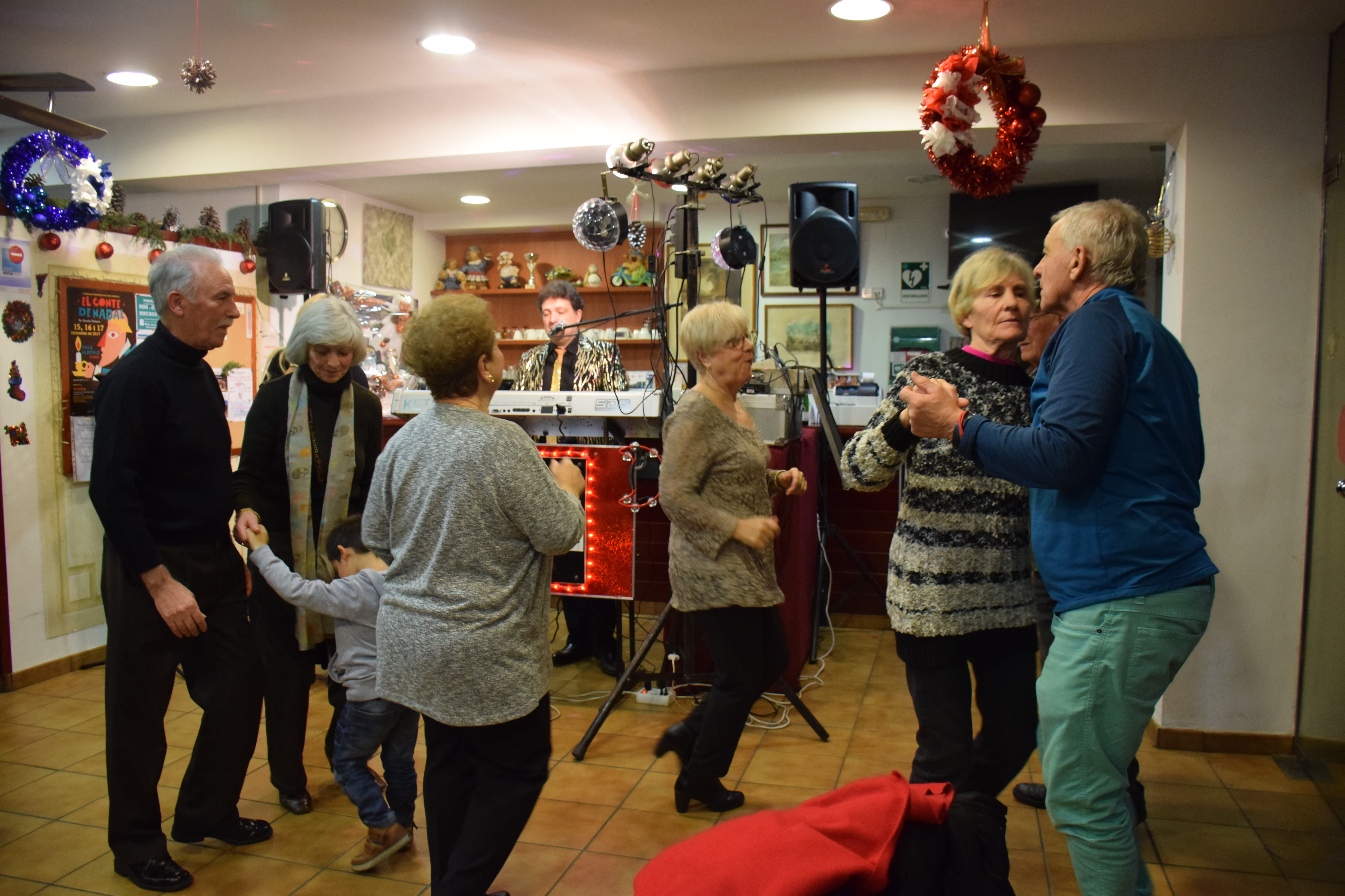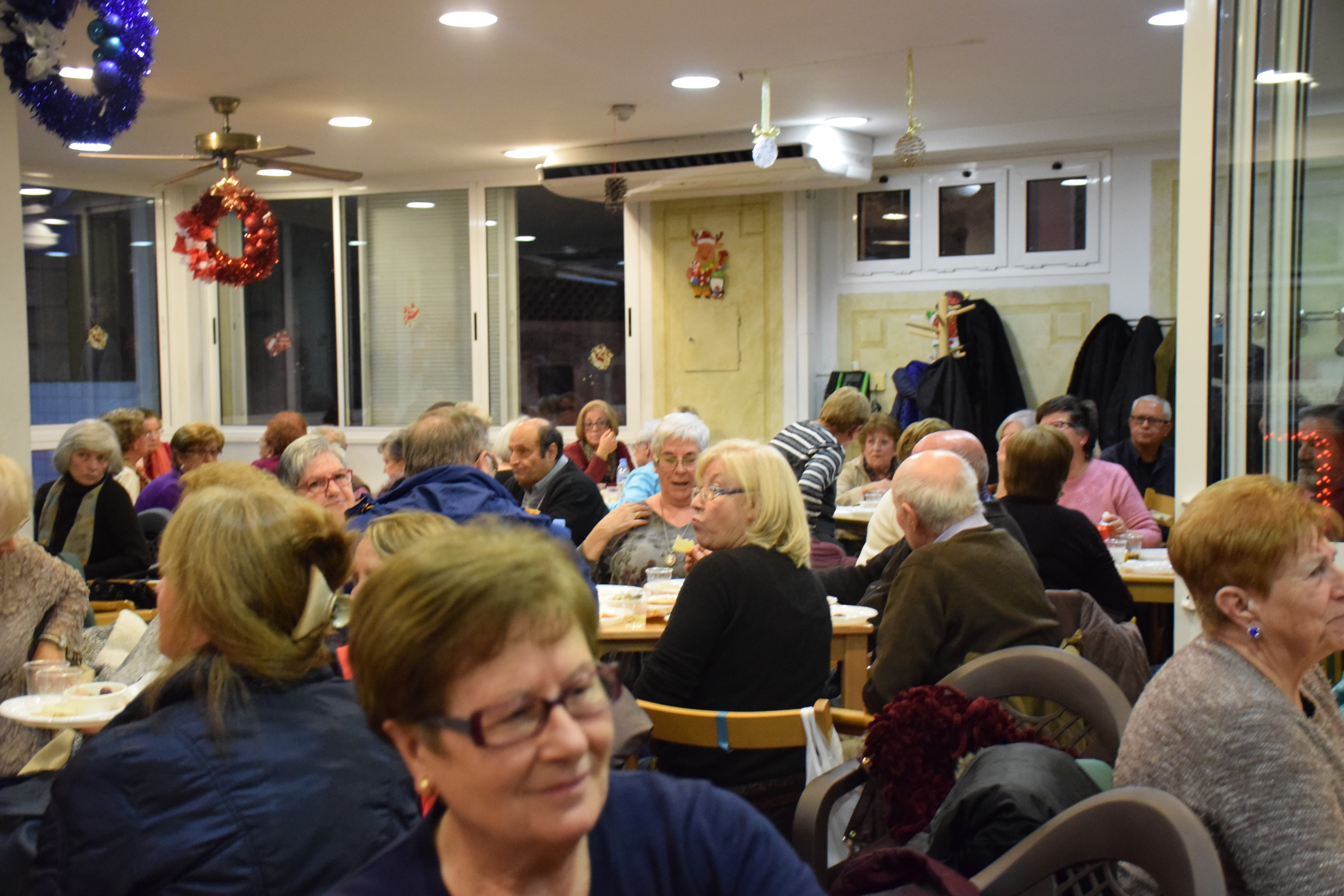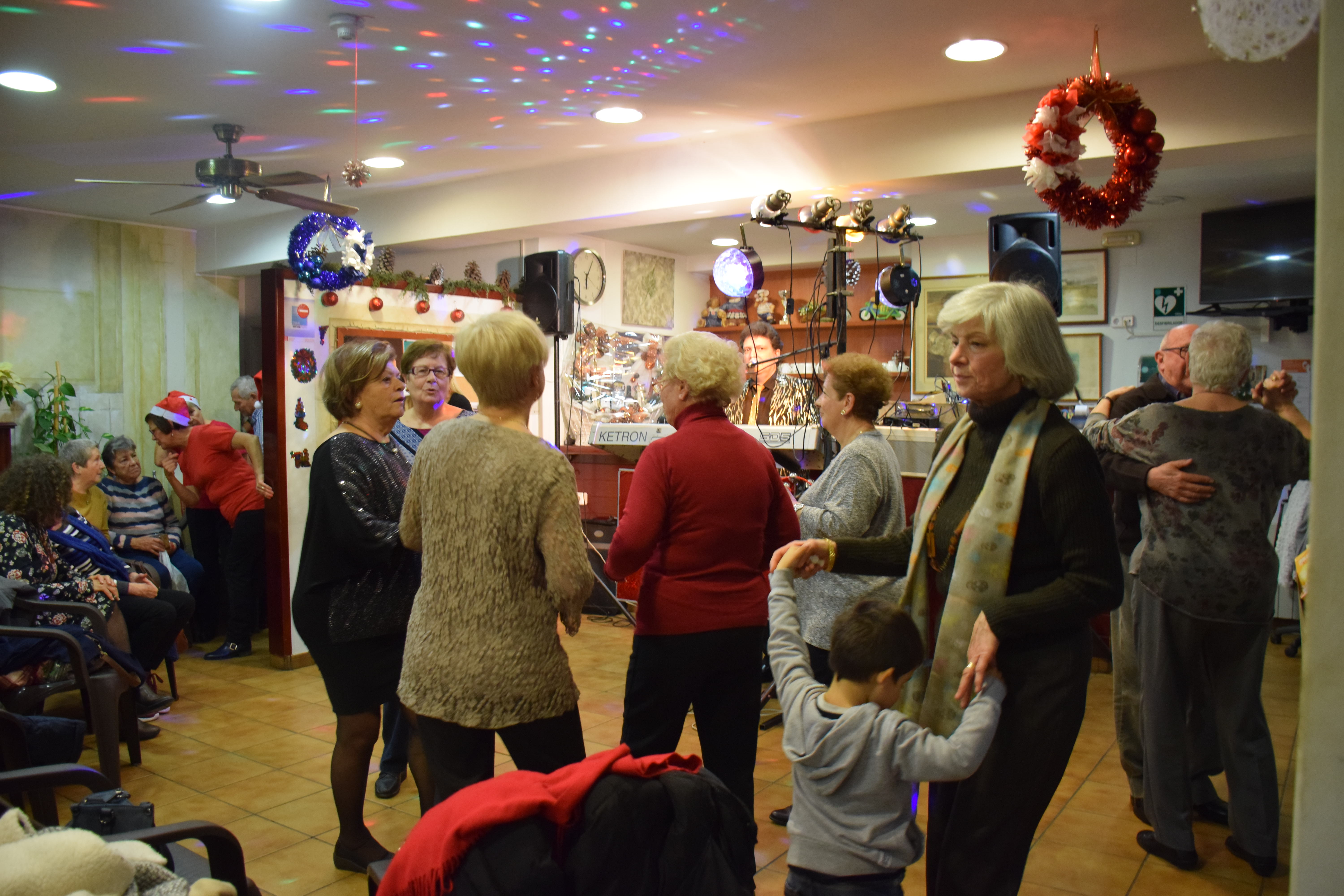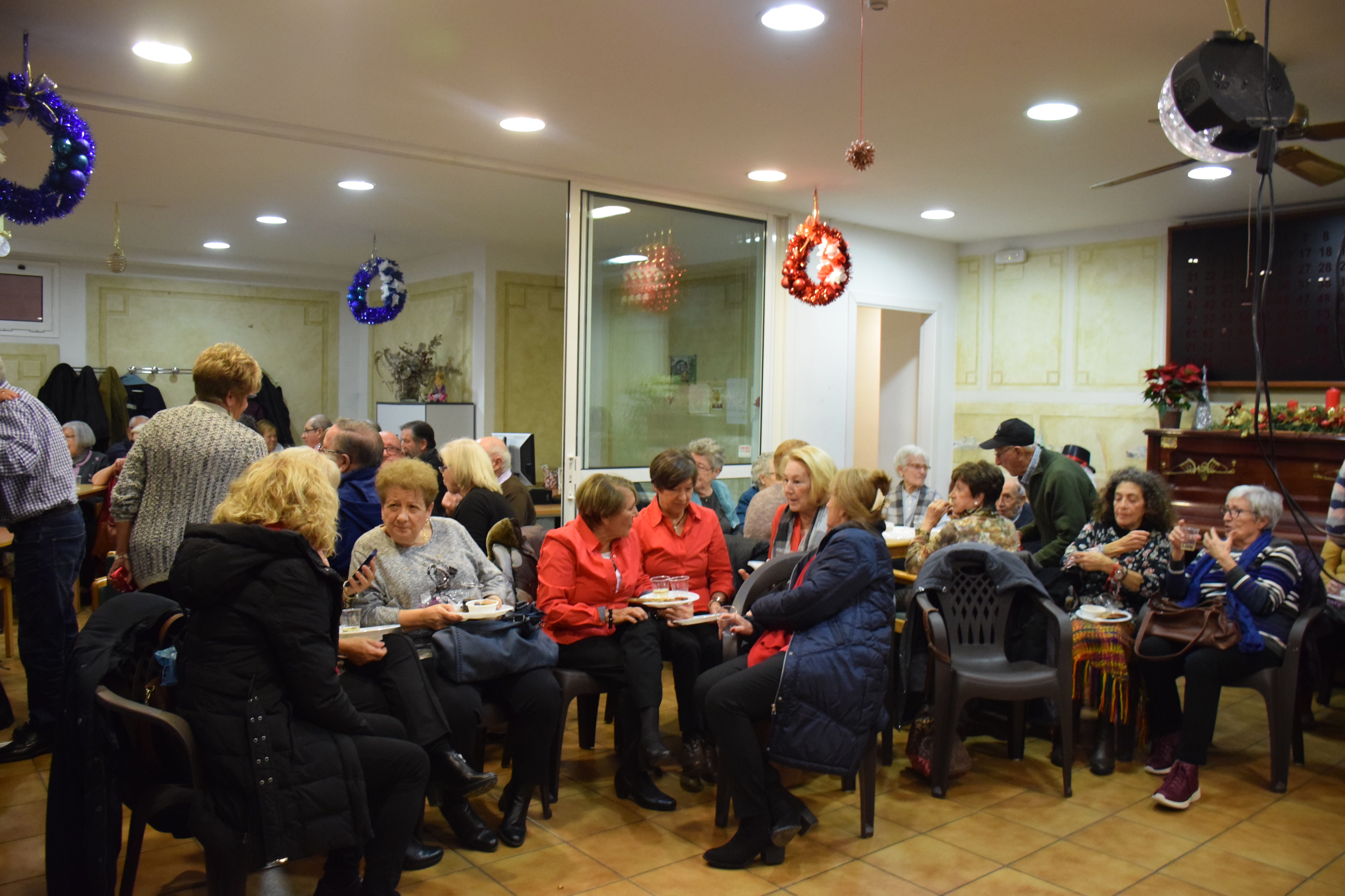 A dins de la Llar d’Avis, arrecerats del fred, totes les taules estaven ocupades mentre els avis i àvies berenaven i gaudien de l’espectacle musical de la banda. Fins i tot han sortit a ballar un grup d’àvies que havien preparat una coreografia nadalenca. Un ambient molt animat que ha servit per donar la benvinguda al Nadal en bona companyia.