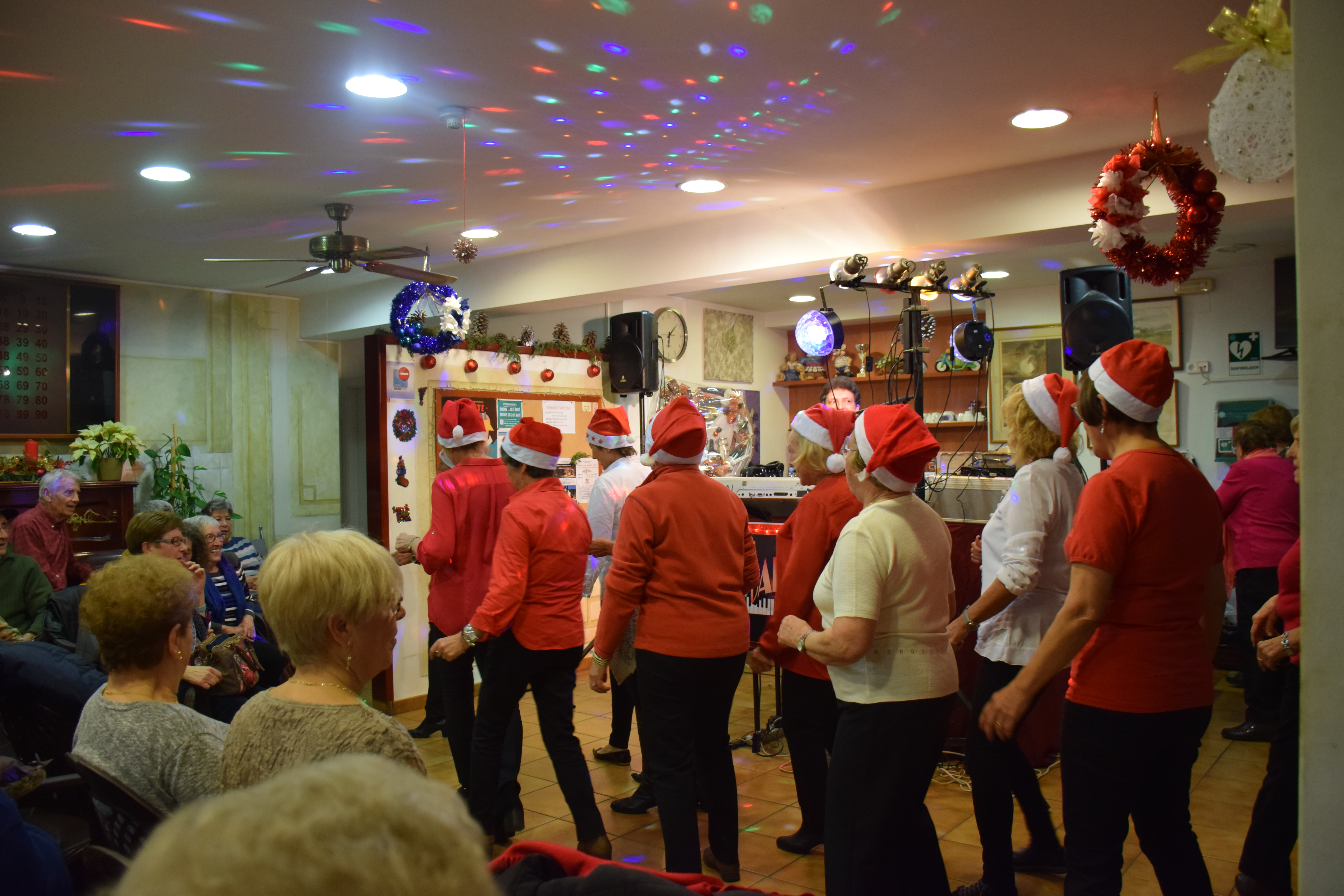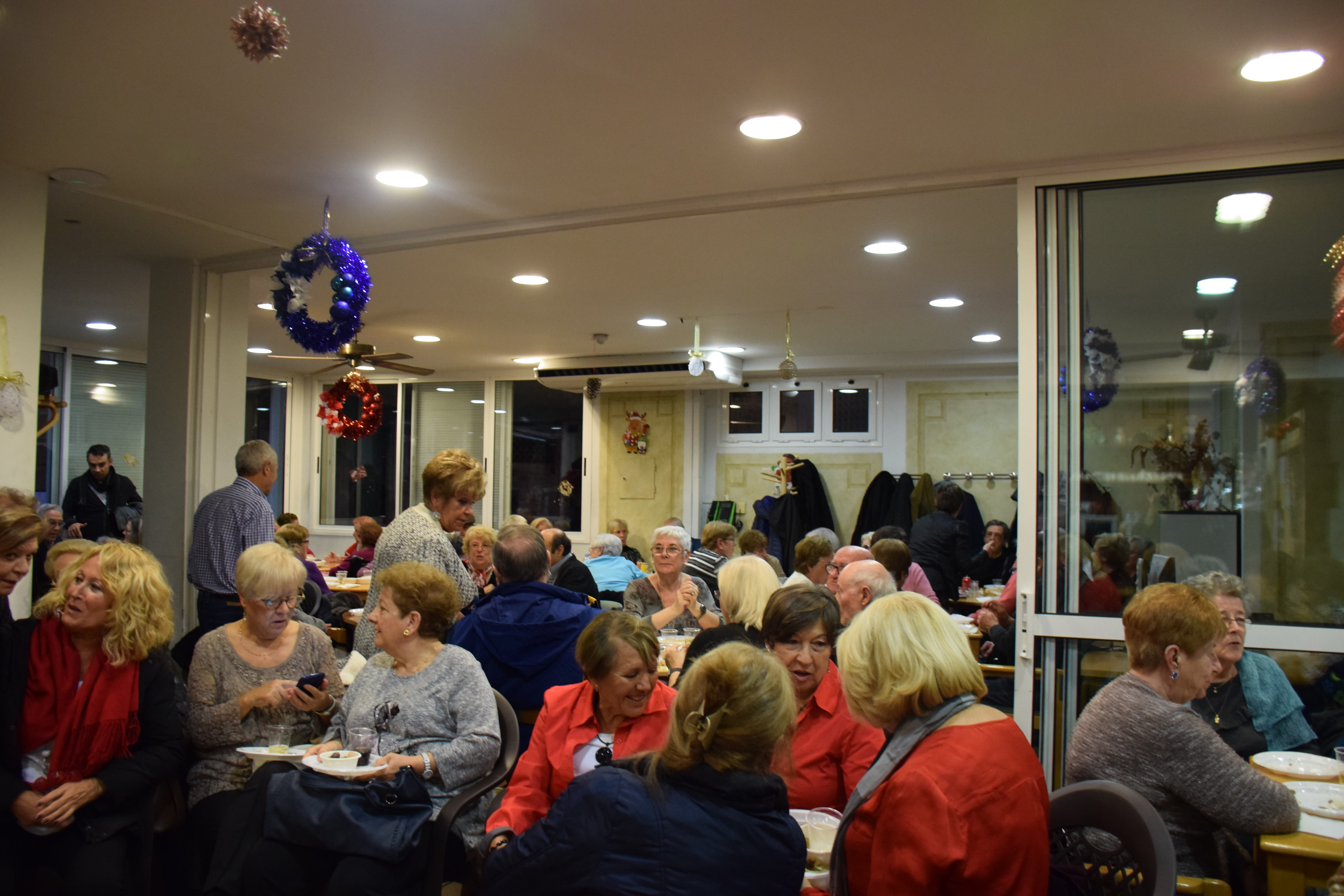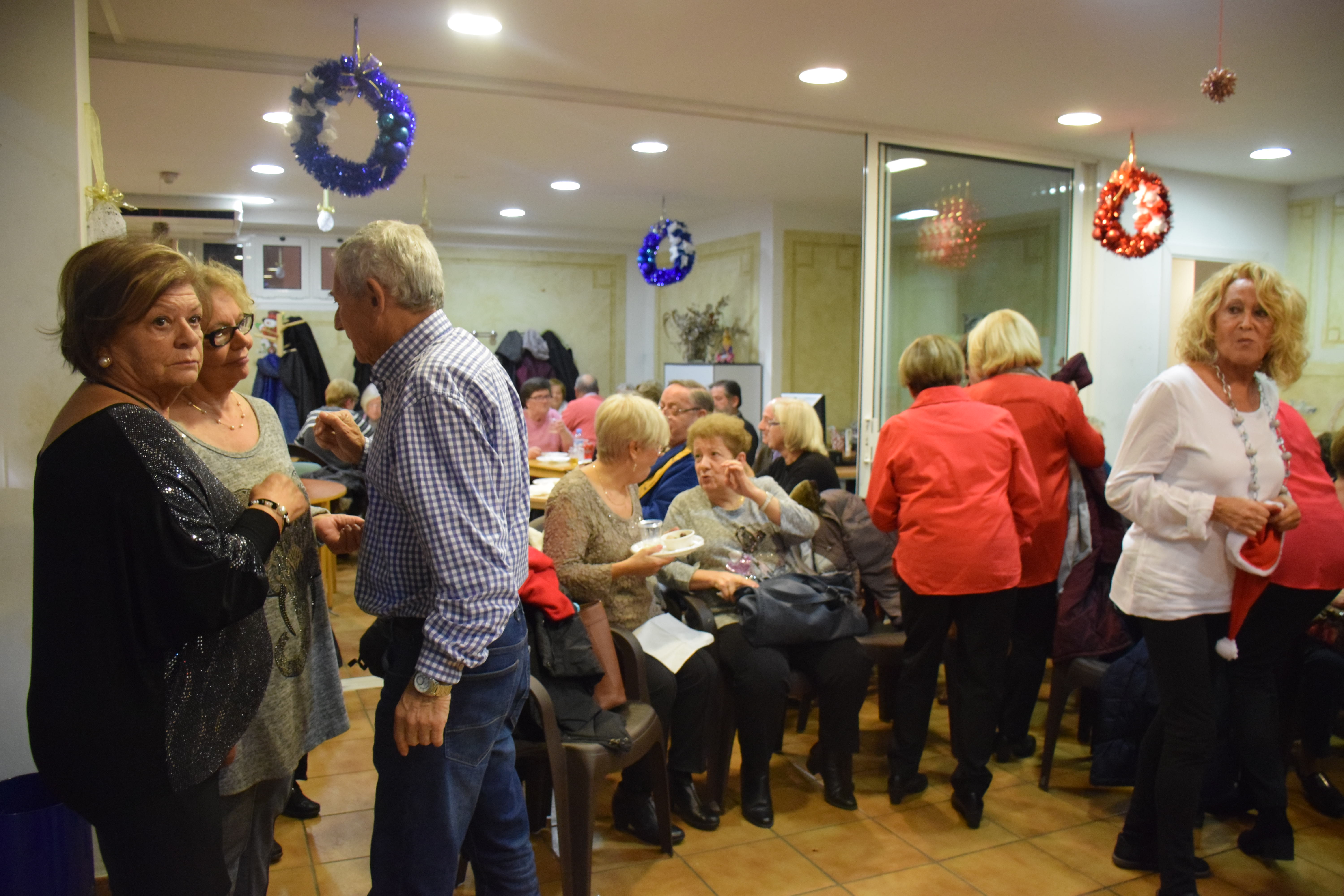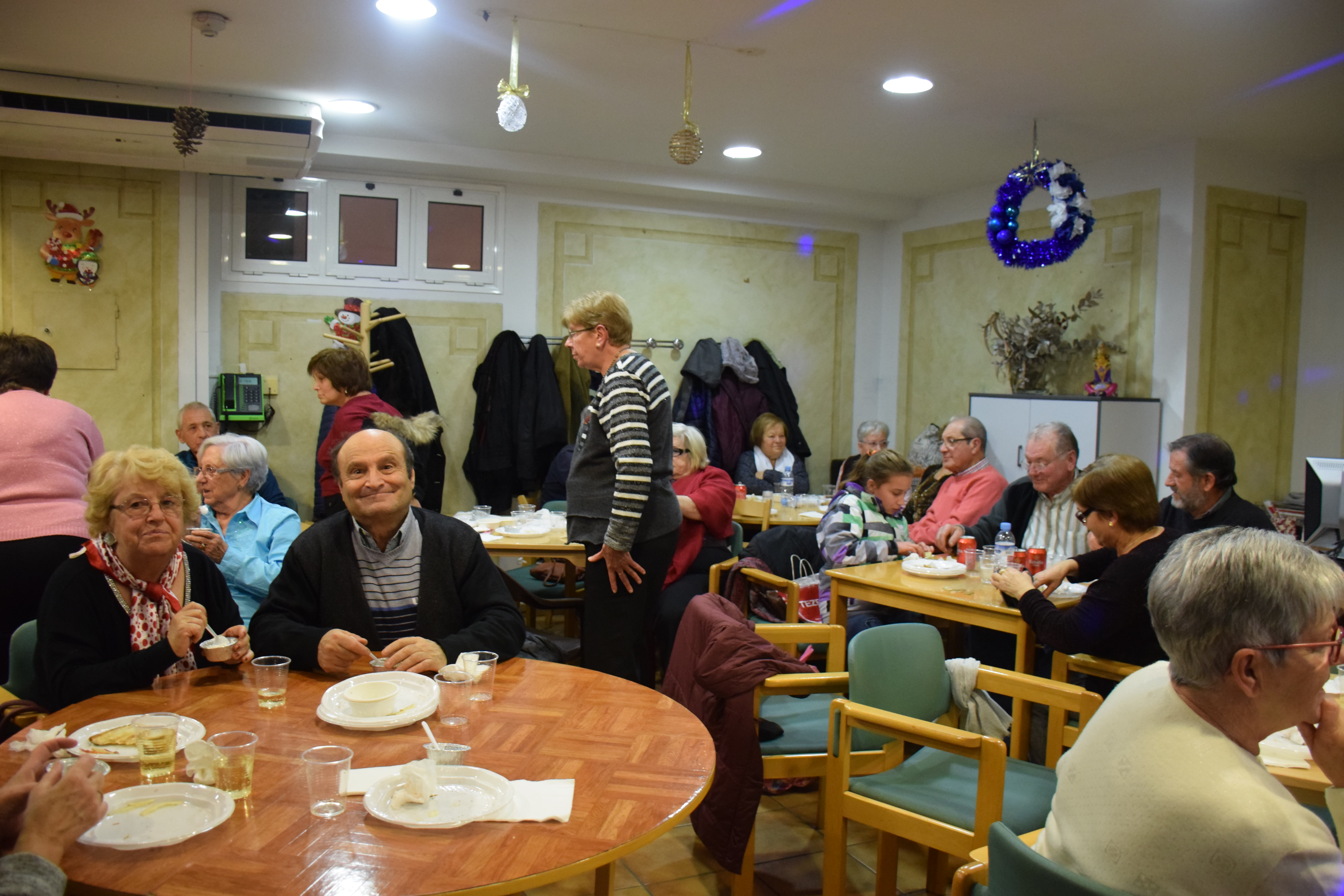 A dins de la Llar d’Avis, arrecerats del fred, totes les taules estaven ocupades mentre els avis i àvies berenaven i gaudien de l’espectacle musical de la banda. Fins i tot han sortit a ballar un grup d’àvies que havien preparat una coreografia nadalenca. Un ambient molt animat que ha servit per donar la benvinguda al Nadal en bona companyia.