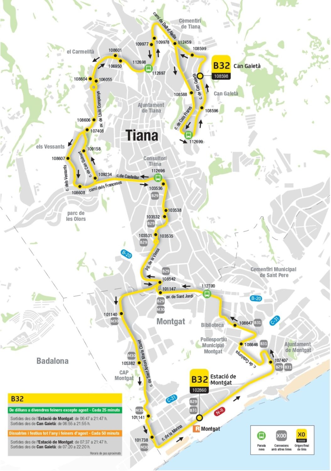 Aquesta nova línia manté la connexió amb el carrer de St. Antoni Maria Claret, el cementiri, el poliesportiu, la biblioteca de Montgat i amb la línia M30. A més, a l’estació s’hi atura conjuntament amb les línies B29 i B31 en els dos sentits.