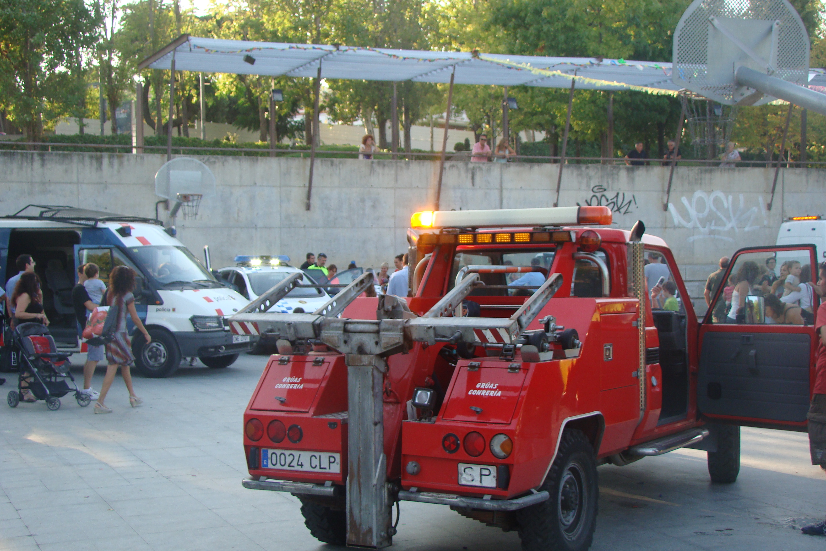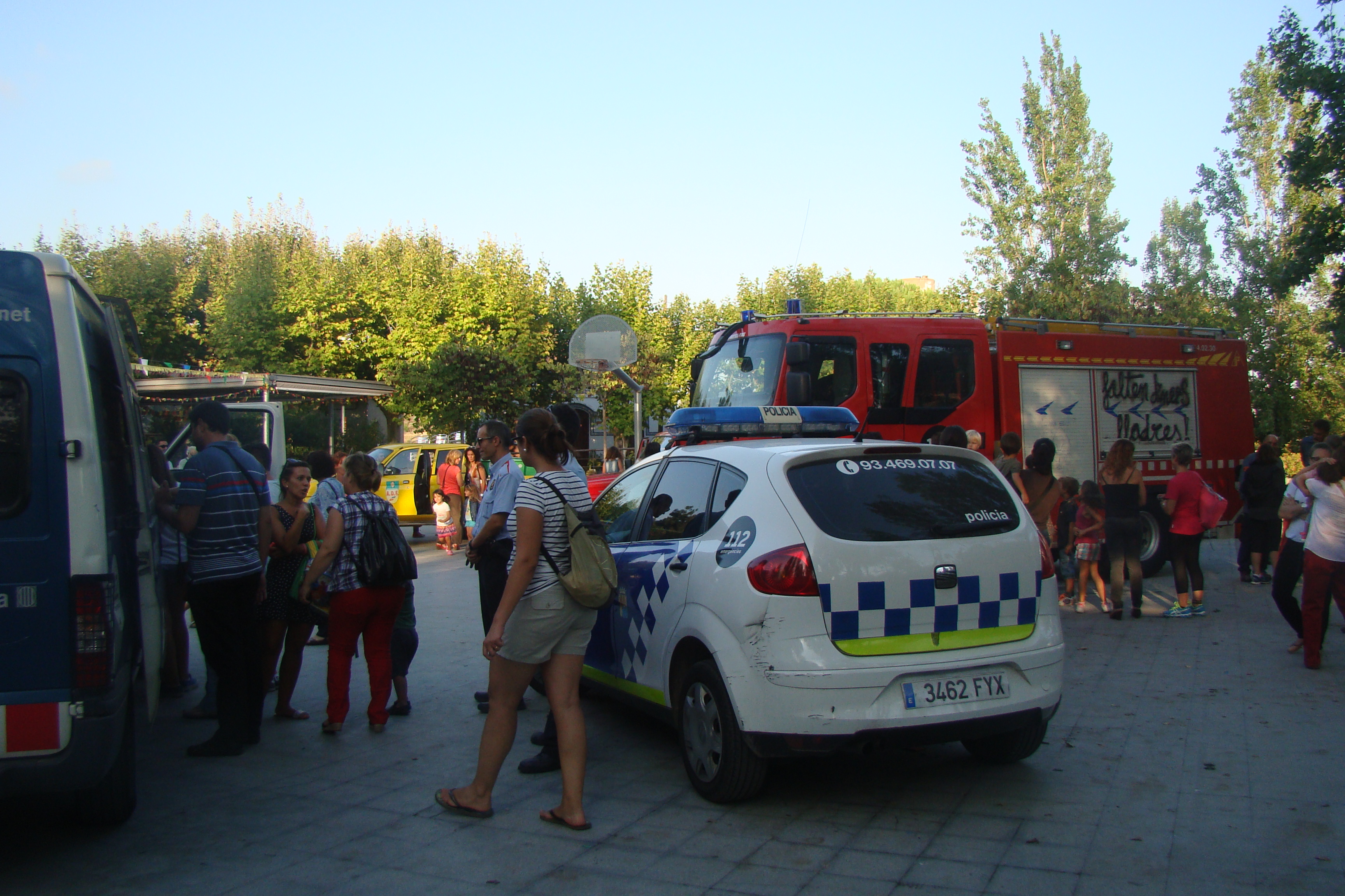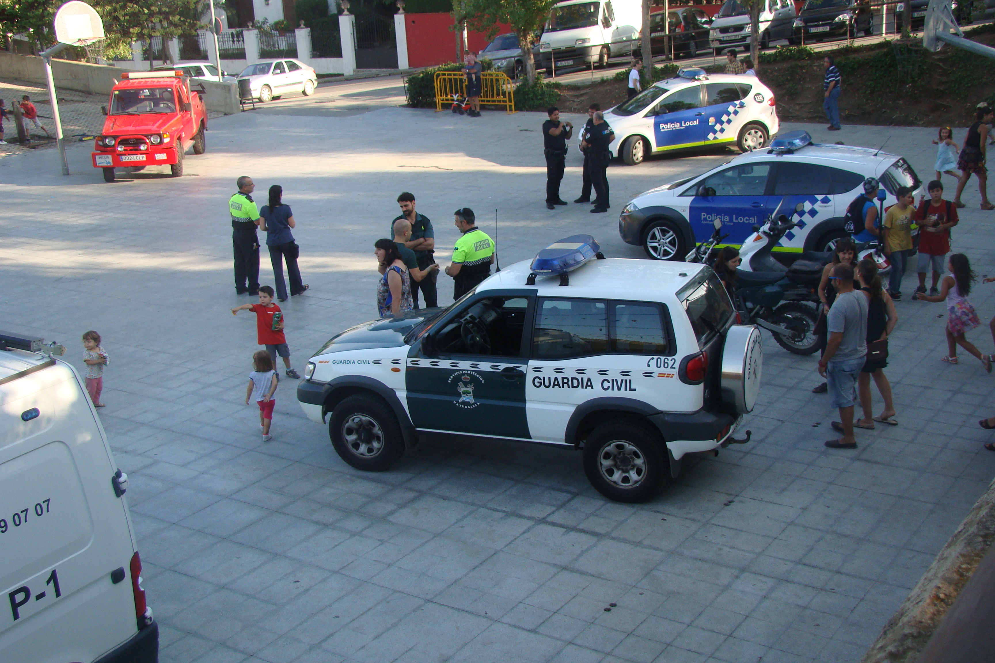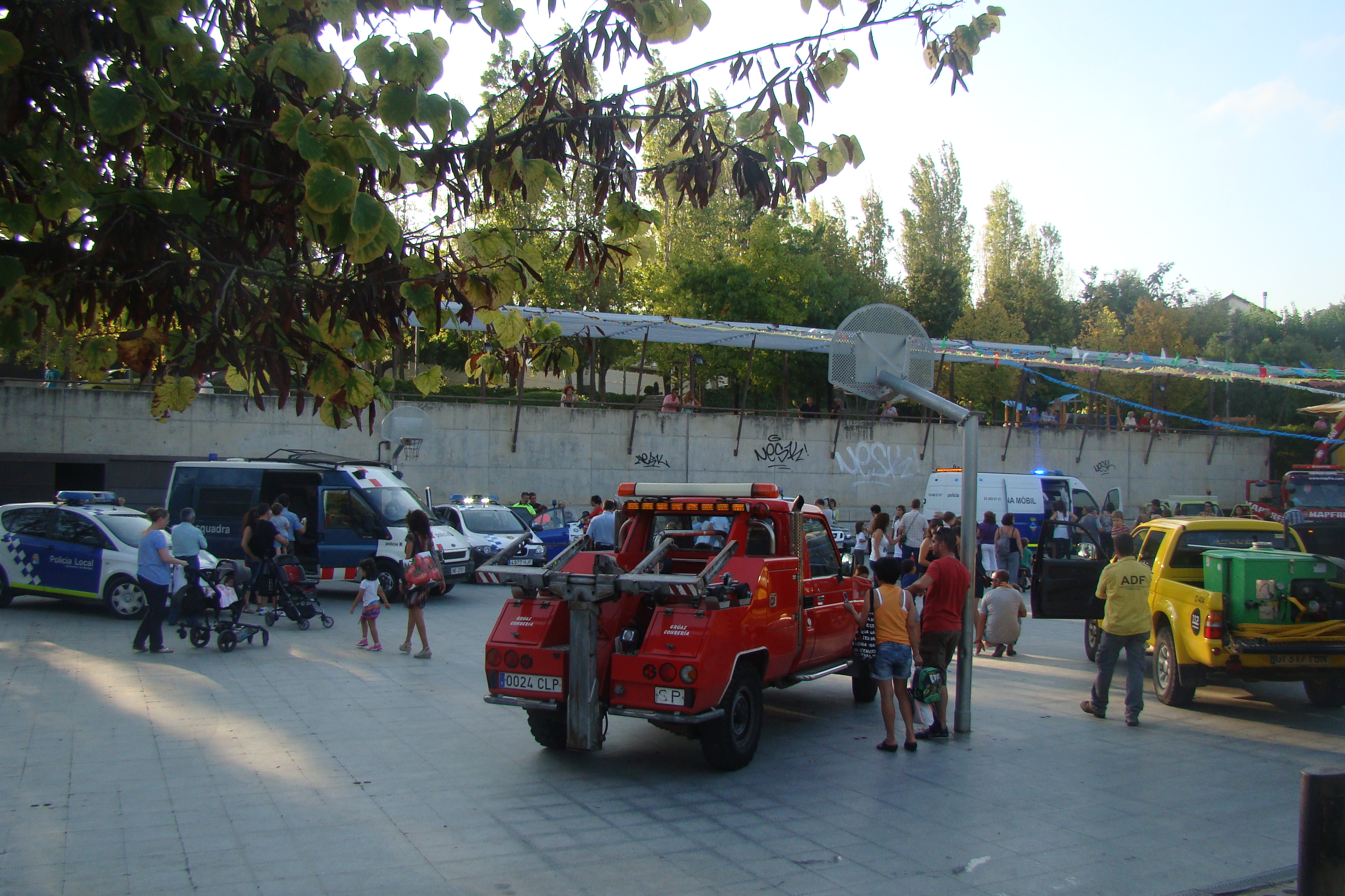 En total, un camió de Bombers, quatre vehicles de la Policia Local, una furgoneta dels Mossos d’Esquadra, dos vehicles de la Guàrdia Civil, un camió d’escombraries, dues grues, una ambulància i dos vehicles de Creu Roja i un 4×4 dels ADF han aparcat al parc de l’antic camp de futbol per canviar de mans, per una estona.