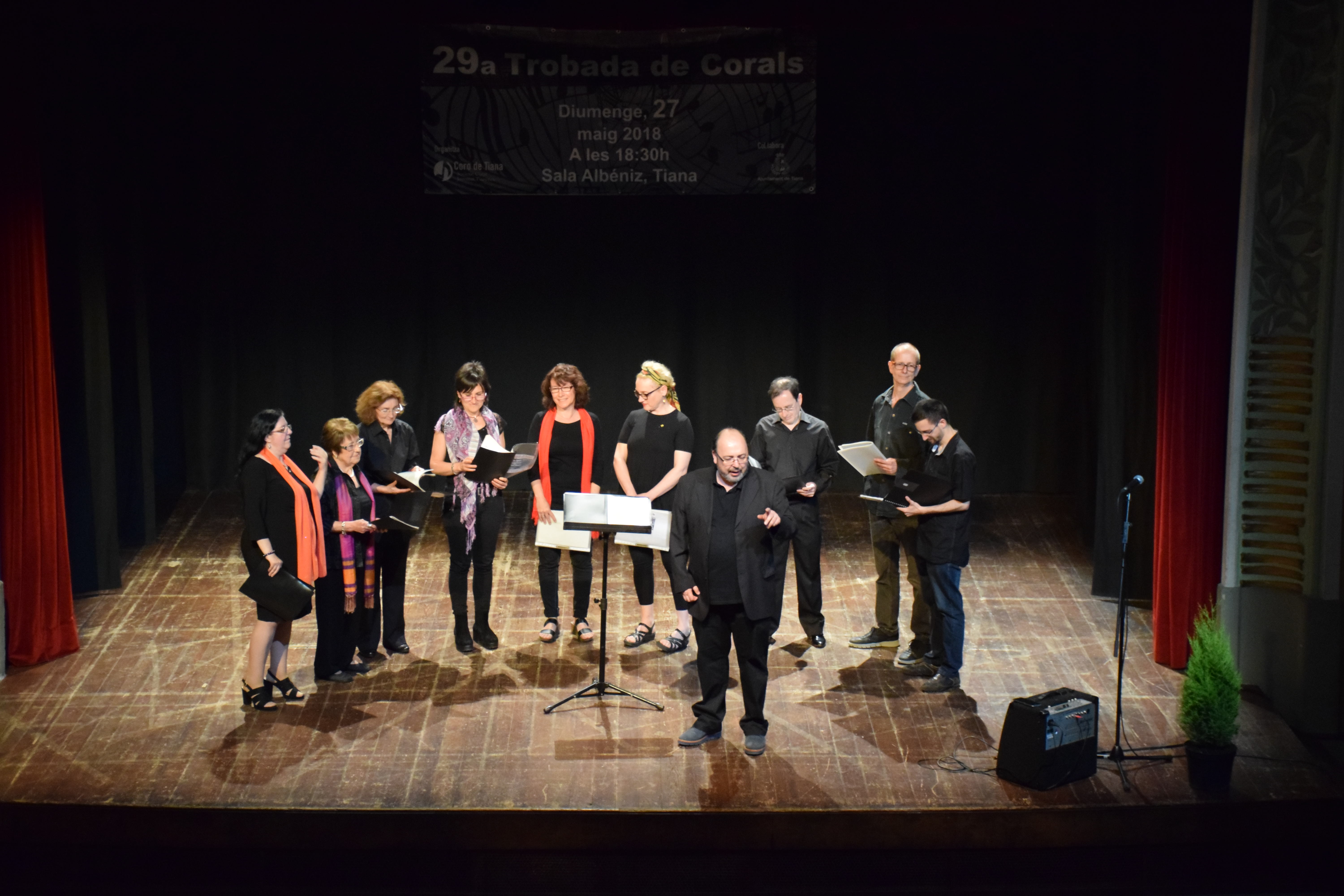 Aportar alguna cosa nova en una trobada que fa vint-i-nou anys que es celebra és una tasca complicada. Caure en la repetició és una trampa molt temptadora però ni la gent del “Coro” hi vol caure ni un servidor tampoc. La vint-i-novena edició de la trobada de corals ha escollit, com a mínim, un mal dia per celebrar-se. La coincidència amb el primer concert del Tiana Antica a les caves Parxet ha fet que el públic es repartís. Tot i això la Sala Albèniz s’ha omplert fins la meitat superant les expectatives. A la trobada hi han participat tres corals: la “Coral Tianenca”, el “Gospel Tiana” i el Cor “Exaudi” del barri de Gràcia. L’Eduard Montaño, president del “Coro” explica que afortunadament és fácil trobar corals disposades a participar en trobades d’aquest estil.