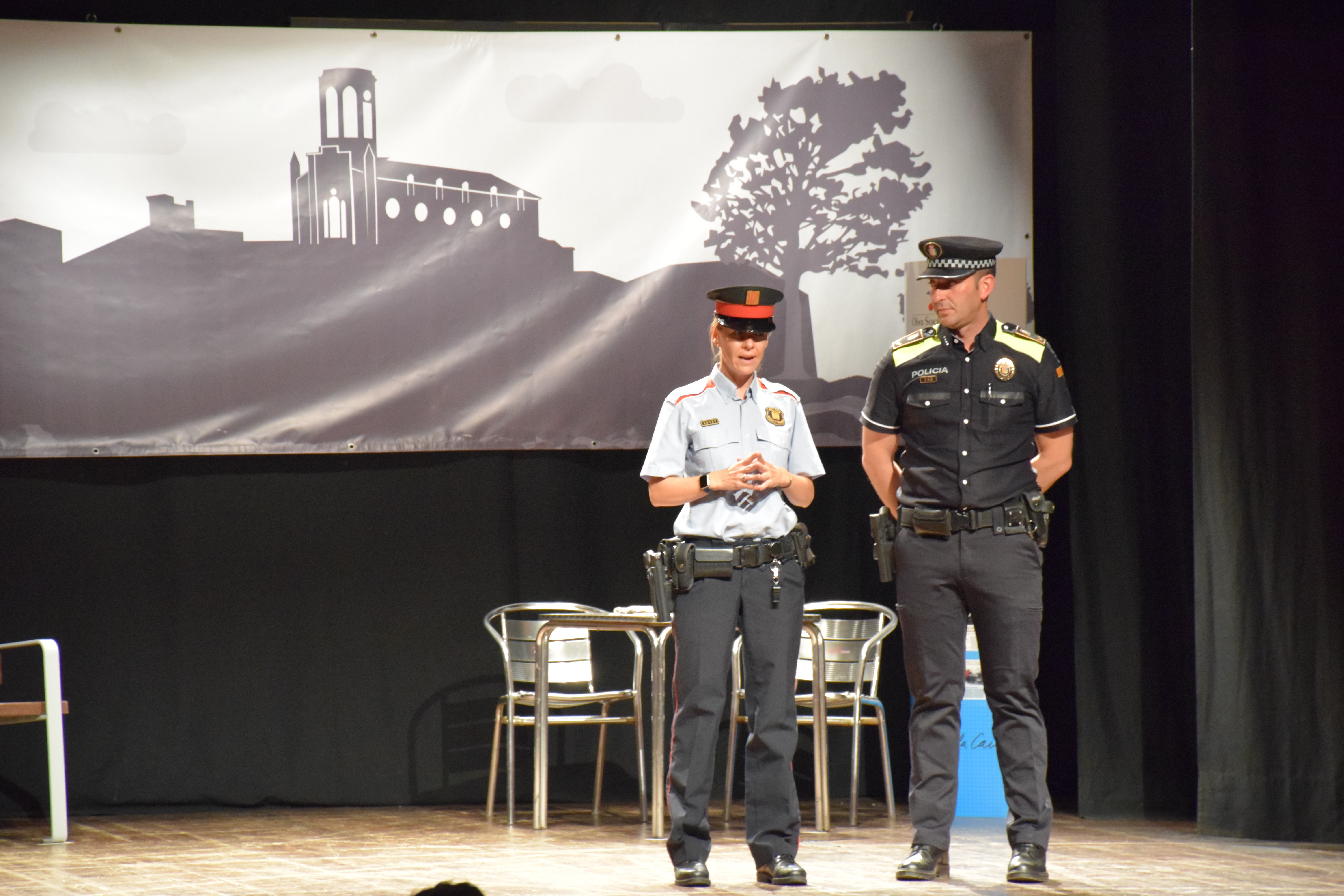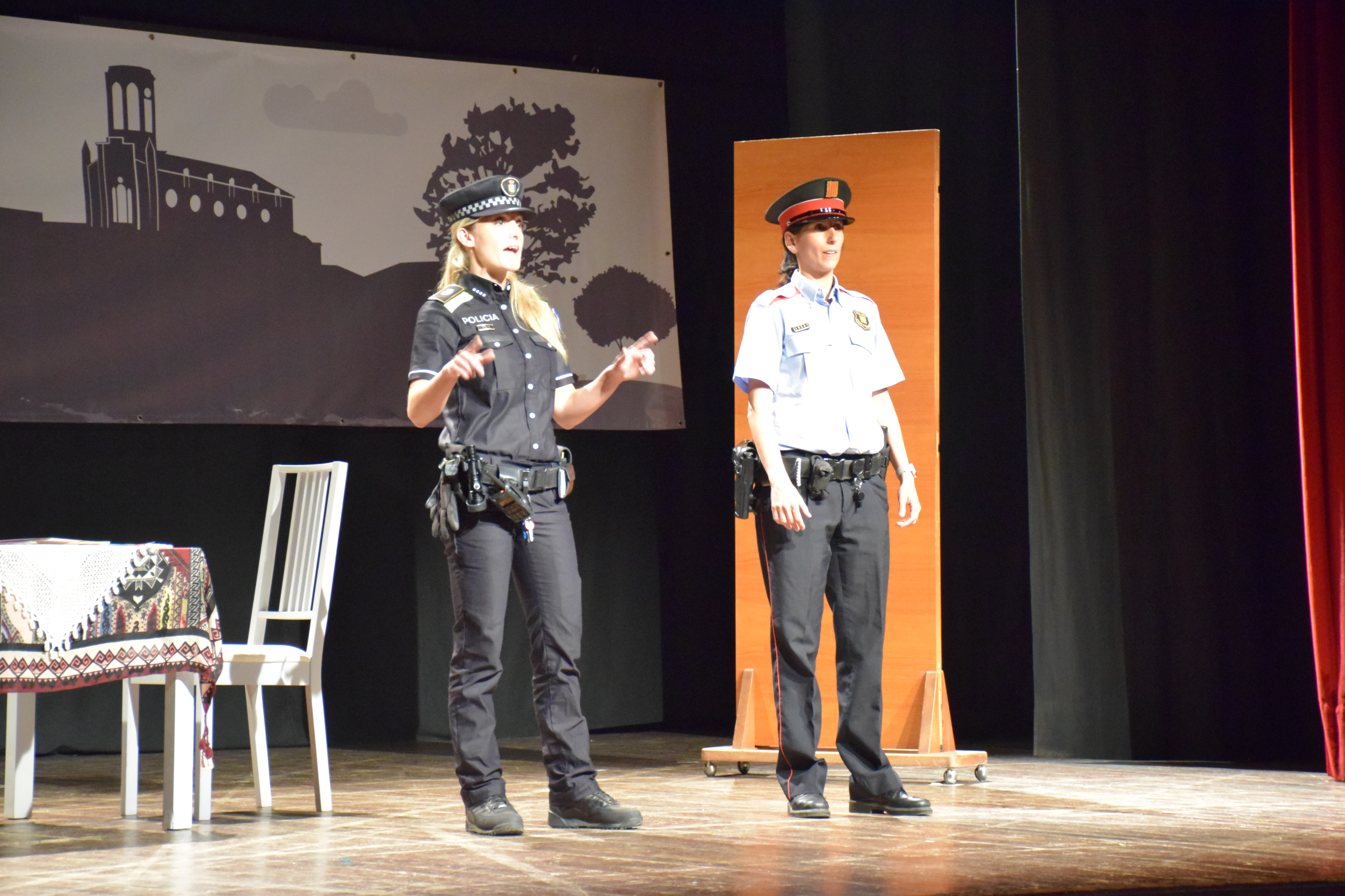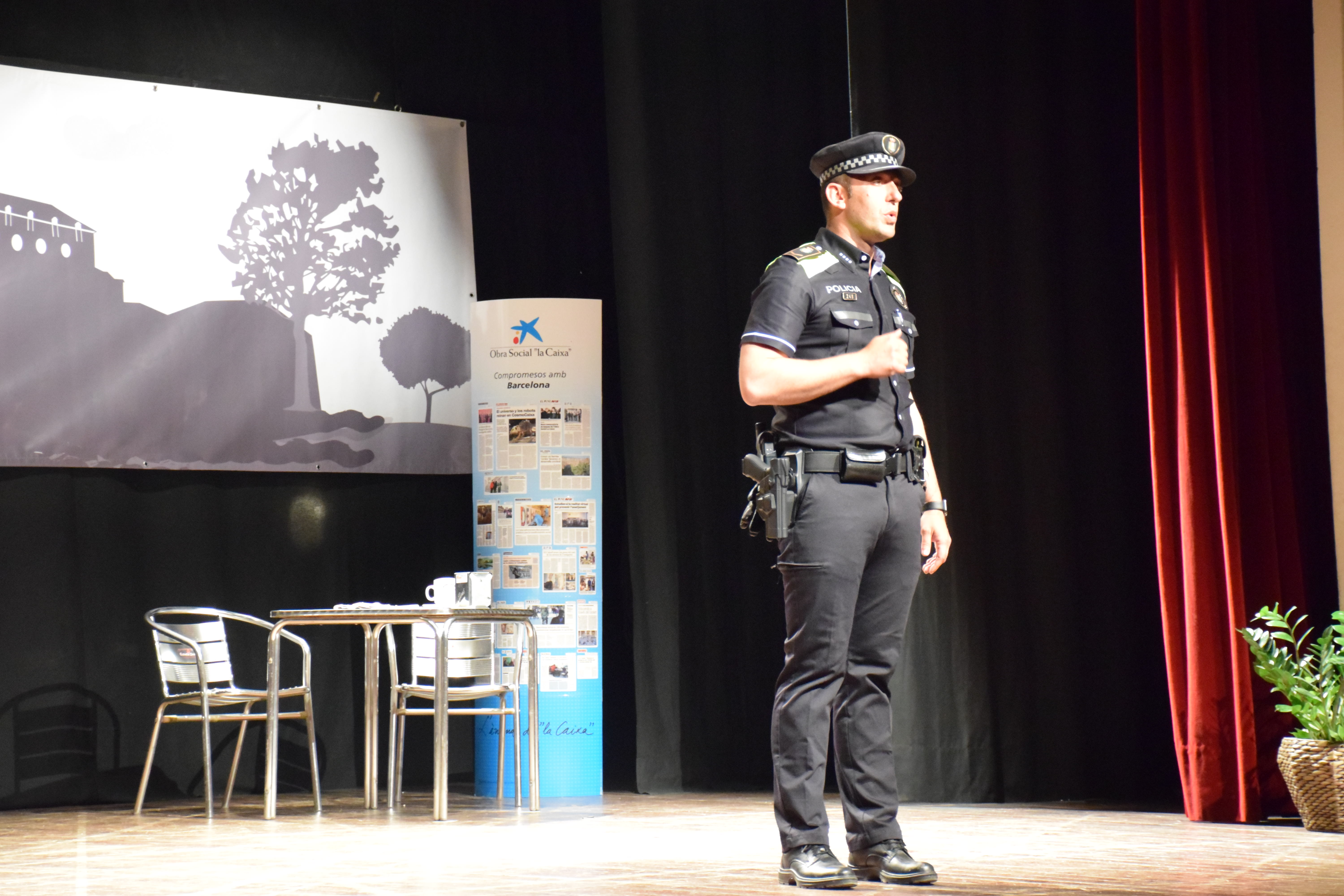 A sobre de l’escenari, vuit actors d’Els 9 Pins han interpretat les tres situacions i, quan es congelava l’escena, sortia una parella de Mossos i Policia Local per explicar quina era l’estafa que s’estava produint i, després, quina era la solució per evitar caure en elles.