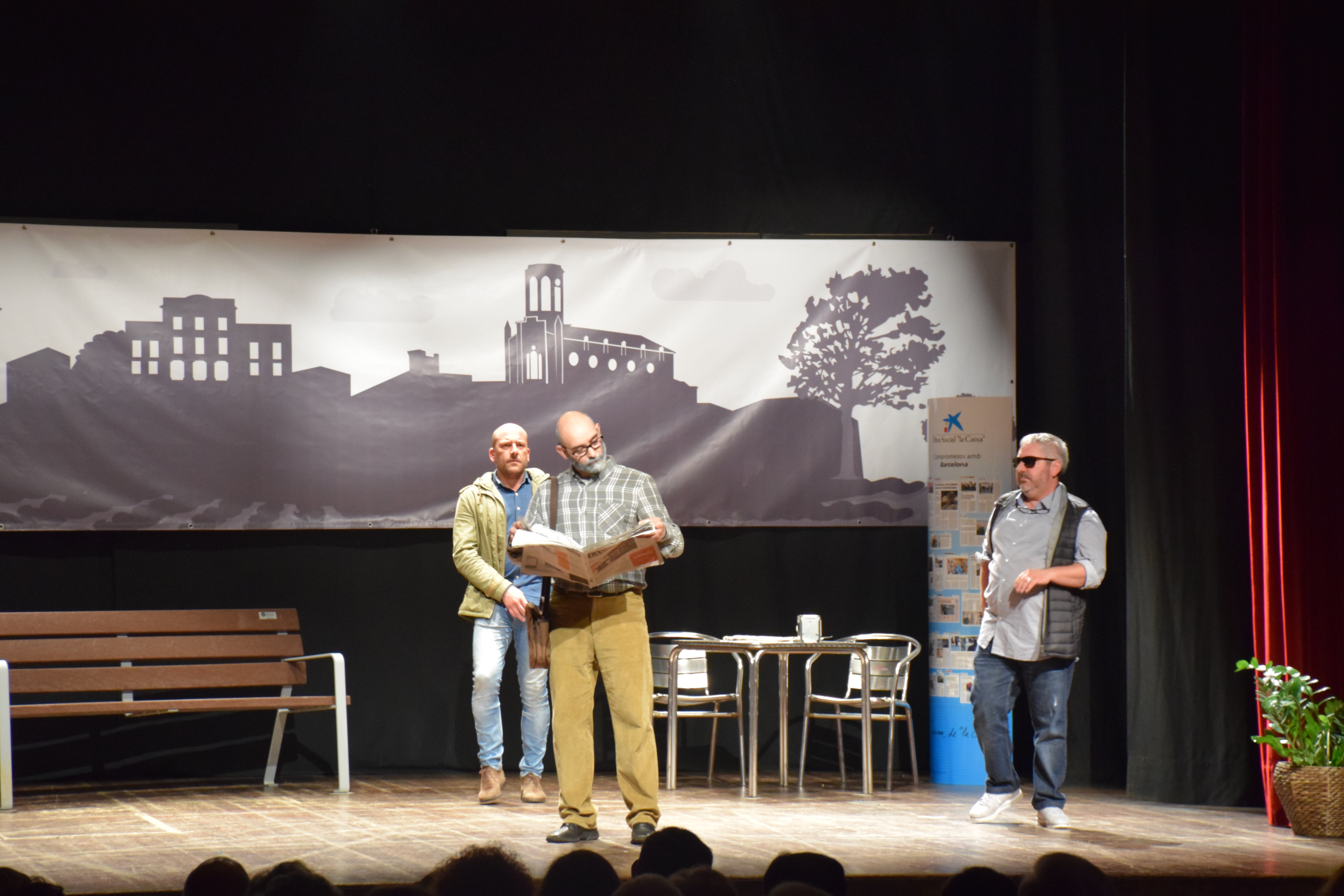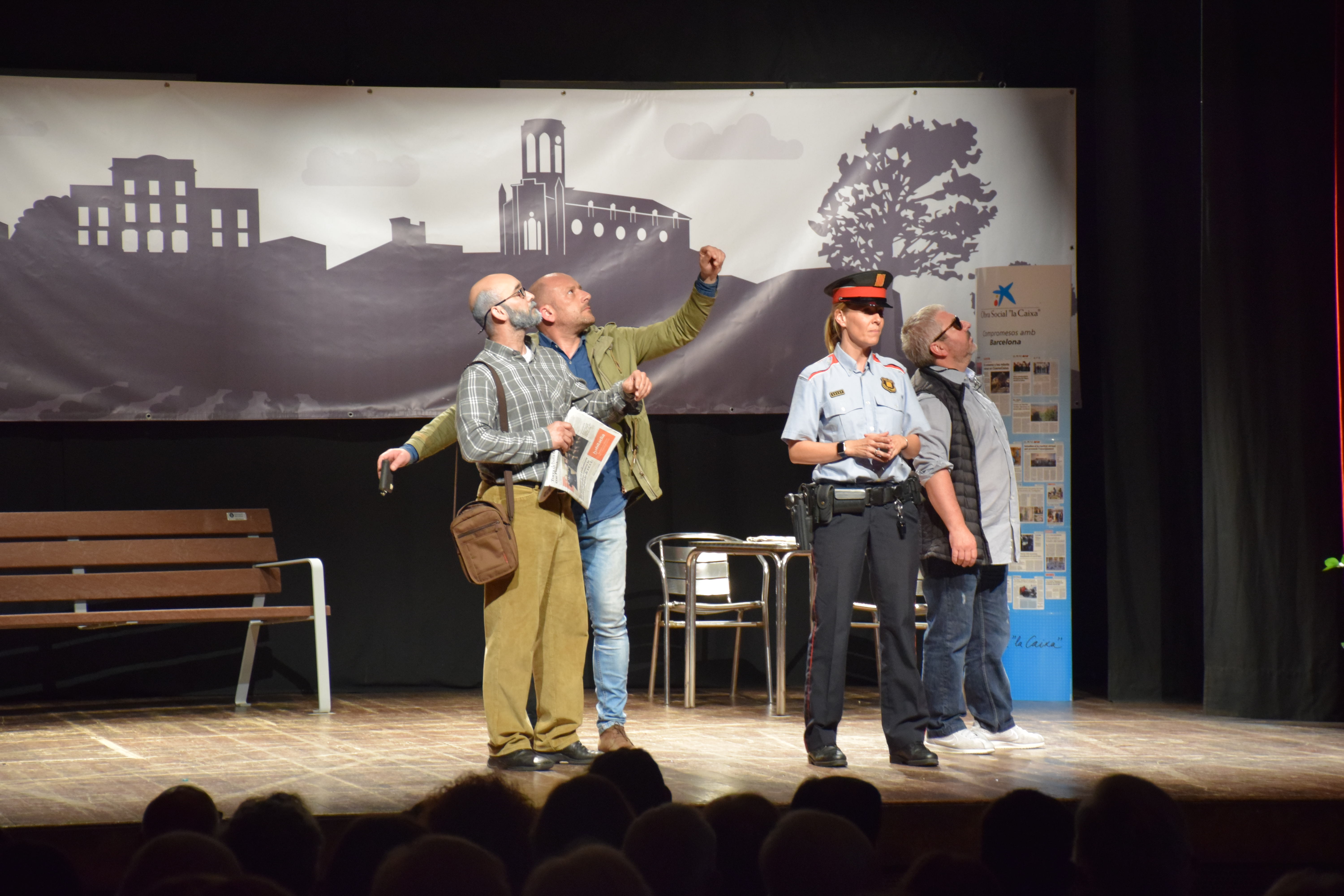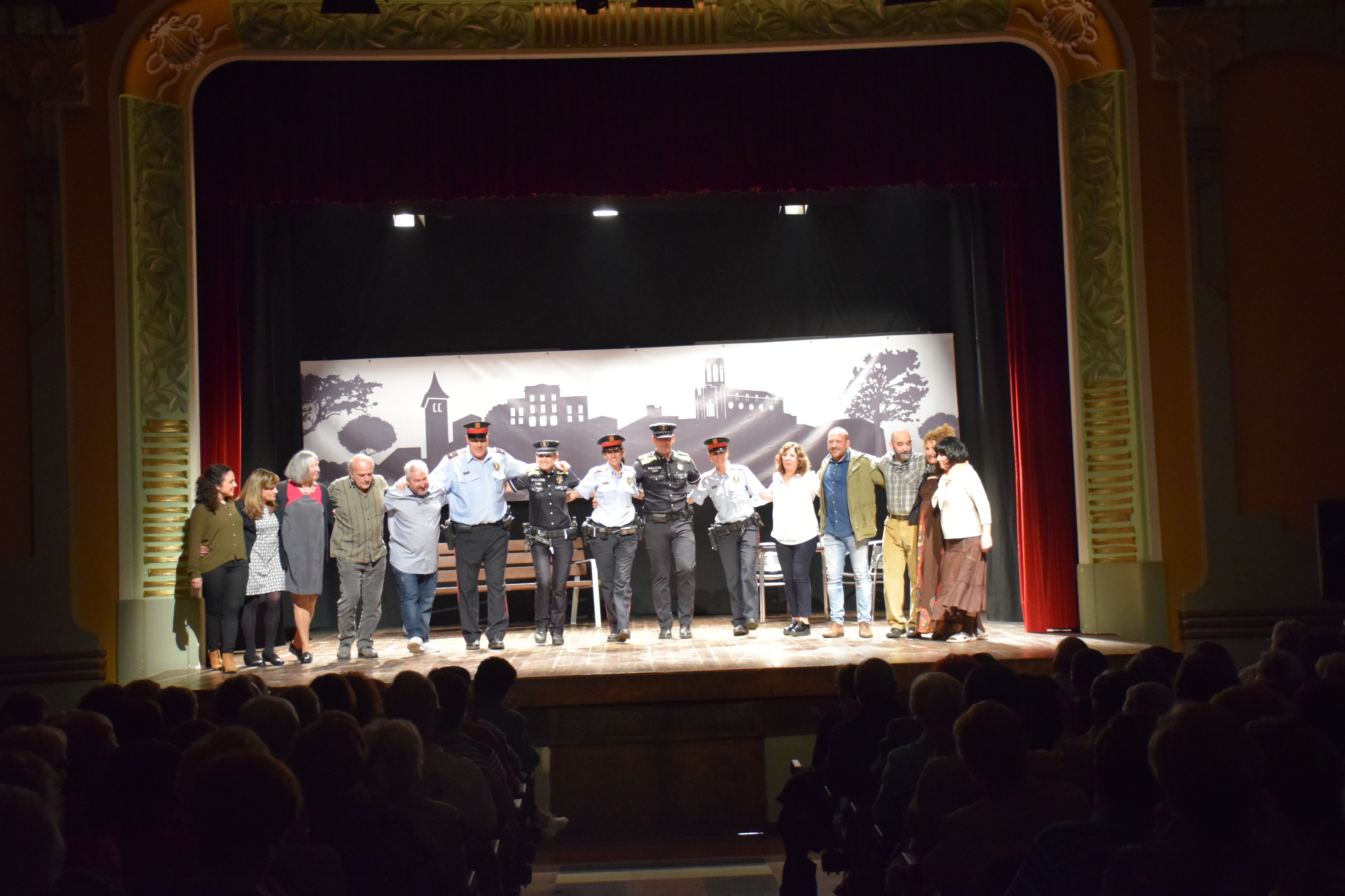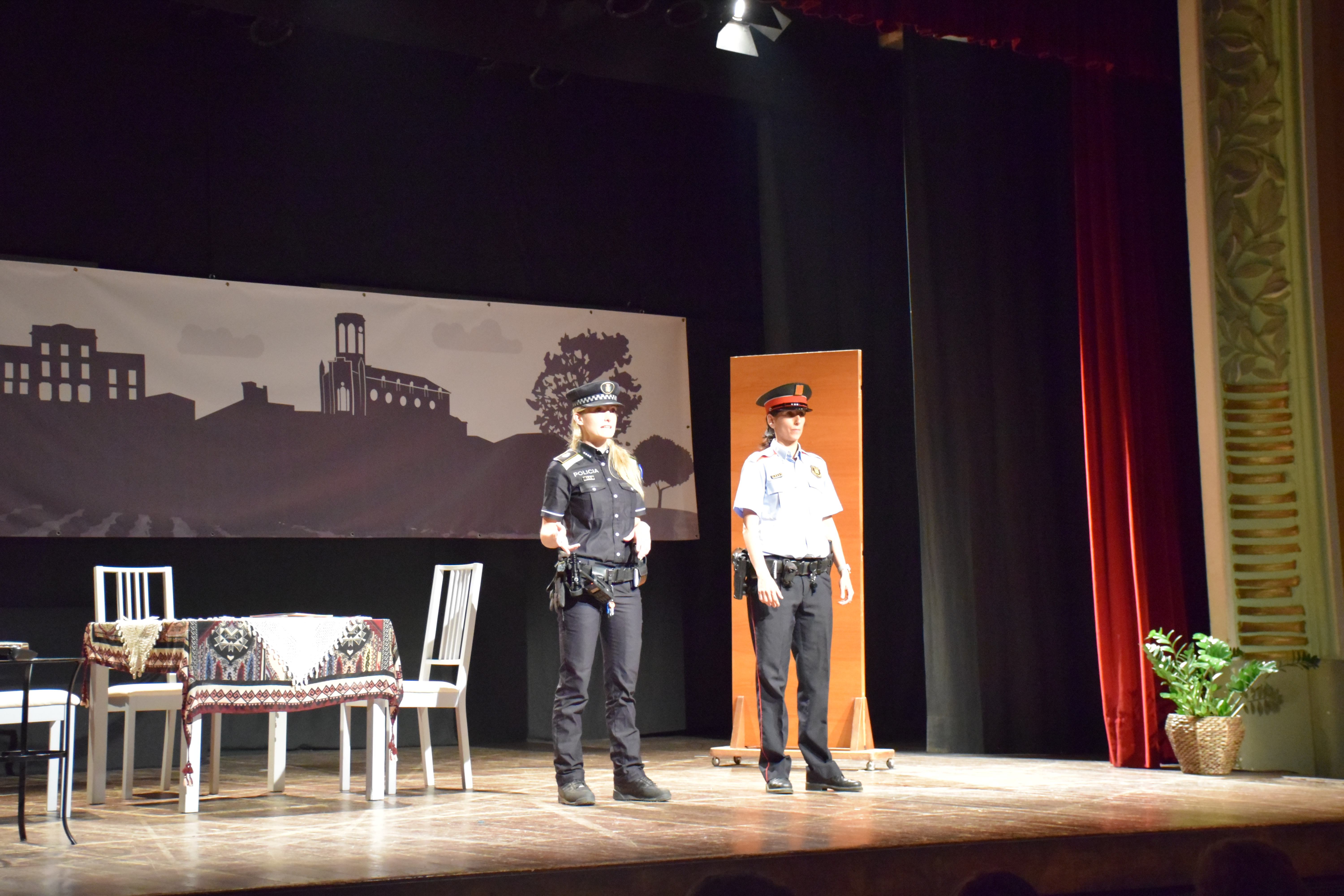 A sobre de l’escenari, vuit actors d’Els 9 Pins han interpretat les tres situacions i, quan es congelava l’escena, sortia una parella de Mossos i Policia Local per explicar quina era l’estafa que s’estava produint i, després, quina era la solució per evitar caure en elles.