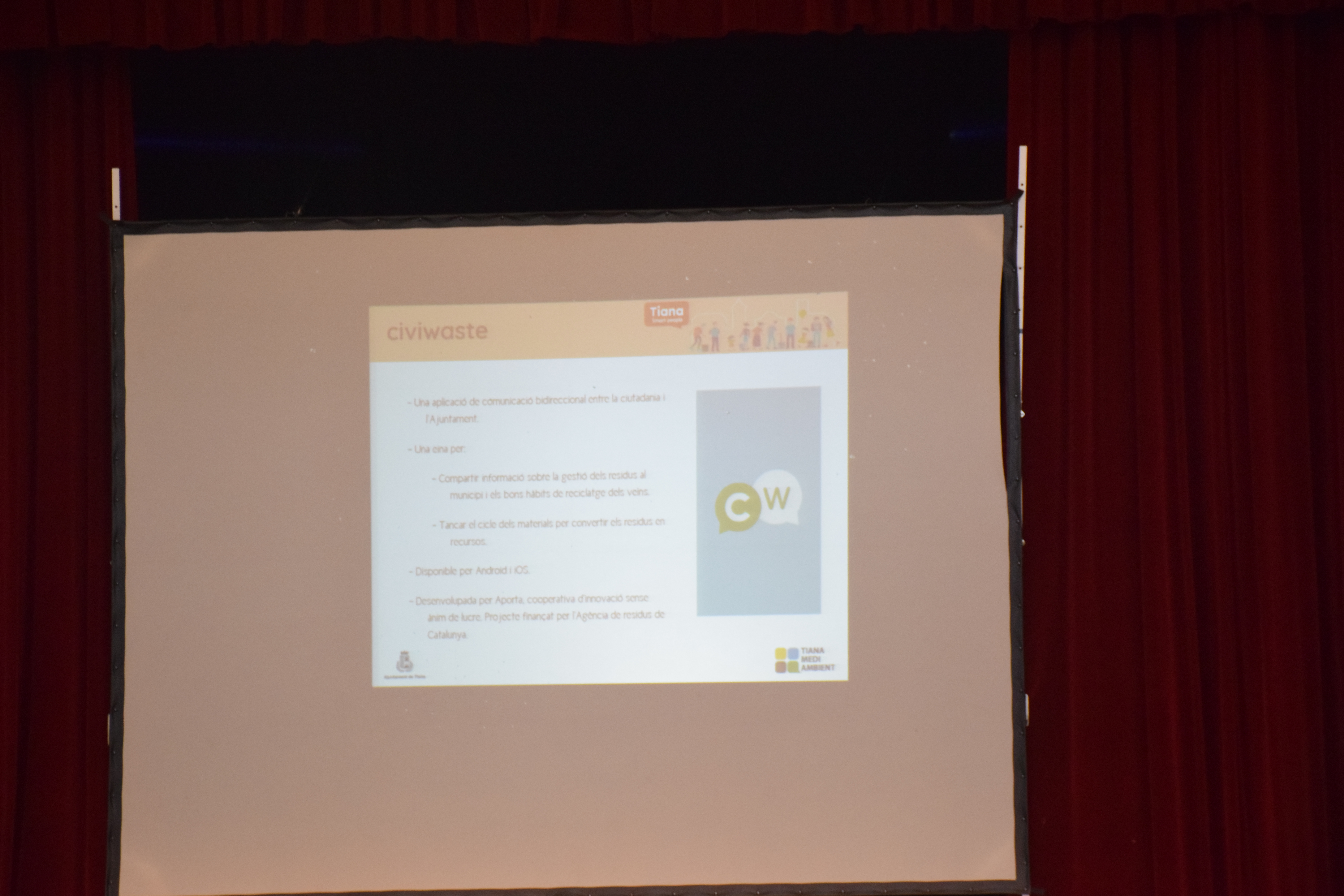 Tiana va ser pionera en implantar el porta a porta. És per això que 18 anys després, han volgut seguir innovant. Durant la ponència dels tècnics de l’Ajuntament de Tiana, l’Olga Llobet i en Toni Tubau, han presentat l’aplicació Civiwaste, una app mòbil per facilitar la comunicació entre la ciutadana i l’Ajuntament en matèria de gestió de residus.