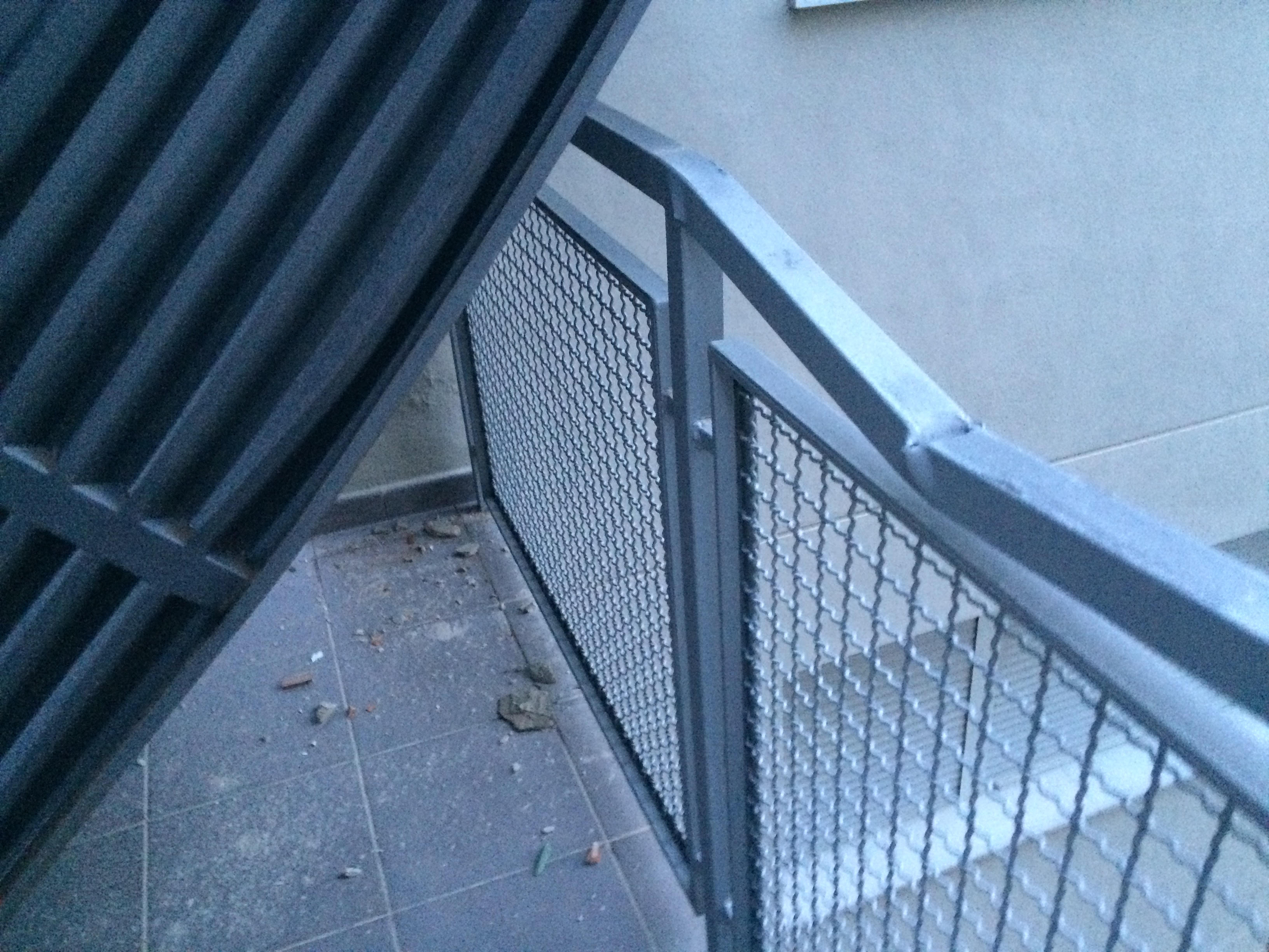 Si això ja és greu, afirmen, encara ho és més el fet que la gegantesca tapa encara està allà. Visorén, l’empresa encarregada del manteniment dels pisos, s’ha militat a lligar-la amb un cordill a la barana del passadís on va caure. En Sergi Cots és un dels diversos veïns de l’escala que ha comunicat el fet a Visorén però la tapa ja fa dues setmanes que va caure i encara és allà: