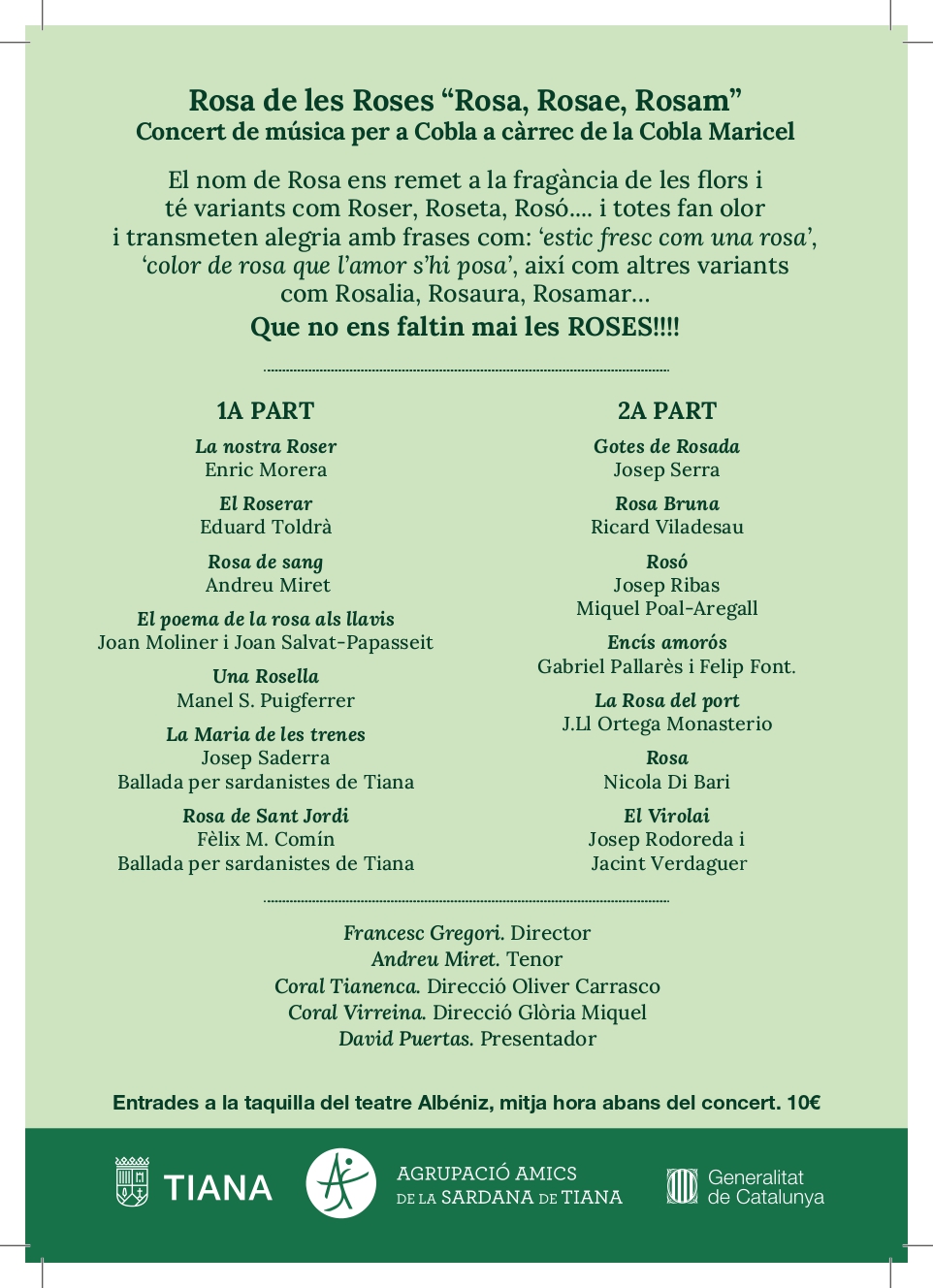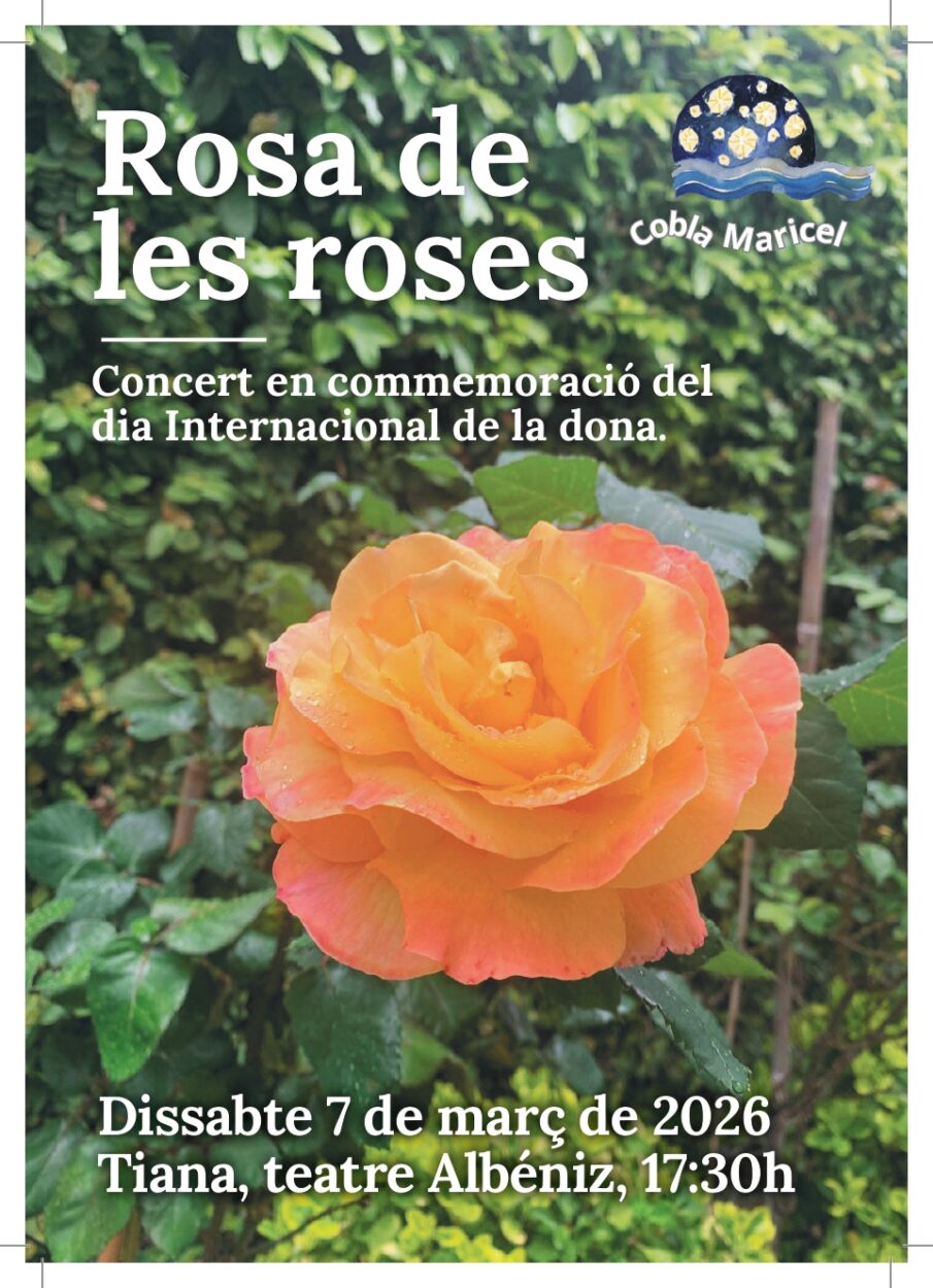 El concert, titulat “Rosa de les roses”, comptarà amb un repertori interpretat per la Cobla Maricel, el Coro de Tiana i la Coral Veus de la Virreina: