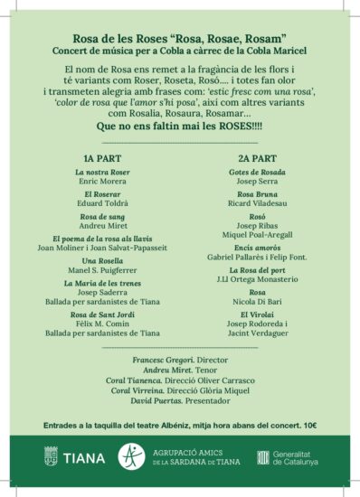 A més, els sardanistes de Tiana ballaran dues de les peces que s’interpretaran, Maria de les trenes i Rosa de Sant Jordi: