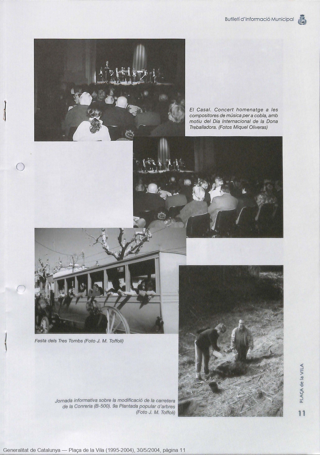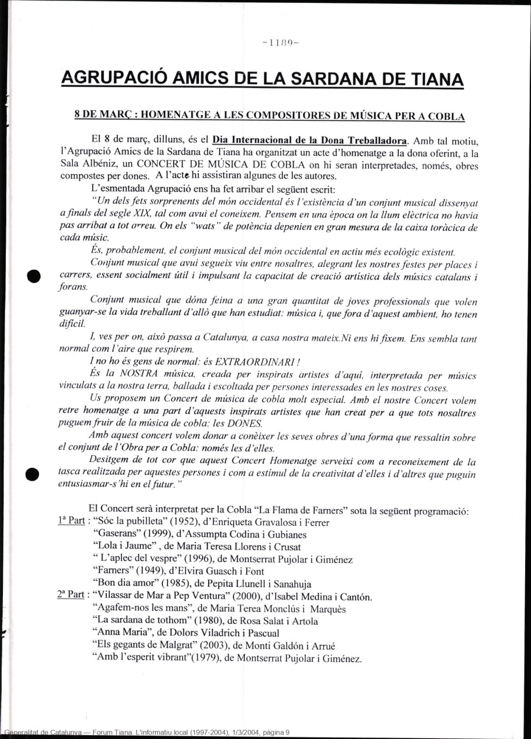 “Desitgem de tot cor que aquest Concert Homenatge serveixi com a reconeixement de la tasca realitzada per aquestes persones i com a estímul de la creativitat d’elles i d’altres que puguin entusiasmar-s’hi en el futur”, recollia l’escrit que l’Agrupació va fer arribar a l’informatiu Forum Tiana per anunciar aquest primer concert. Més endavant, la crònica de la mateixa revista sobre l’acte detalla que el concert, interpretat per la cobla La Flama de Farners, va comptar amb la presència de la majora d’autores, que “varen ser obsequiades amb rams de flors i forts aplaudiments”. En el butlletí Plaça de la Vila del maig del 2004 es poden veure un parell de fotografies d’aquell acte.