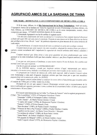 Els concerts organitzats per l’Agrupació d’Amics de la Sardana de Tiana en commemoració del Dia de la Dona ja s’han convertit en una tradició d’aquesta jornada reivindicativa al municipi. Tal com recorda la Leles, tot va començar l’any 2004, amb el primer concert dedicat a les dones compositores dins del món de la sardana: