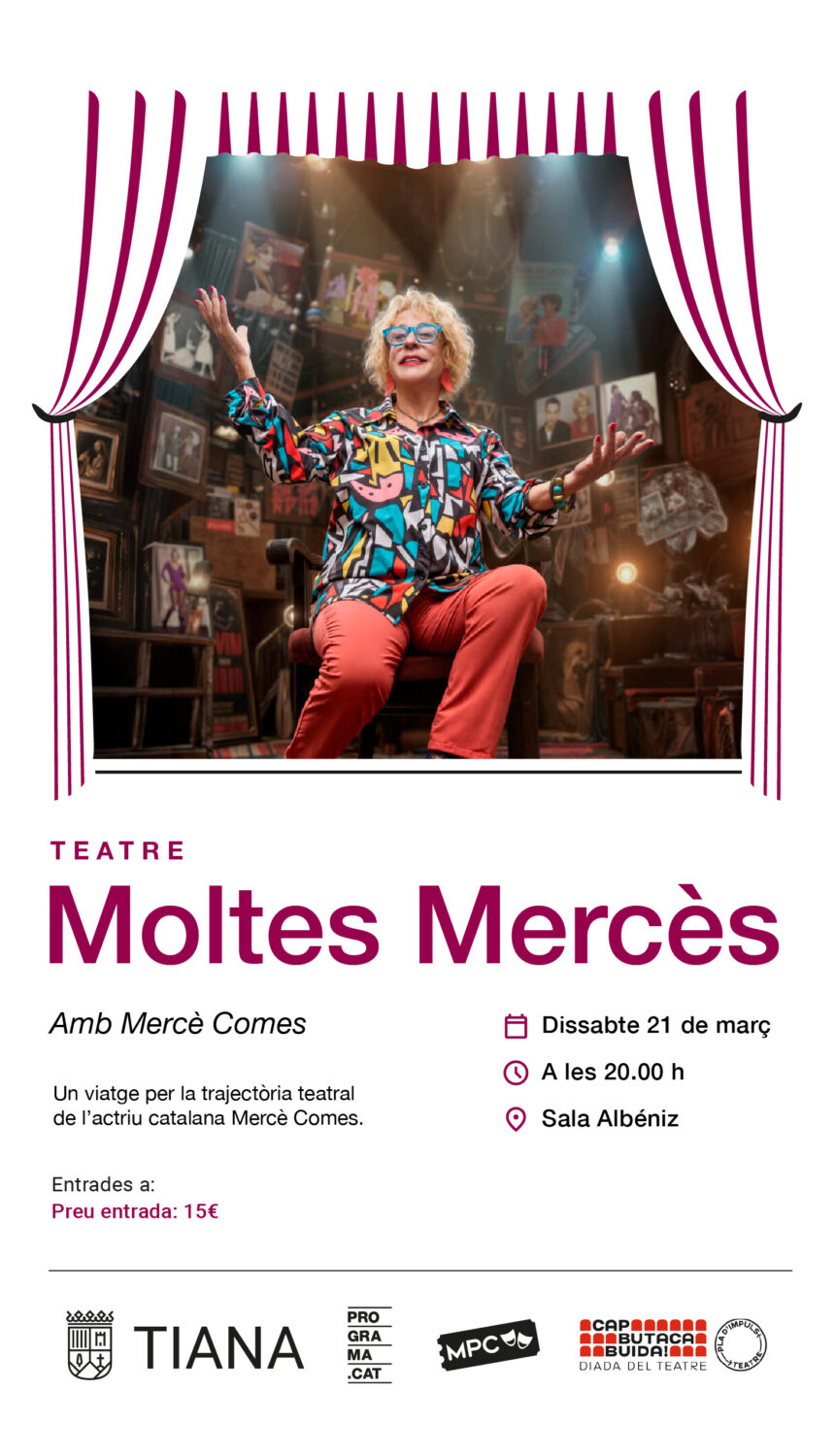 Aquest 2026, la Diada del Teatre tindrà lloc el dissabte 21 de març i Tiana hi participarà amb el monòleg de Mercè Comes “Moltes Mercès”, un viatge per la trajectòria teatral de l’actriu catalana. Les entrades es poden aconseguir a través de la plataforma de l’Ajuntament de Tiana per un preu de quinze euros.