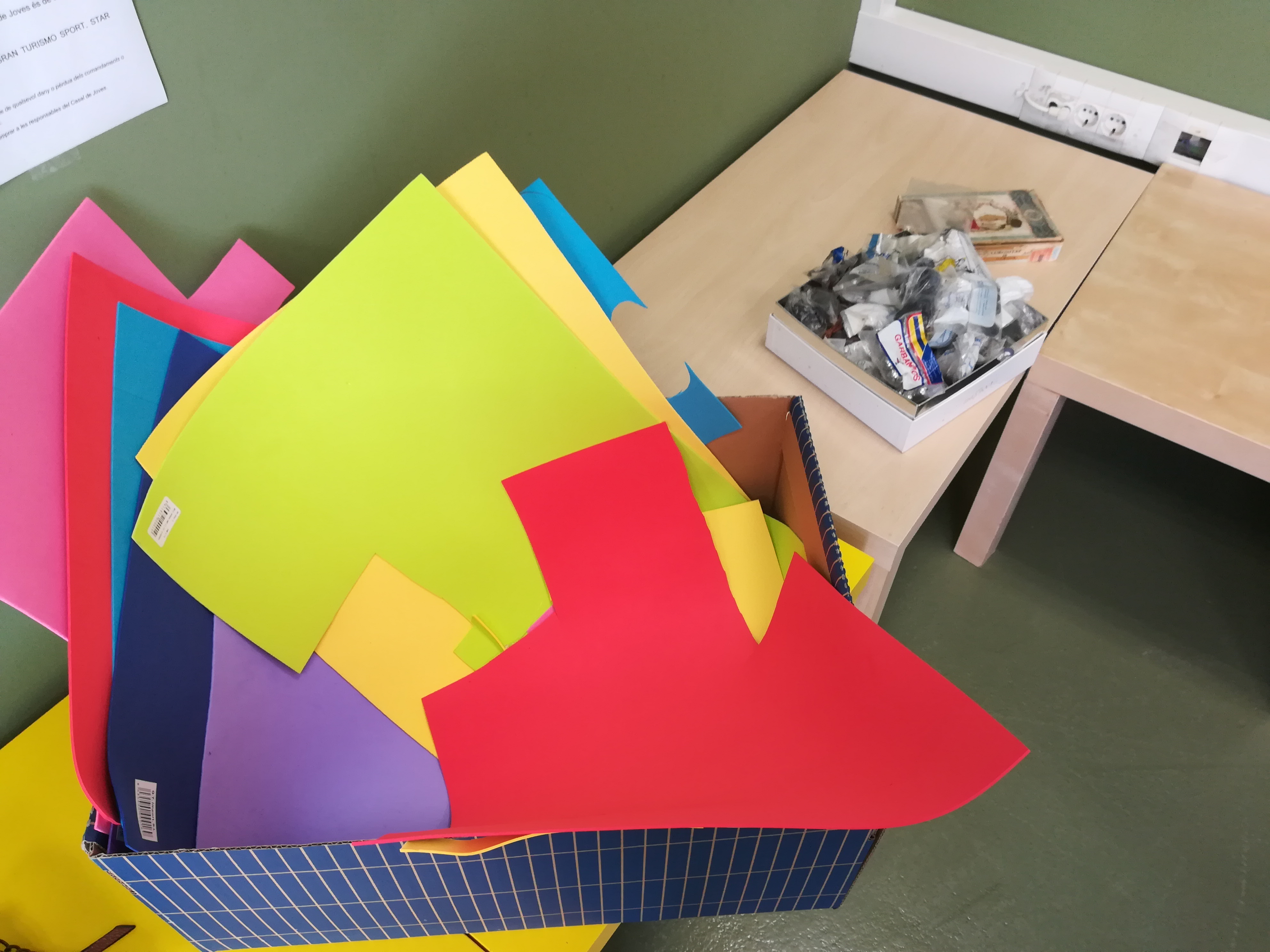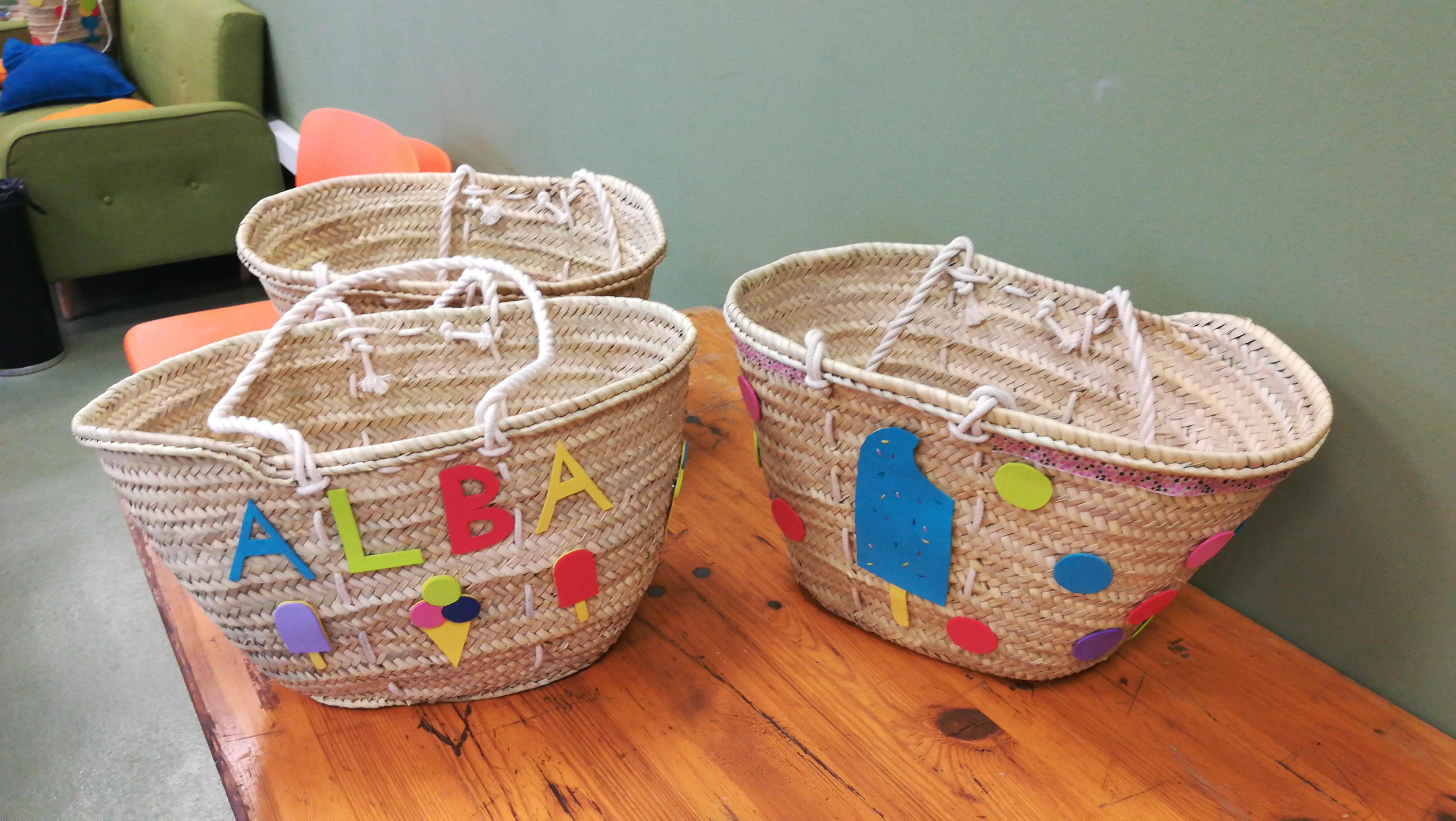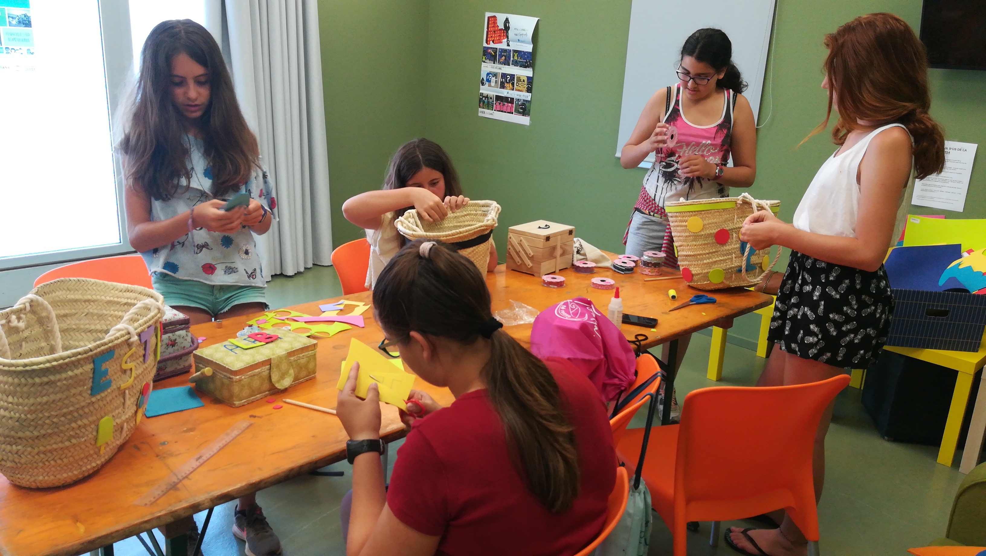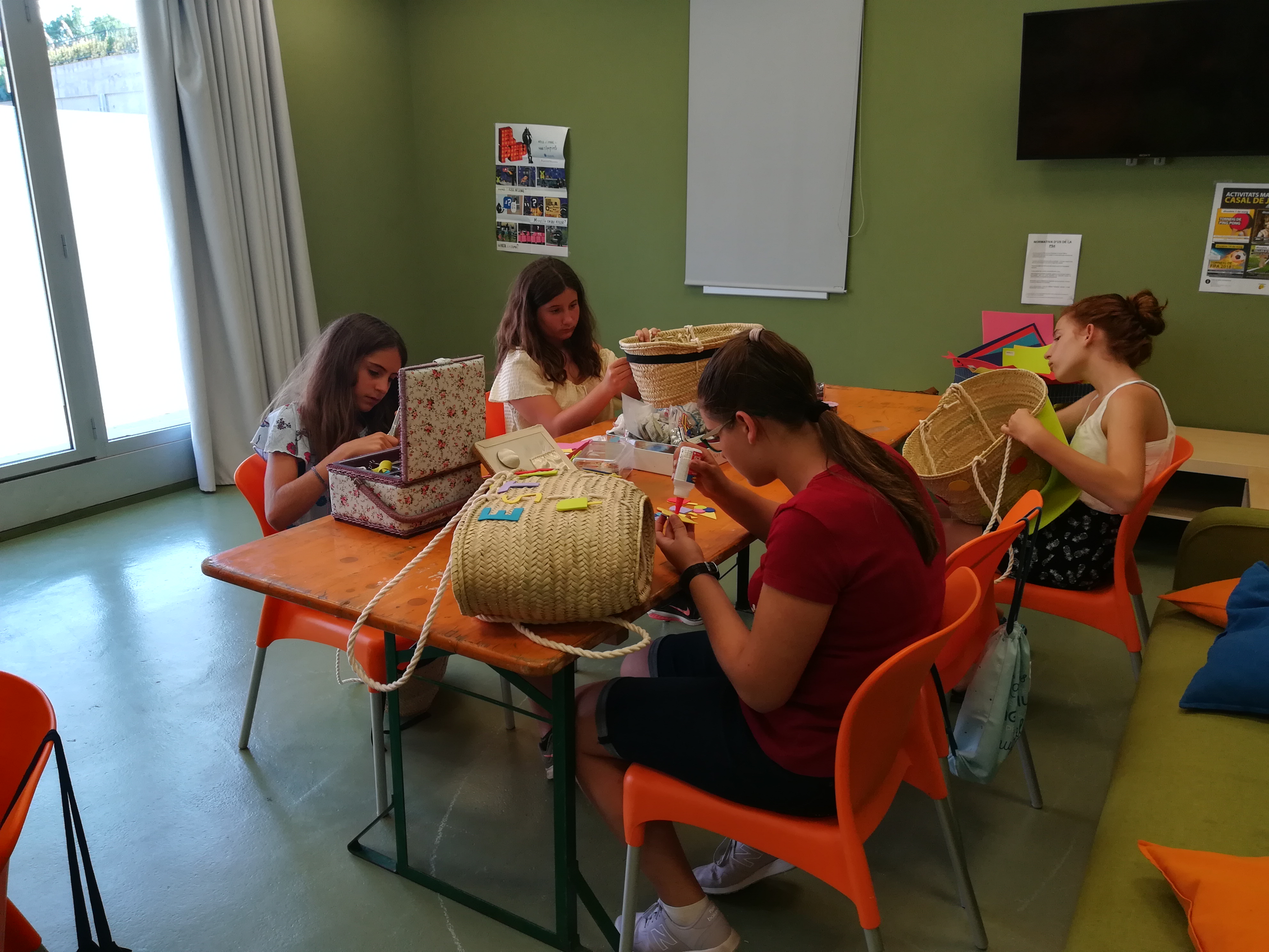 Aquest dijous era la segona sessió i tocava acabar les bosses que havien començat a decorar la setmana passada. Durant dues hores i mitja, les noies que s’han inscrit a l’activitat han anat acabant les seves decoracions fetes amb cintes, roba, botons o cartolines d’escuma. Elles mateixes ens expliquen com ho han fet:
