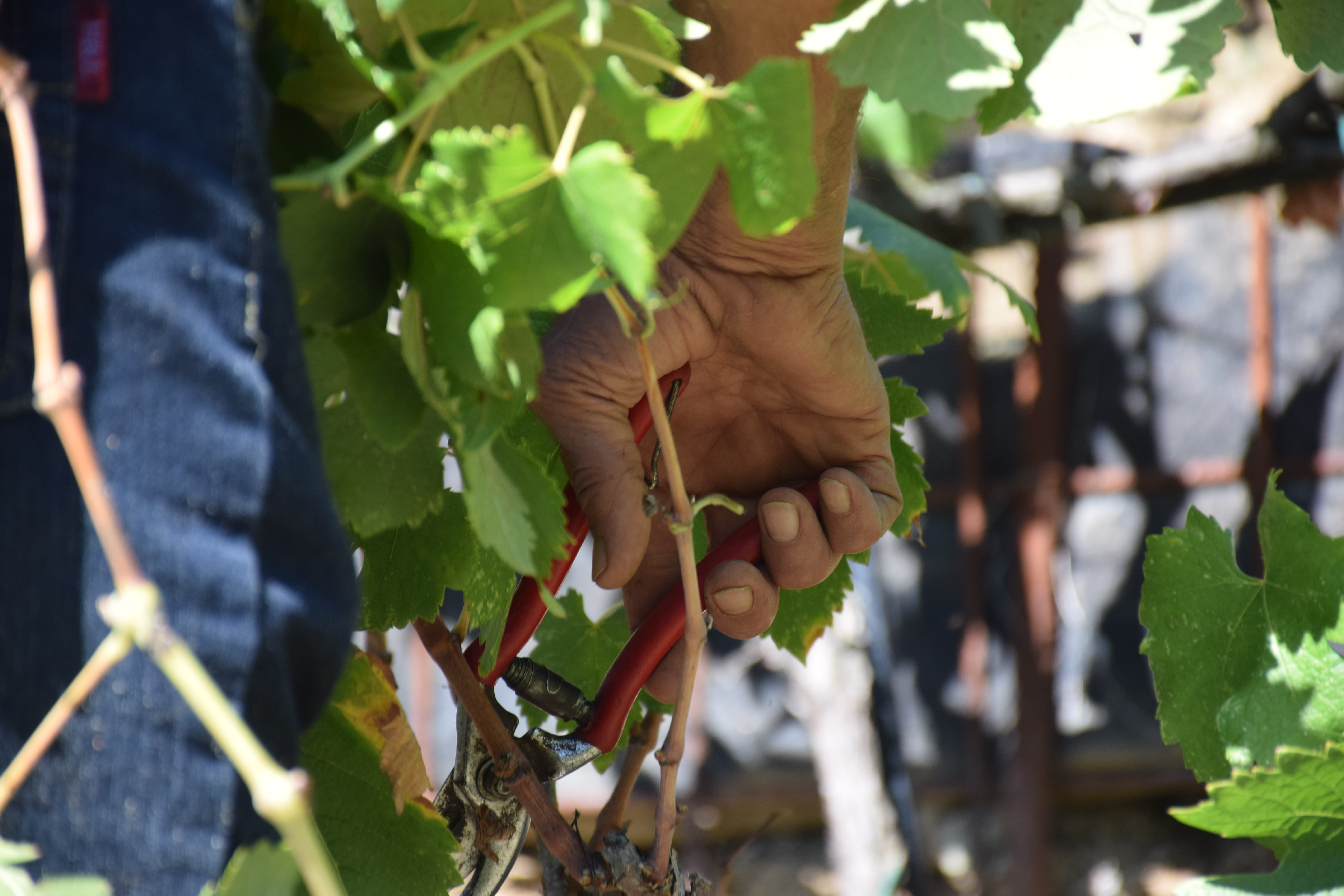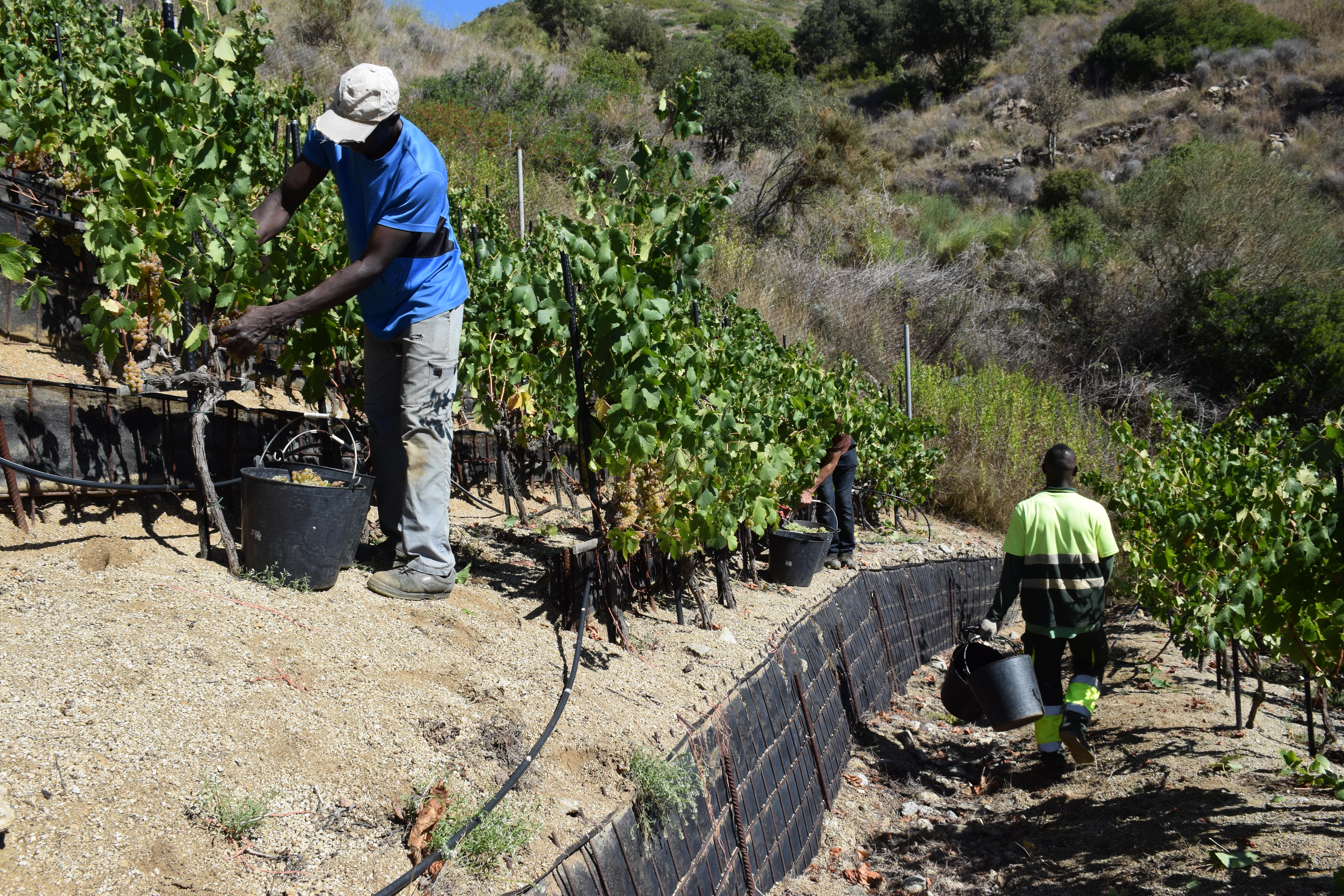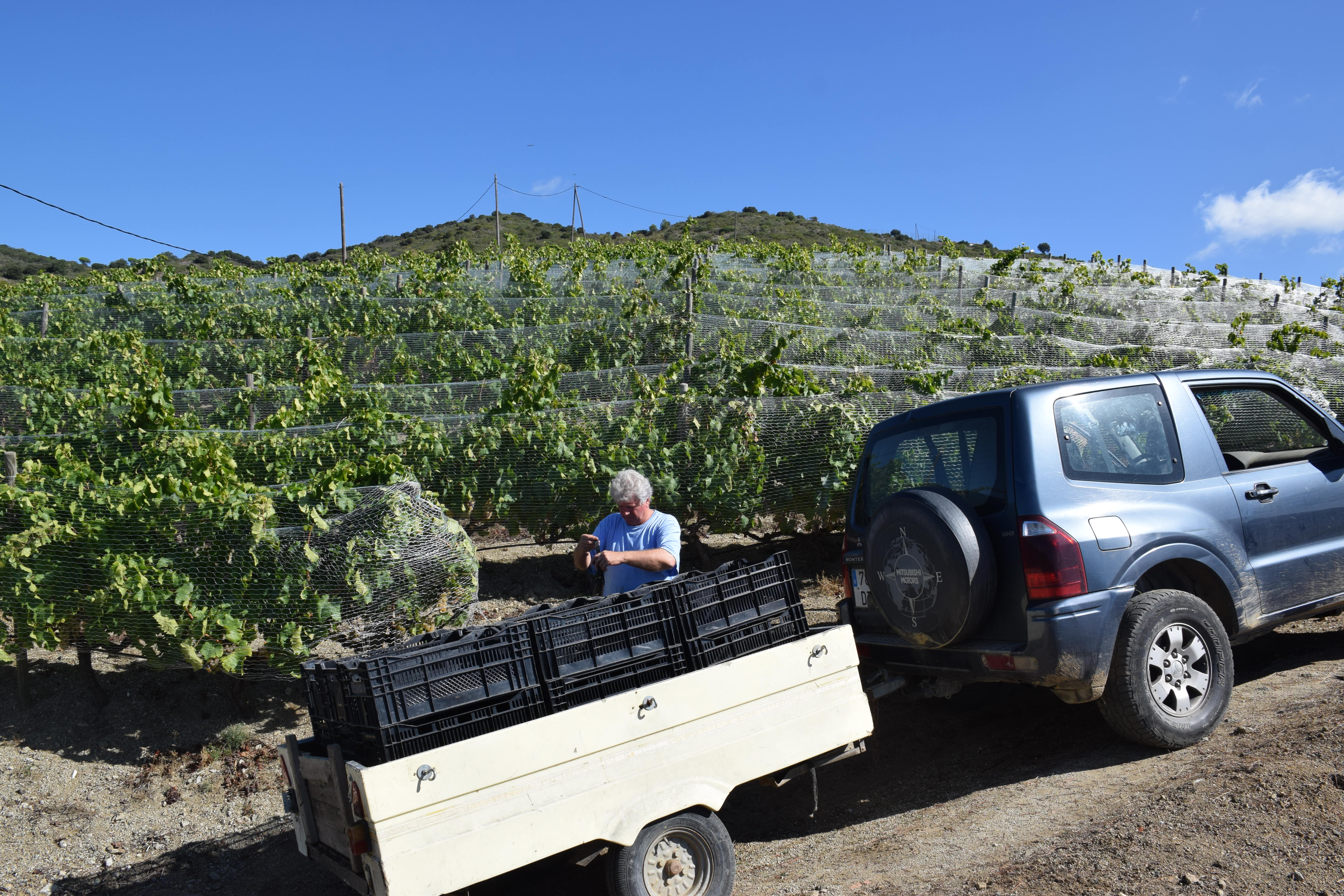 Les vinyes de Quim Batlle es troben en el moment de més esplendor de l’any. Els raïms que pengen de les tiges estan inflats i madurs, moment de fer per fi la verema. La collita va començar ahir i encara ha de durar 10 dies, en els quals quatre persones cullen els raïms de les tres hectàrees de plantació.